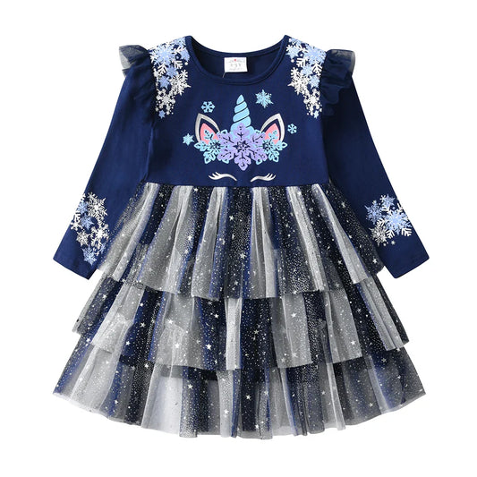 Girls Navy Unicorn Snowflake Tulle Dress (Age 3-8YRS)