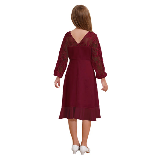 Girls Chiffon Long Sleeve High Waist Mesh Embroidery Dress (Age 8-16 YRS)