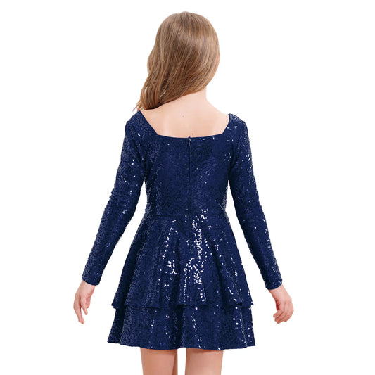 Girls Sequin Long Sleeve Double Layer Hemline Dress (Age 6-14 YRS)