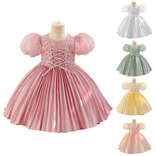 Baby Girls Princess Puff Sleeves Satin Faux Pearls Pleated Tulle Dress (9M-5YRS)