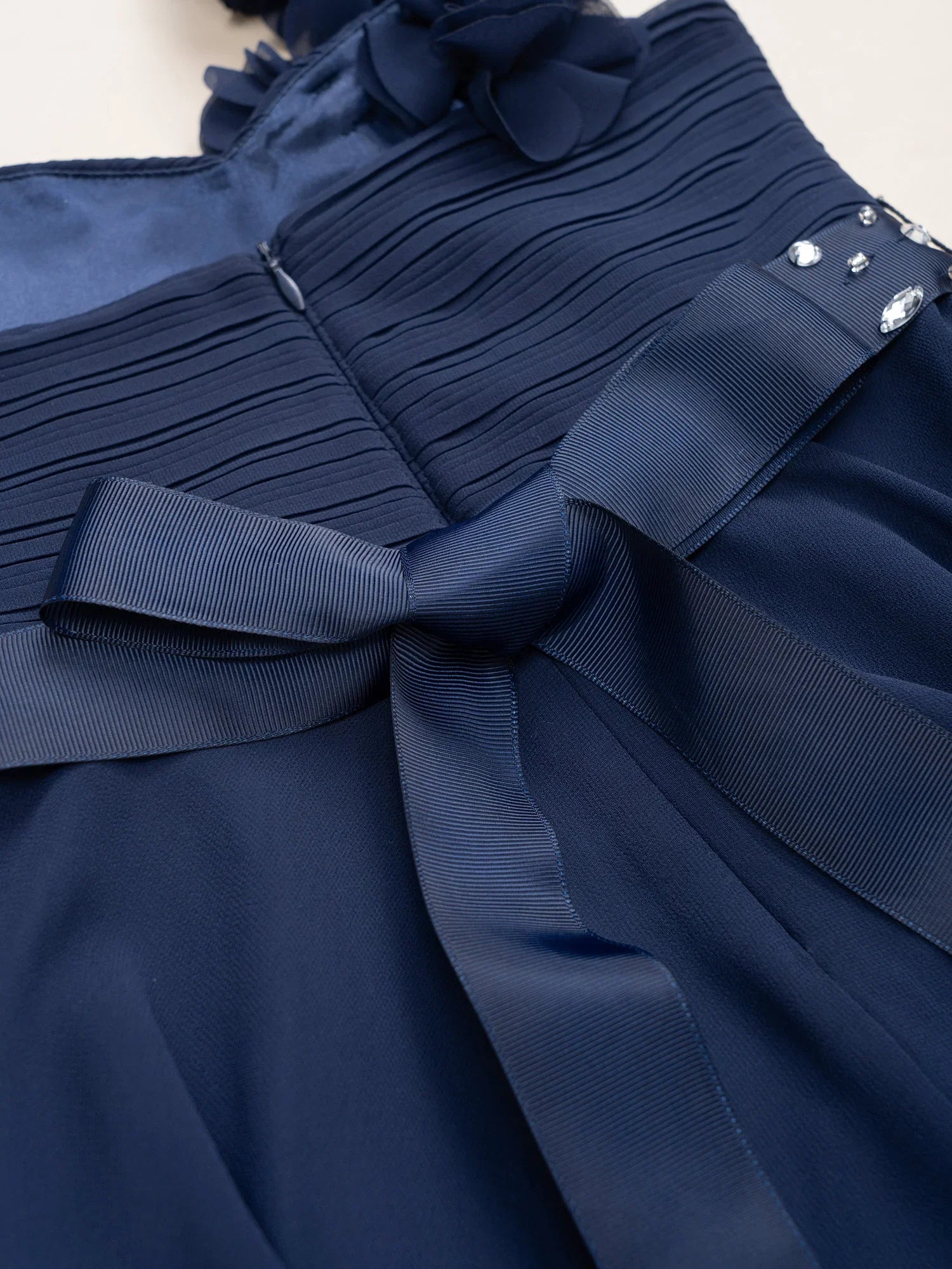 Features a one-shoulder strap adorned with a 3D applique, a ruched design bodice, a high-low hem, and a detachable rhinestone sash.