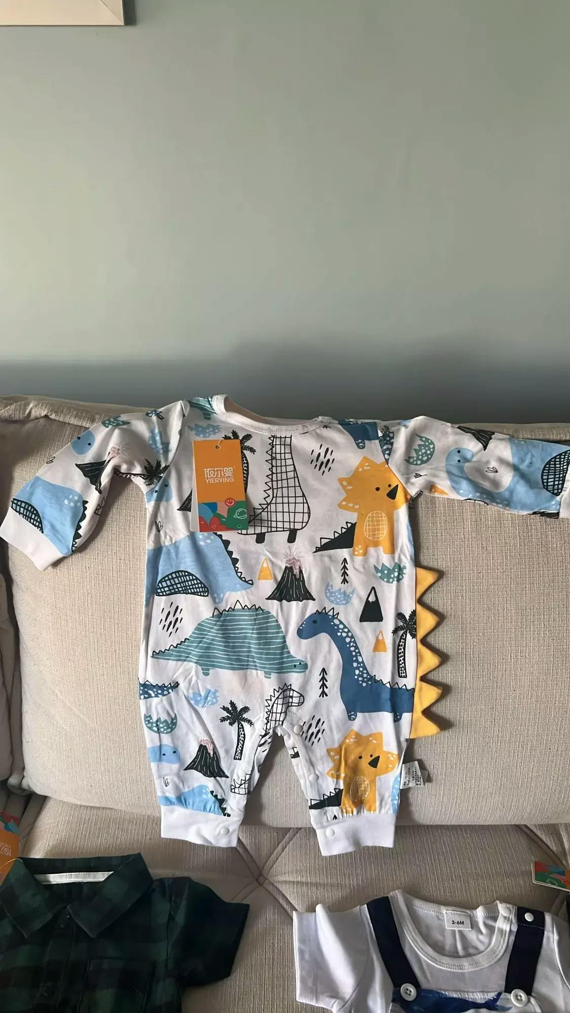 Unleash your little one's wild side with our Baby Dinosaur Jumpsuit Grow! In a playful combination of baby blue and yellow, this jumpsuit is perfect for your newborn to 12-month-old. Keep them comfy and cute in this unique and quirky outfit. Roar!