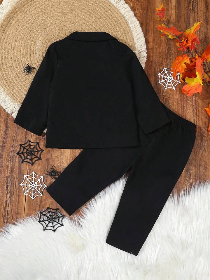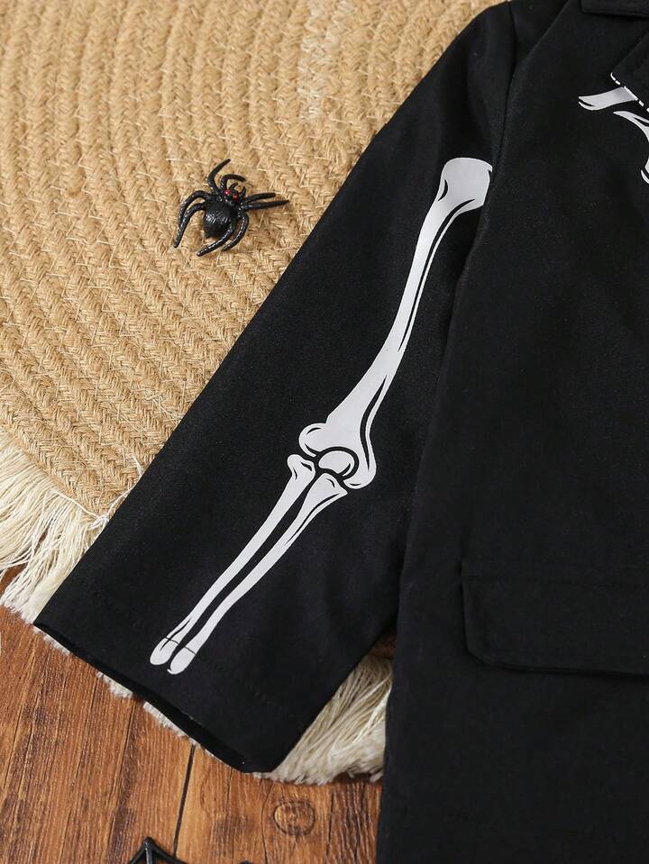 The set includes a long-sleeve blazer and elastic-waist pants, both printed with skeletal details that light up the night. No shirt or bow tie is included, allowing for easy layering with your own spooky accessories.