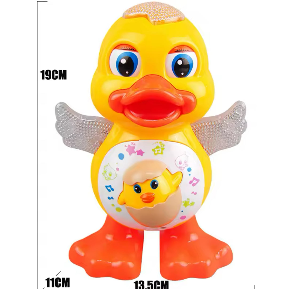 The Dancing Musical Walking Robot Duck is made of premium materials, ensuring a high-quality and environmentally-friendly product that is safe and harmless to use. With its lively demeanor, the duck enjoys dancing and singing, with blinking eyes and a moving mouth. Upon turning on the switch, the adorable yellow duck dances to accompanying music, swaying from side to side in a unique and rhythmic manner. This toy is a great source of entertainment for children and is a valuable addition to your collection. It is also suitable for both genders and is made from plastic. Please note that 3 AA batteries are required but not included. The product size is 19*14*11cm and comes packaged in a color box with a size of 10.5*10.5*19cm. Packaging includes 1 Electric Dancing Duck, making it a great gift choice.