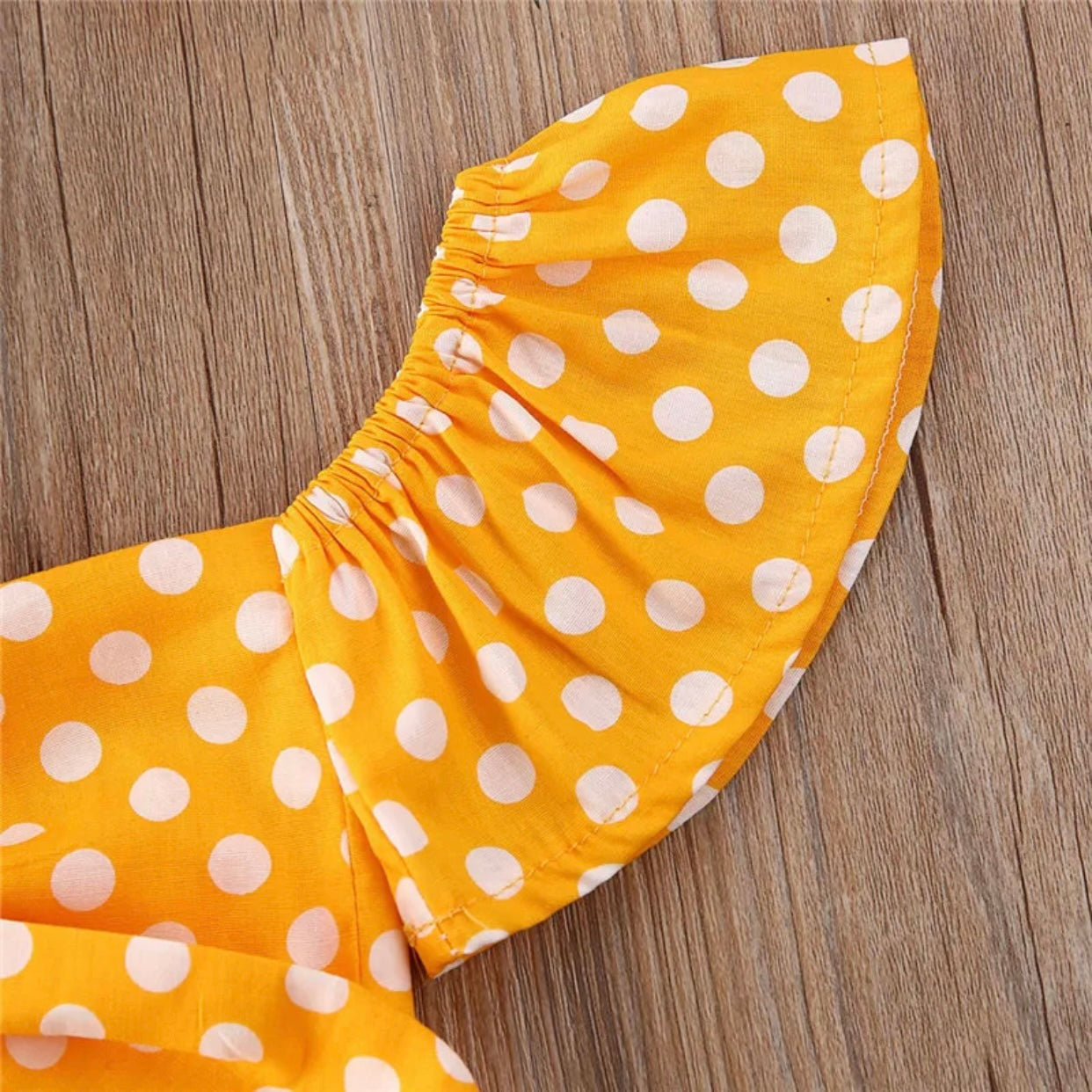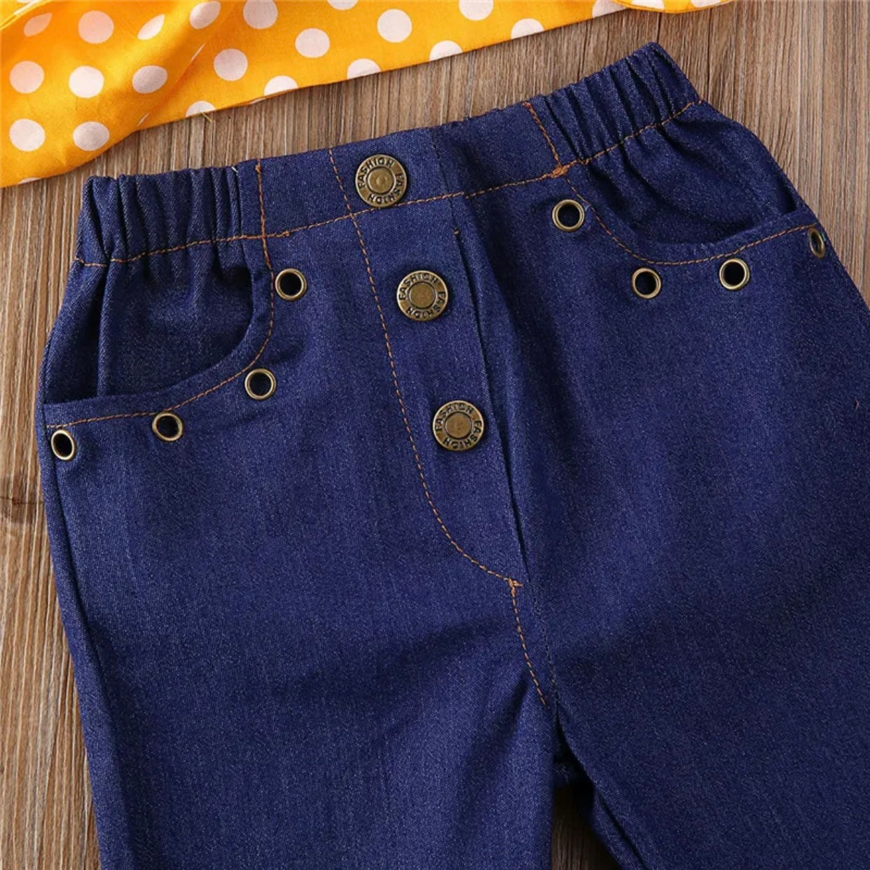 This playful set features a yellow polka dot top and blue denim bell bottom pants, perfect for your little fashionista. Made with cotton blend and denim, it provides comfort and style. The off-shoulder neckline adds an extra touch of cuteness. For ages 24 months to 5 years. (Can we say cuteness overload?)