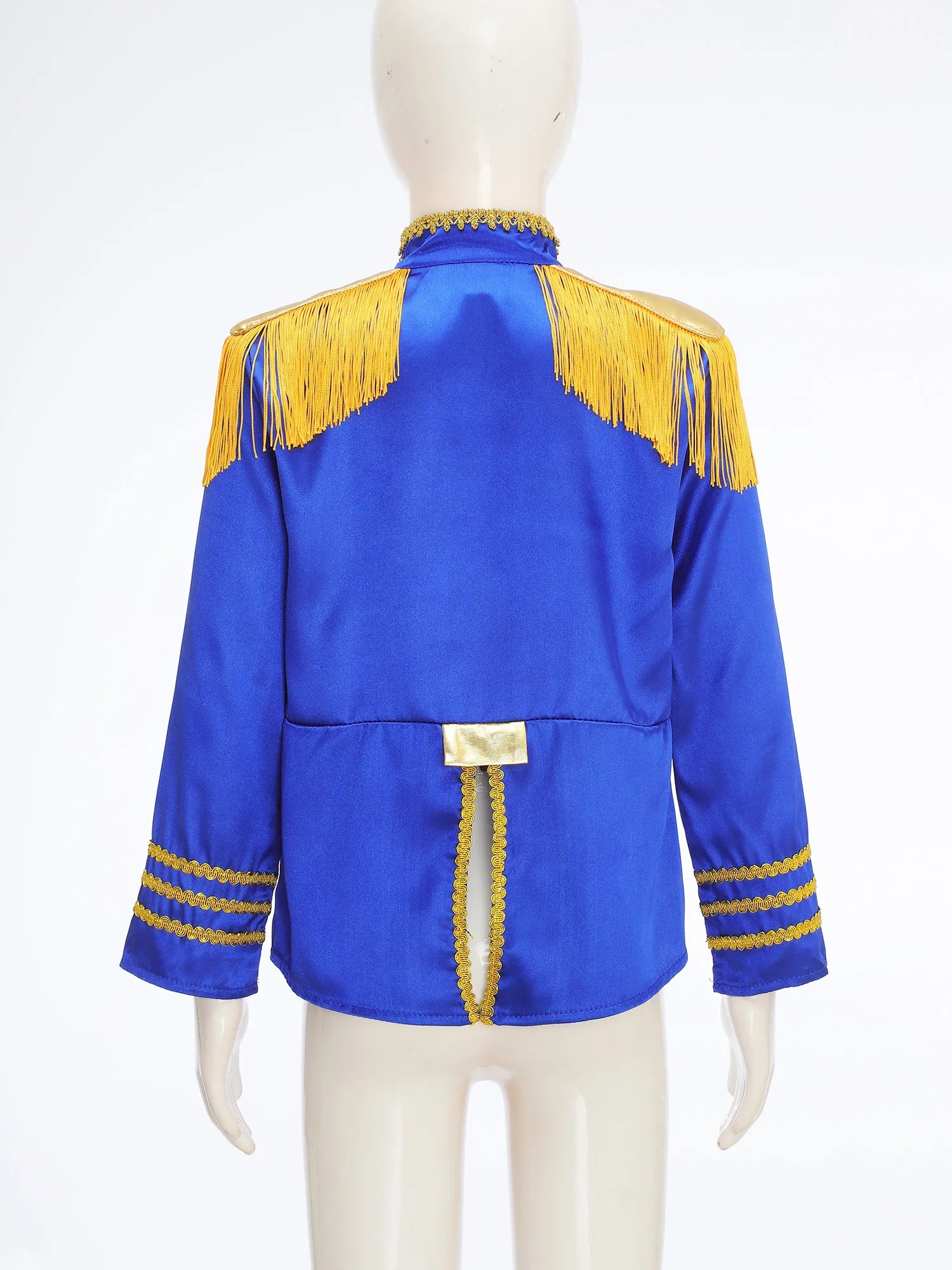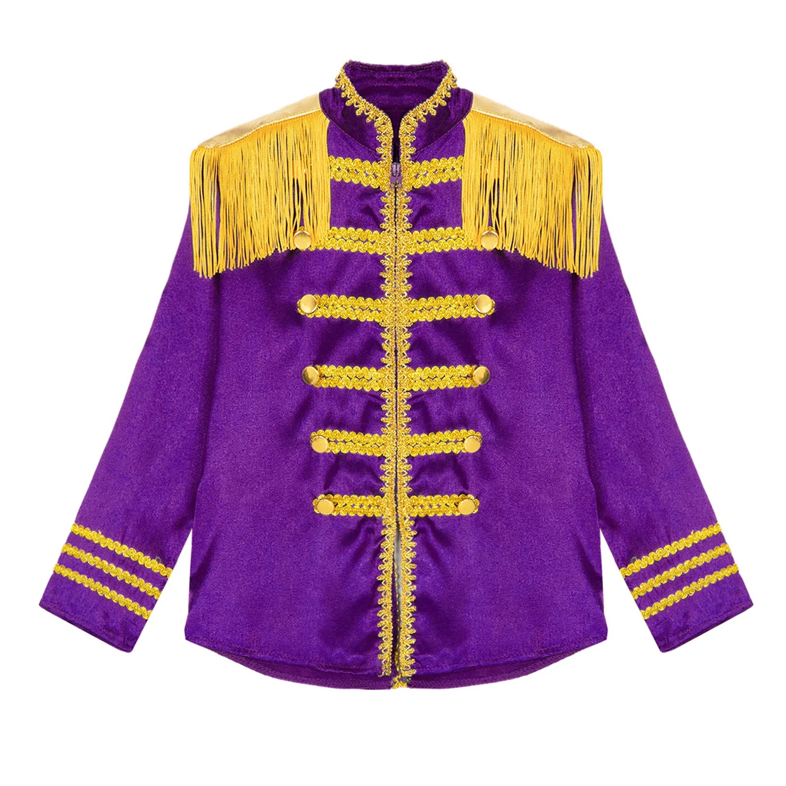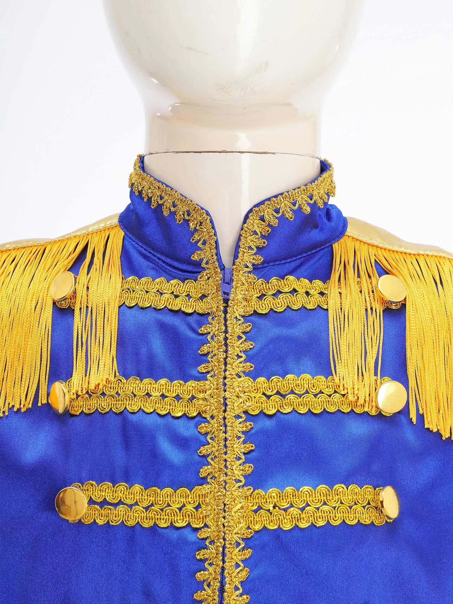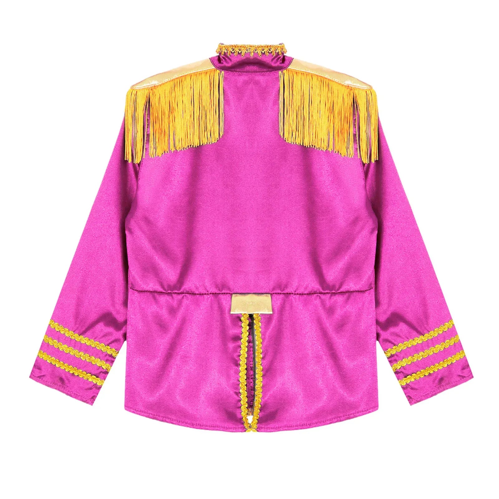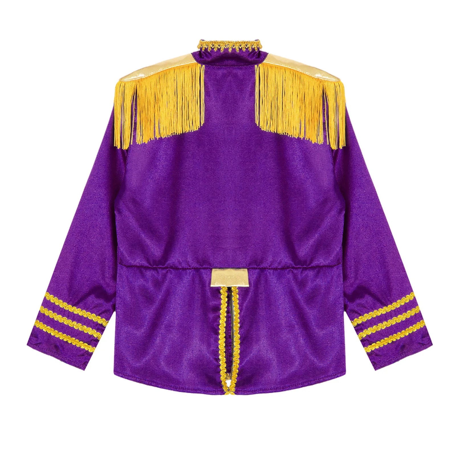 This polyester fabric costume is made for children (6-16 years old) and is soft, smooth, and skin-friendly, providing a comfortable and breathable fit. Perfect for dressing up as a pop-star rock band musician from the 1960s, this costume features a mock neck, long sleeves, a fringe tassel epaulet, and a hassle-free front zipper closure. The solid color shirt top has a split design at the front and back bottoms, complete with glossy gold lace and buttons for a deluxe look. Ideal for Halloween, 1960s pop-star cosplay, singer role play, themed parties, and stage performances.