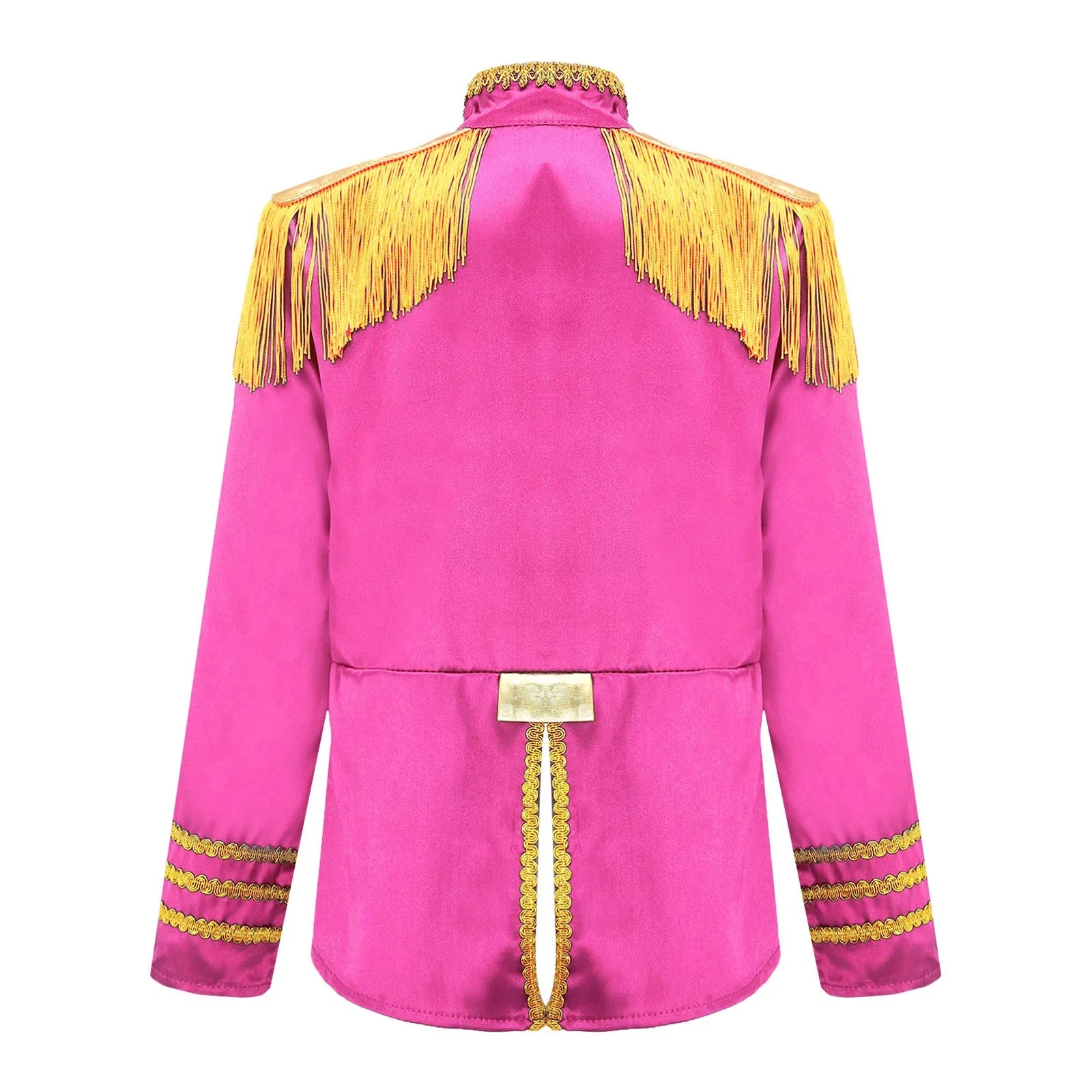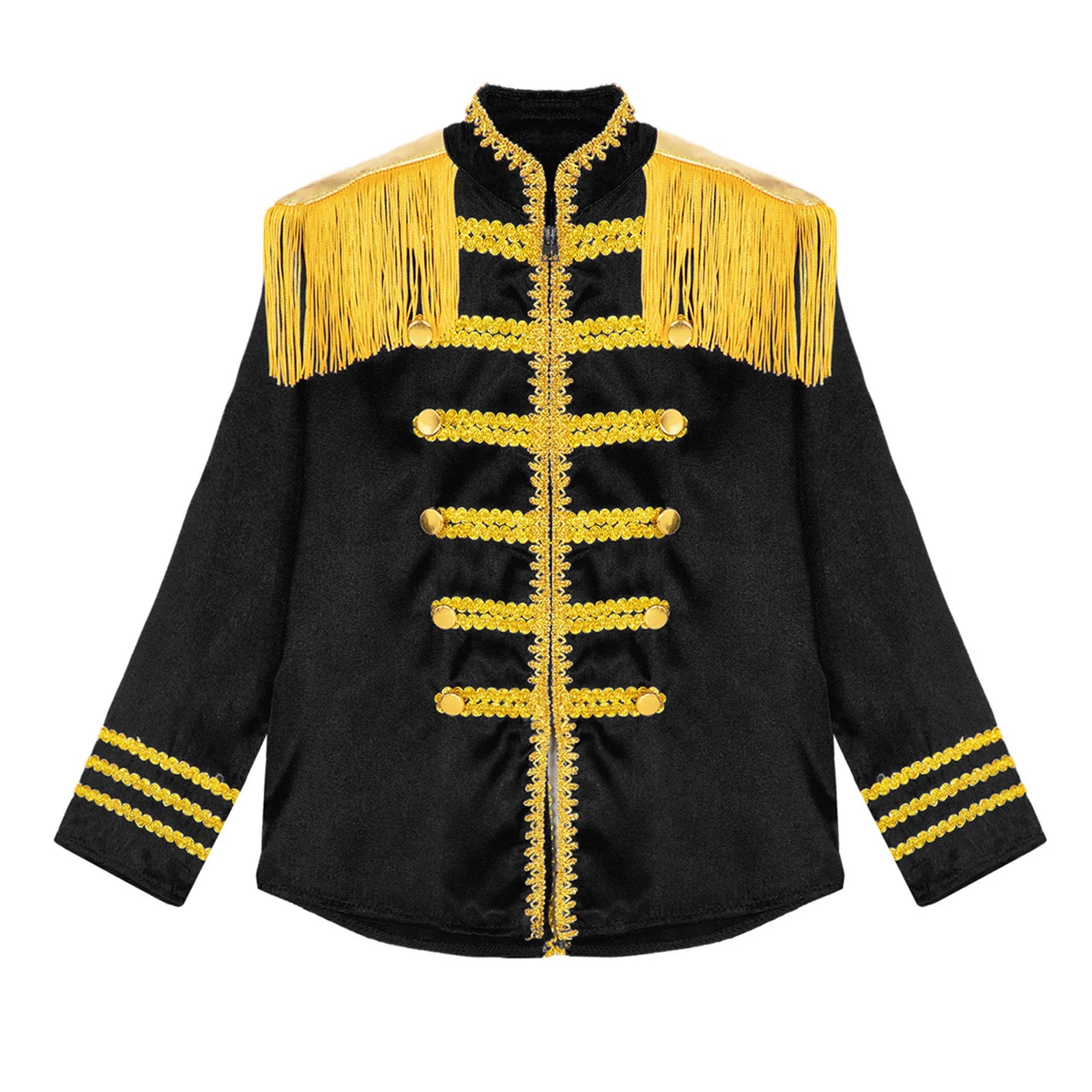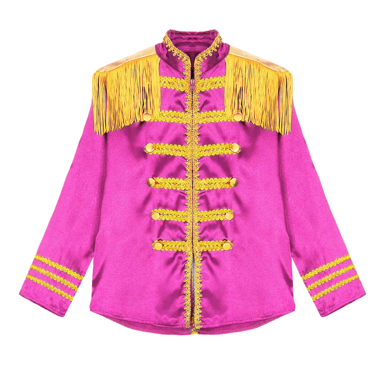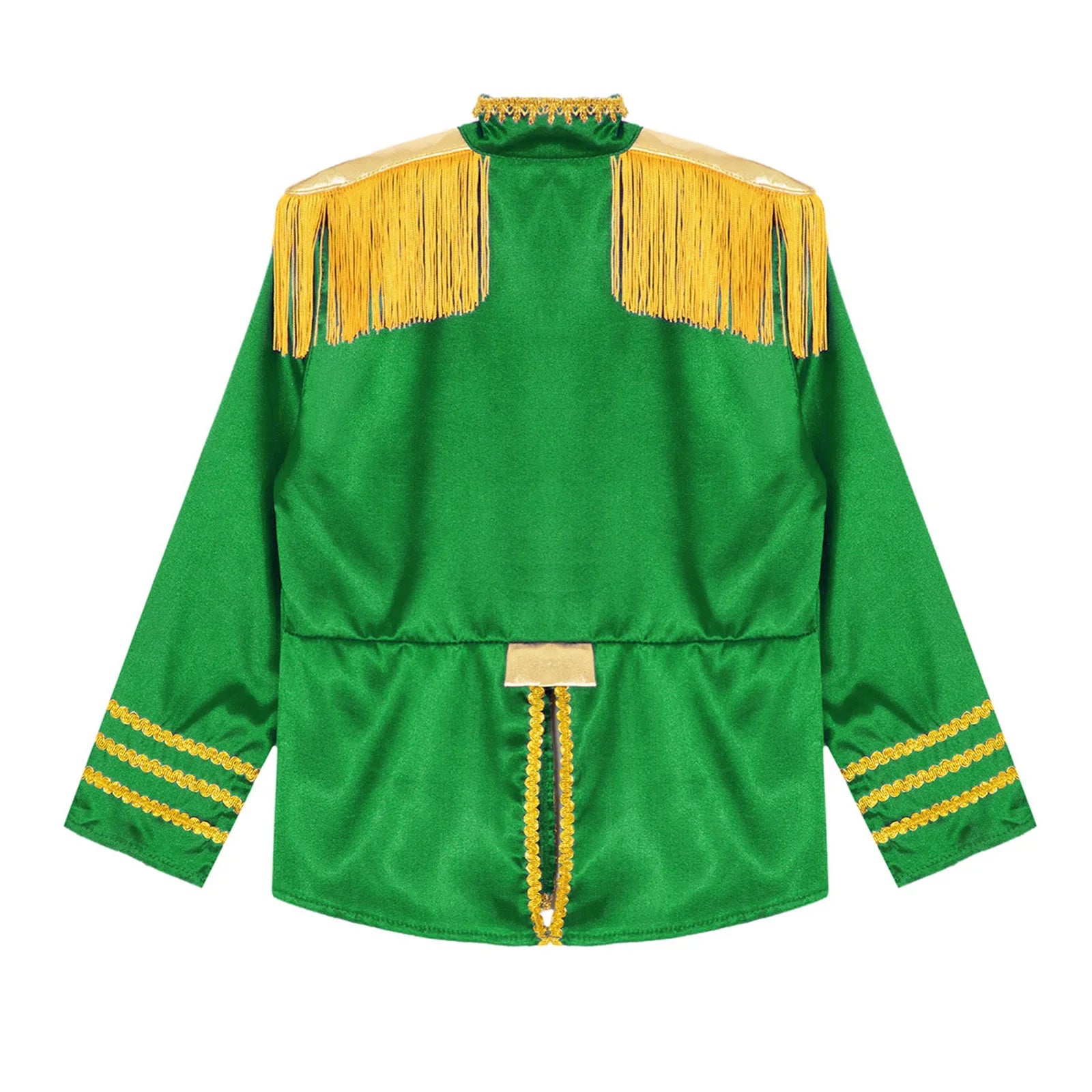 This polyester fabric costume is made for children (6-16 years old) and is soft, smooth, and skin-friendly, providing a comfortable and breathable fit. Perfect for dressing up as a pop-star rock band musician from the 1960s, this costume features a mock neck, long sleeves, a fringe tassel epaulet, and a hassle-free front zipper closure. The solid color shirt top has a split design at the front and back bottoms, complete with glossy gold lace and buttons for a deluxe look. Ideal for Halloween, 1960s pop-star cosplay, singer role play, themed parties, and stage performances.