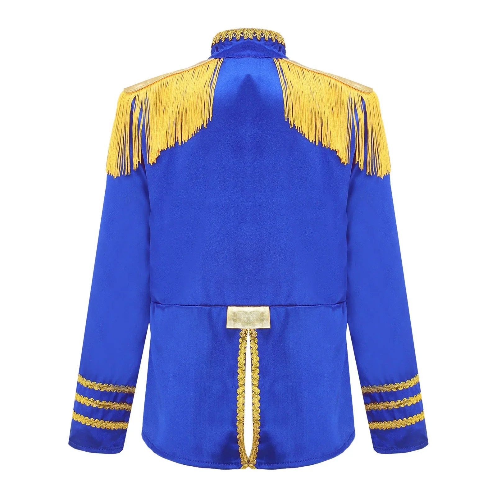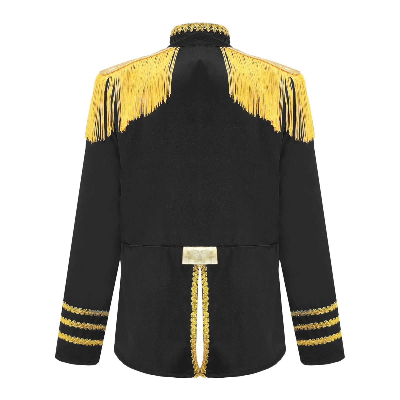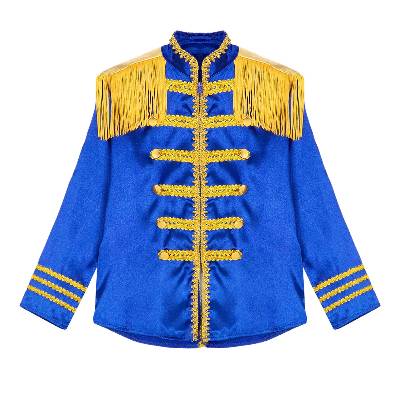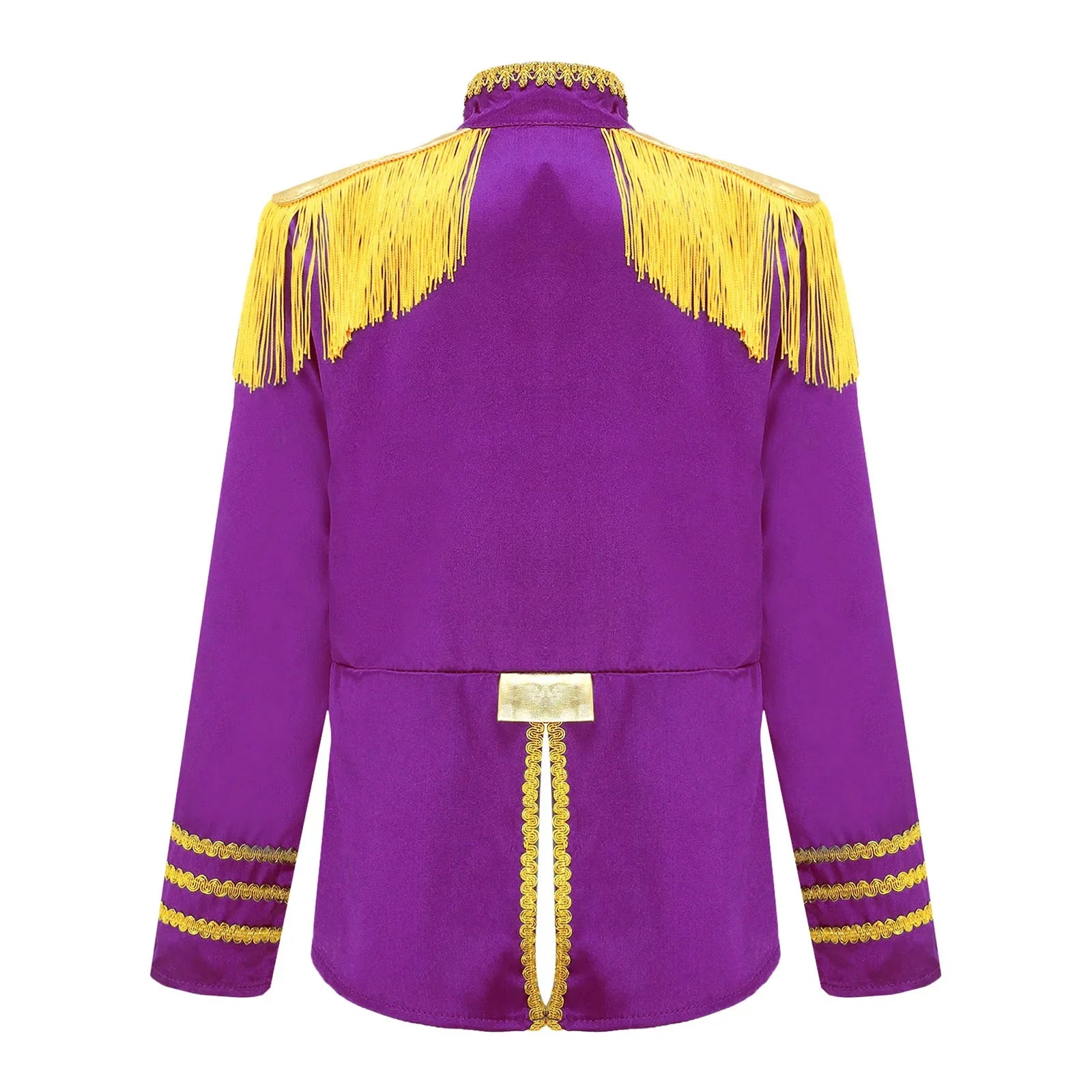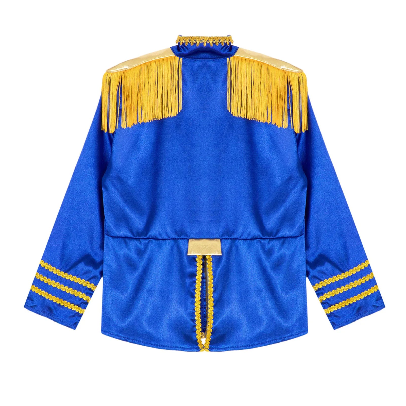 This polyester fabric costume is made for children (6-16 years old) and is soft, smooth, and skin-friendly, providing a comfortable and breathable fit. Perfect for dressing up as a pop-star rock band musician from the 1960s, this costume features a mock neck, long sleeves, a fringe tassel epaulet, and a hassle-free front zipper closure. The solid color shirt top has a split design at the front and back bottoms, complete with glossy gold lace and buttons for a deluxe look. Ideal for Halloween, 1960s pop-star cosplay, singer role play, themed parties, and stage performances.