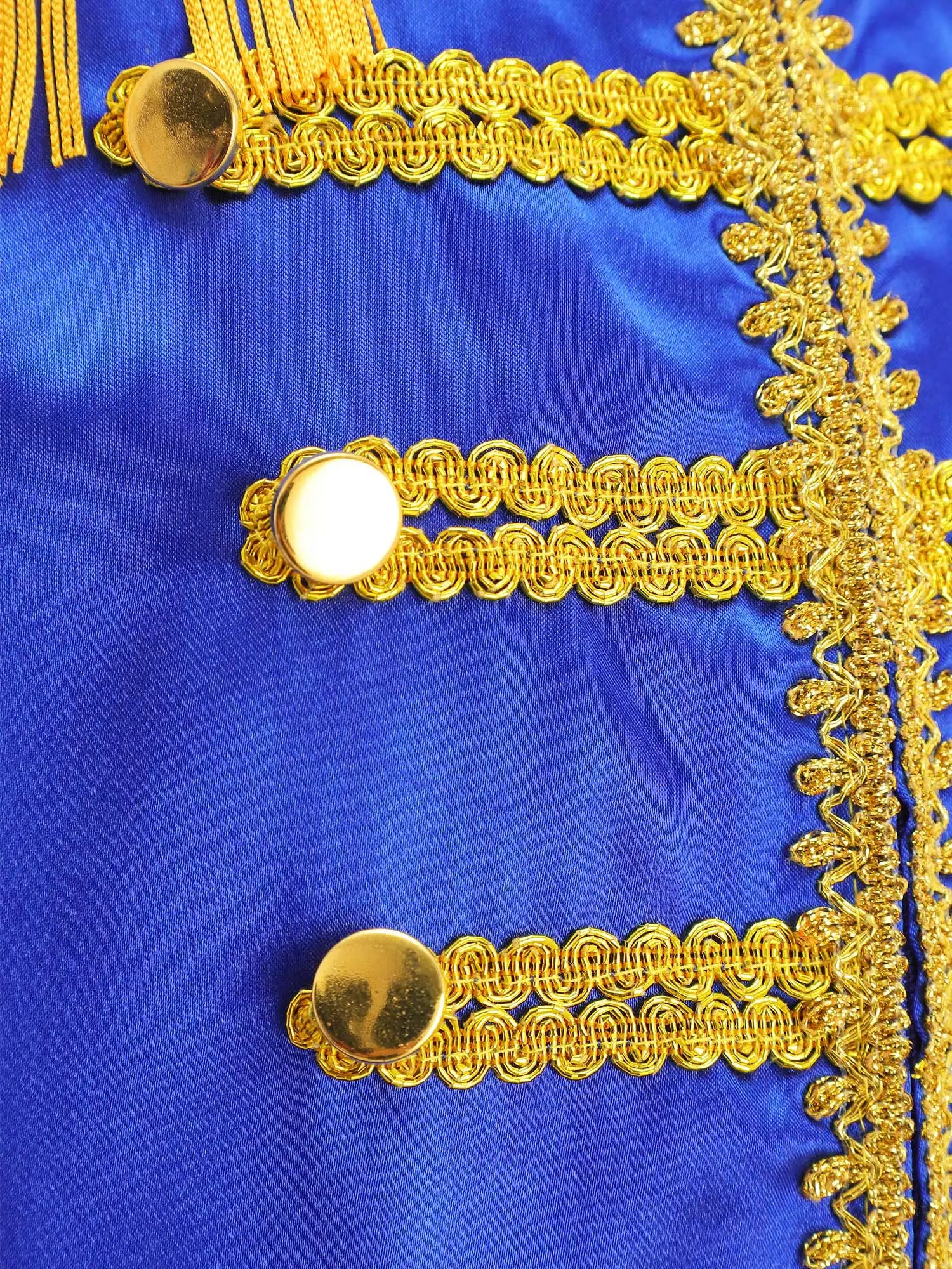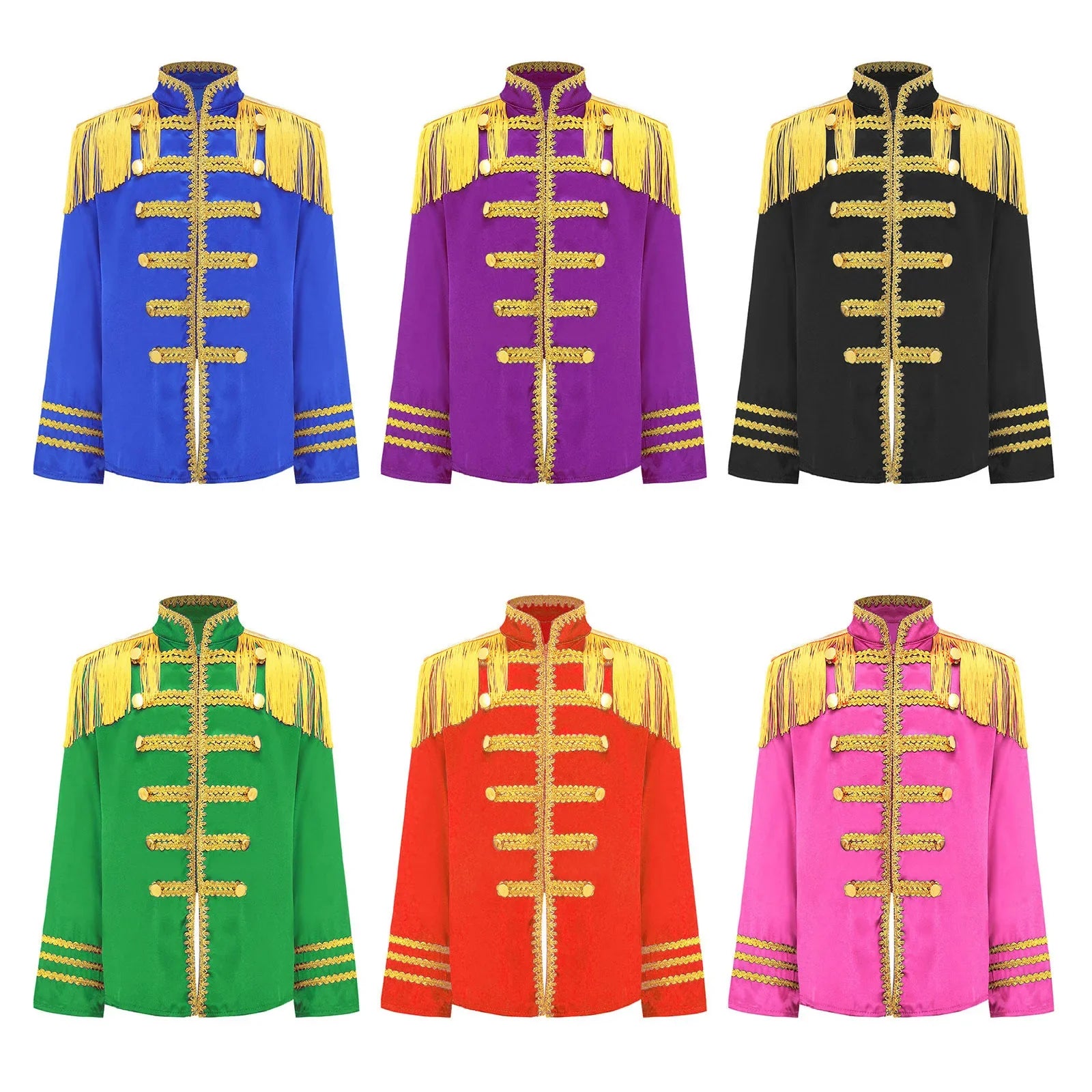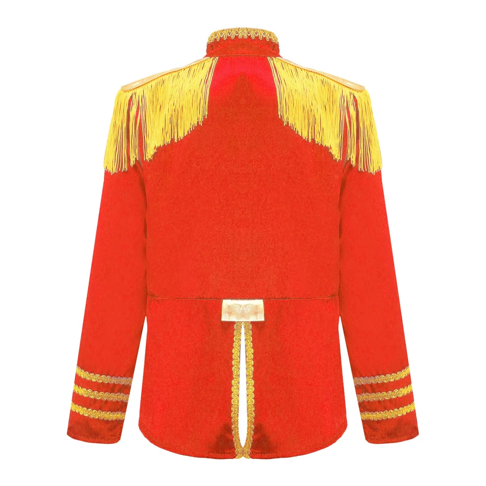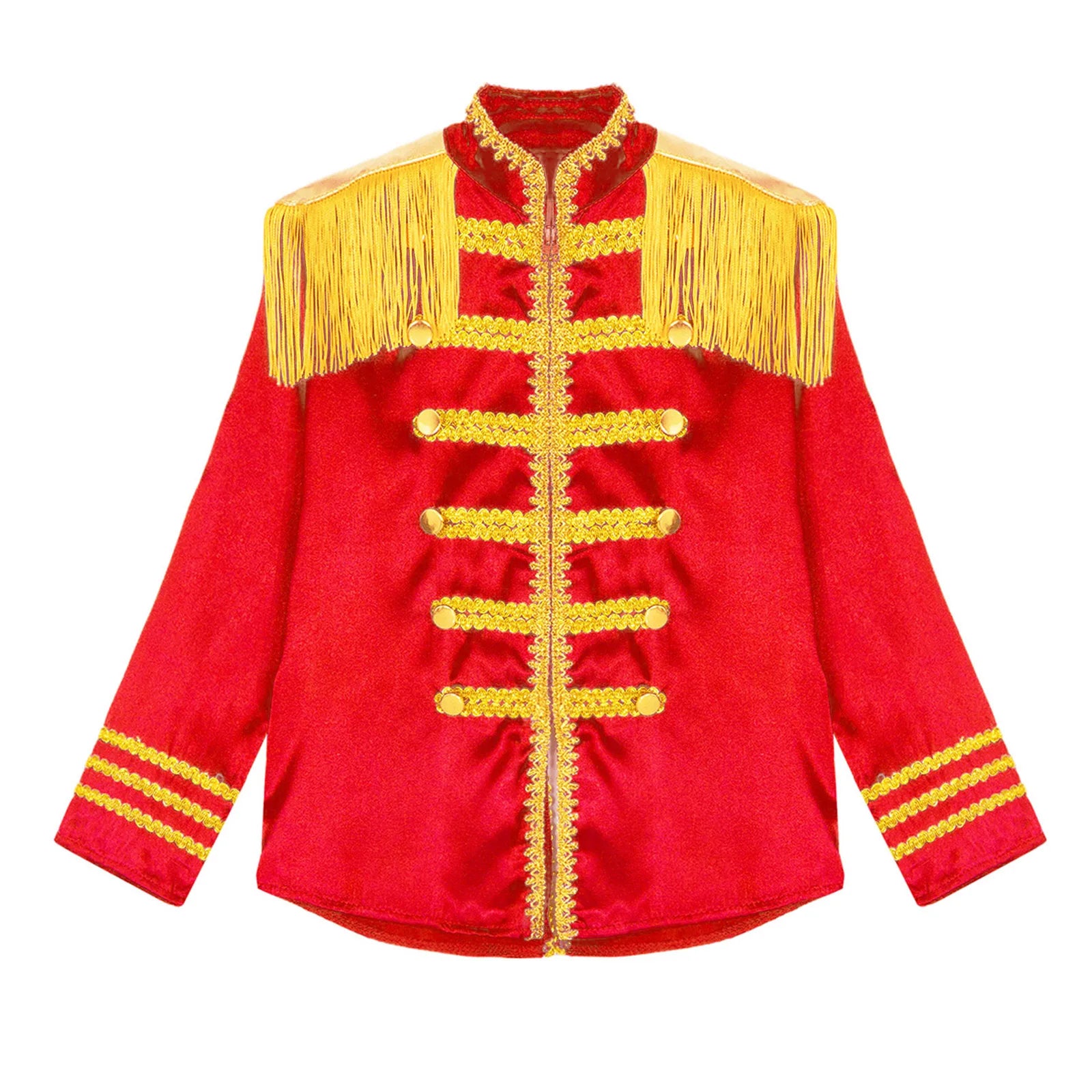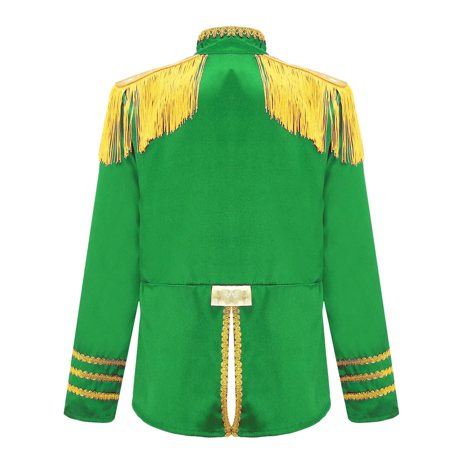This polyester fabric costume is made for children (6-16 years old) and is soft, smooth, and skin-friendly, providing a comfortable and breathable fit. Perfect for dressing up as a pop-star rock band musician from the 1960s, this costume features a mock neck, long sleeves, a fringe tassel epaulet, and a hassle-free front zipper closure. The solid color shirt top has a split design at the front and back bottoms, complete with glossy gold lace and buttons for a deluxe look. Ideal for Halloween, 1960s pop-star cosplay, singer role play, themed parties, and stage performances.