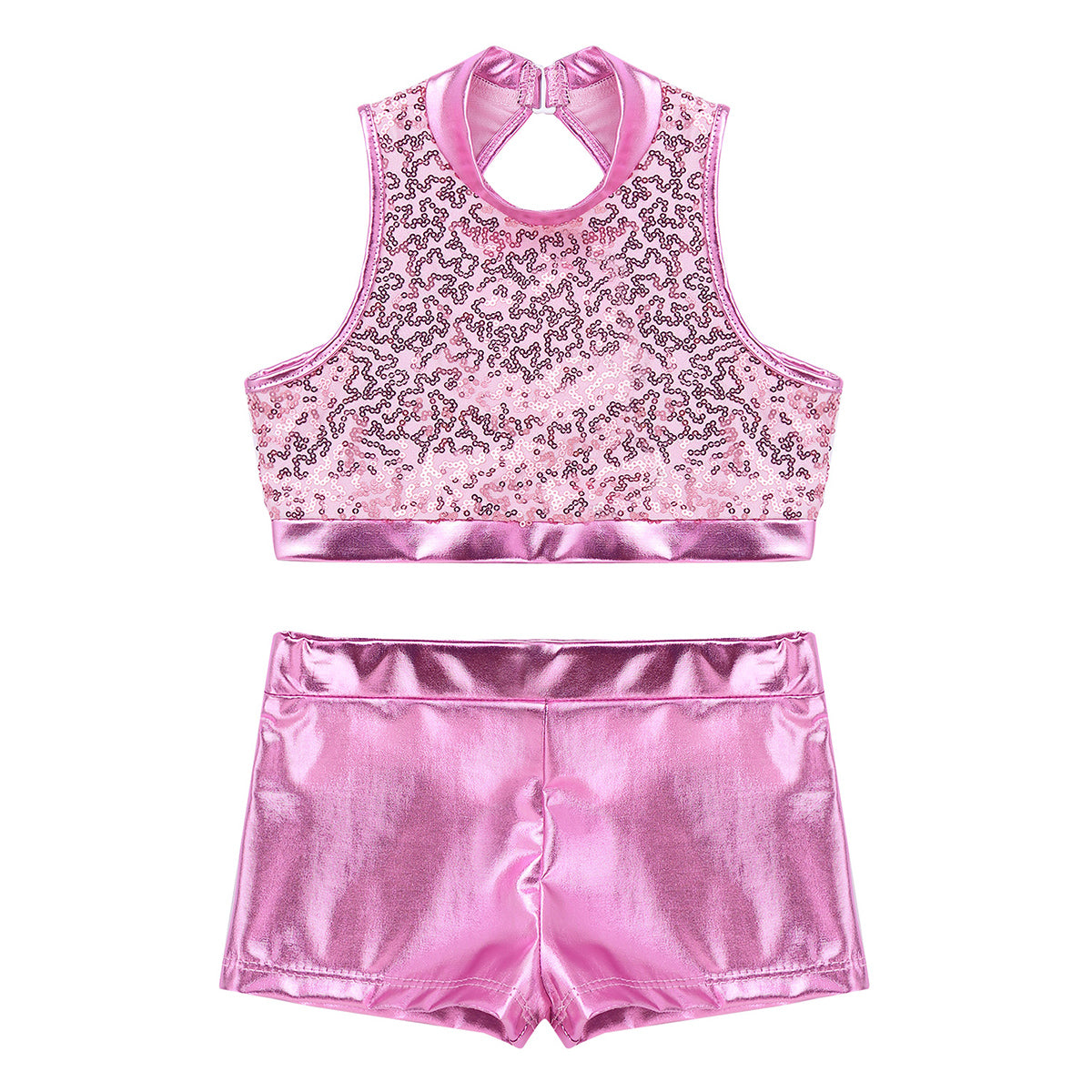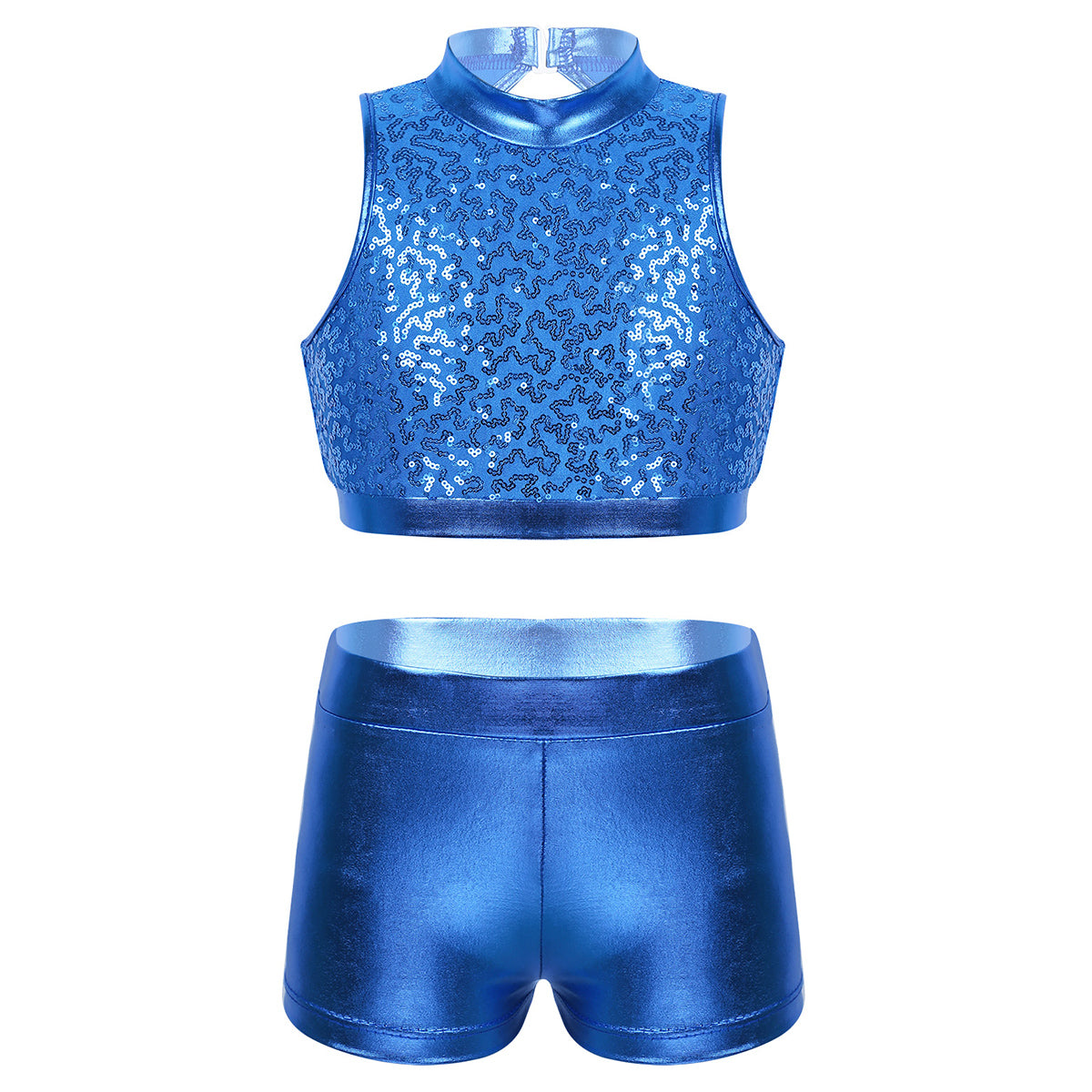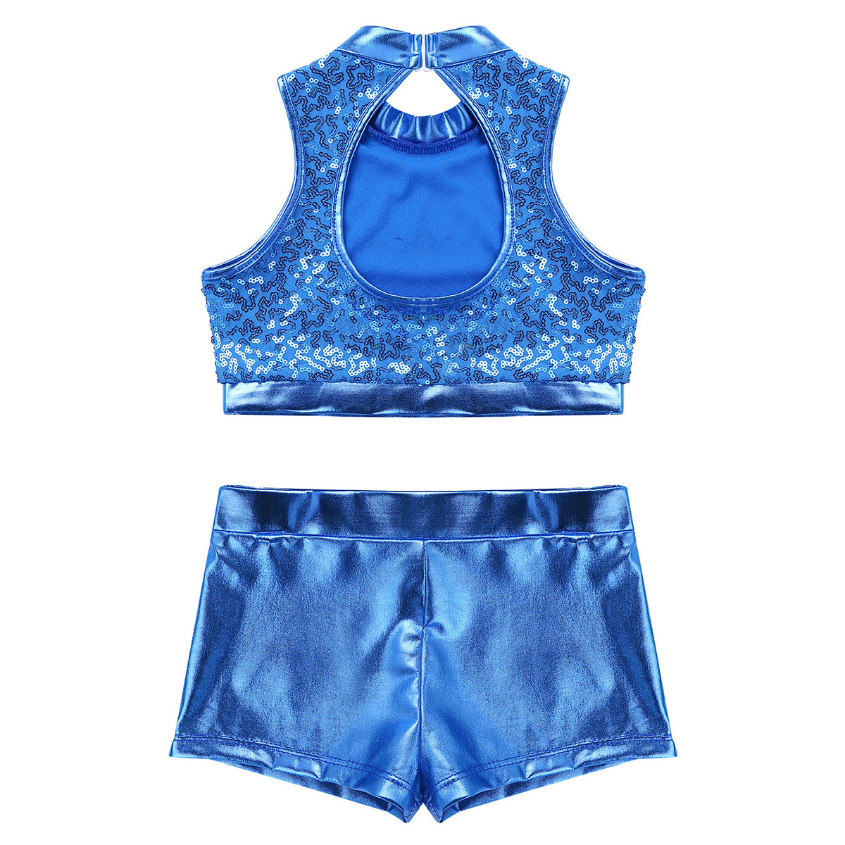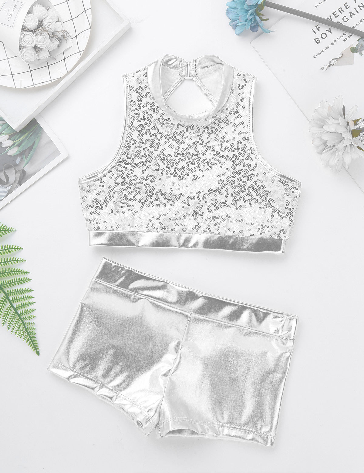 This ensemble is composed of polyester and sequins and should be hand washed. The included Size Table provides age ranges for girls, although they are only meant as a general guide. The crop top features a sleeveless design, mock neck with clasp closure, shiny sequins decoration, and cutout back. It also comes with lining for added comfort. The set is completed with matching metallic mid-rise shorts with a wide elastic waistband. It is a stylish and sparkly option for various types of dance including hip-hop, tap, jazz, street, teamwear, and school performances.