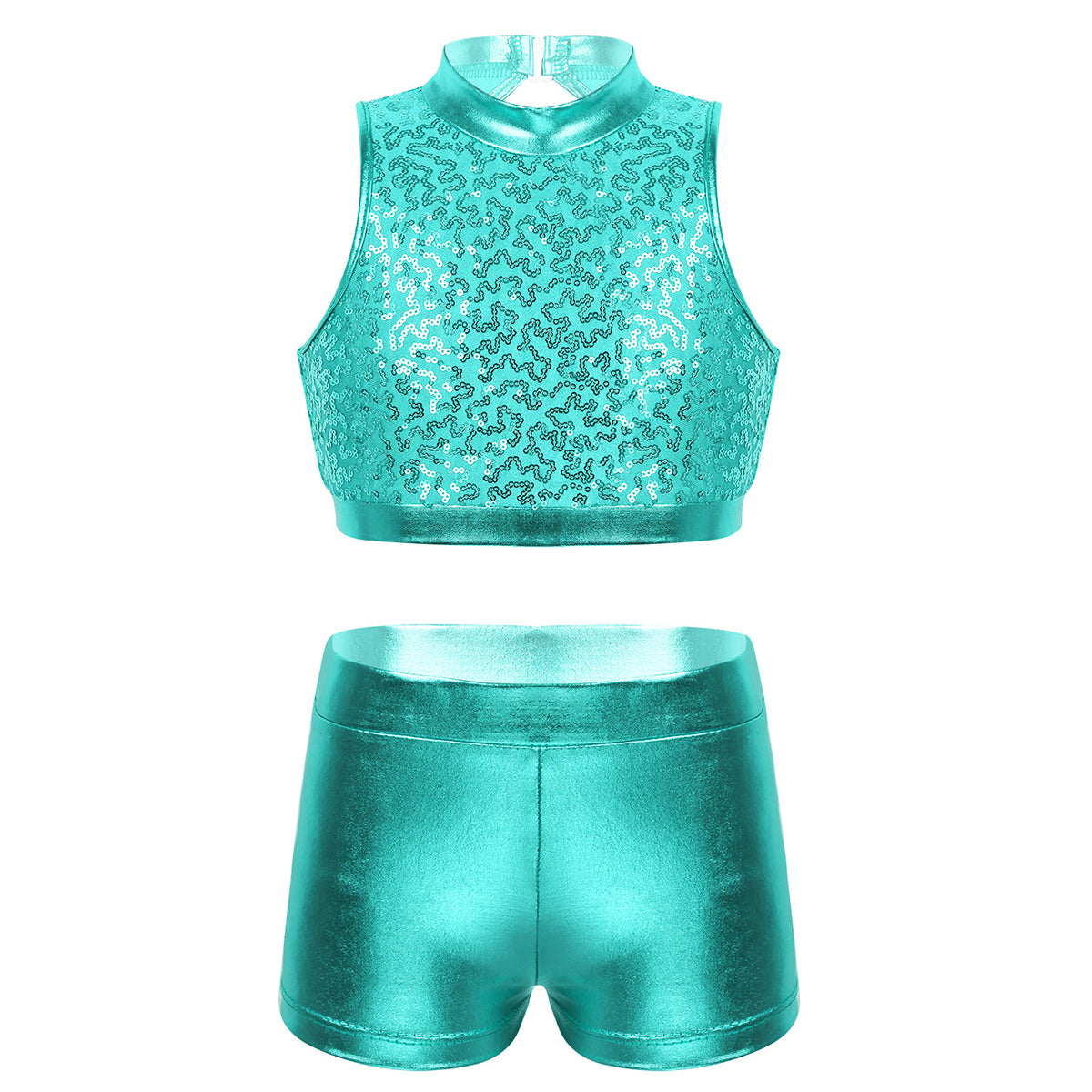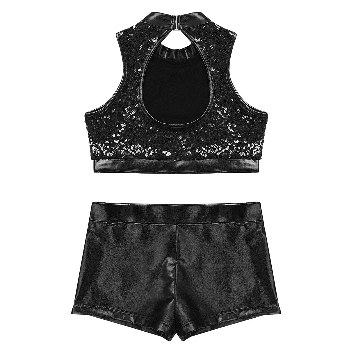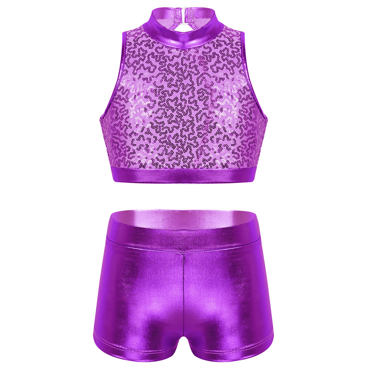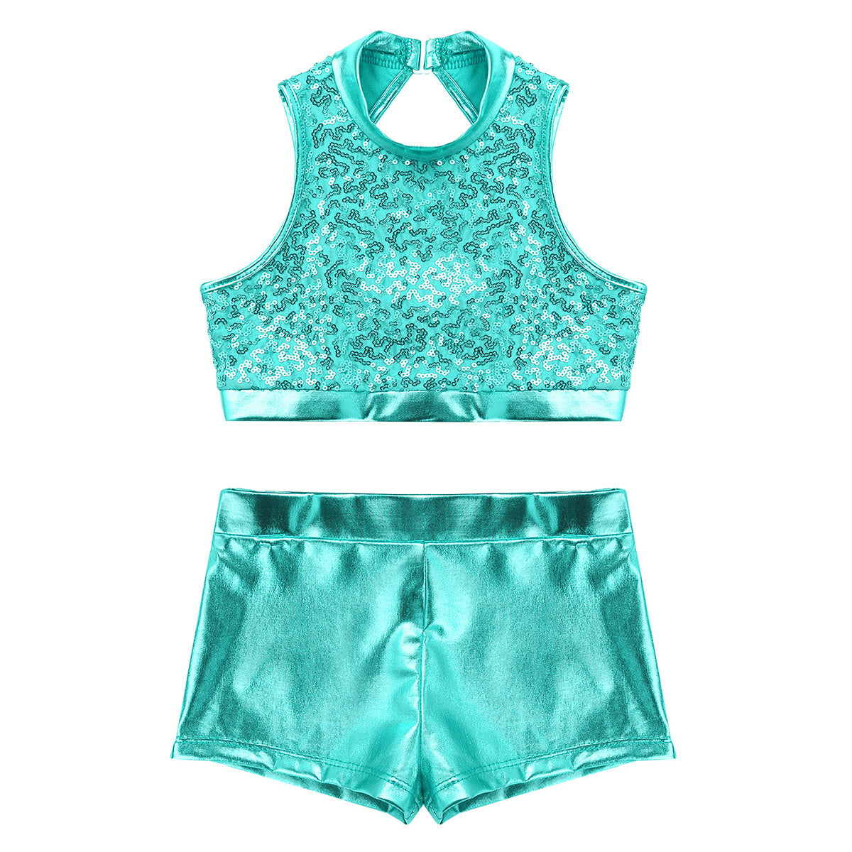 This ensemble is composed of polyester and sequins and should be hand washed. The included Size Table provides age ranges for girls, although they are only meant as a general guide. The crop top features a sleeveless design, mock neck with clasp closure, shiny sequins decoration, and cutout back. It also comes with lining for added comfort. The set is completed with matching metallic mid-rise shorts with a wide elastic waistband. It is a stylish and sparkly option for various types of dance including hip-hop, tap, jazz, street, teamwear, and school performances.