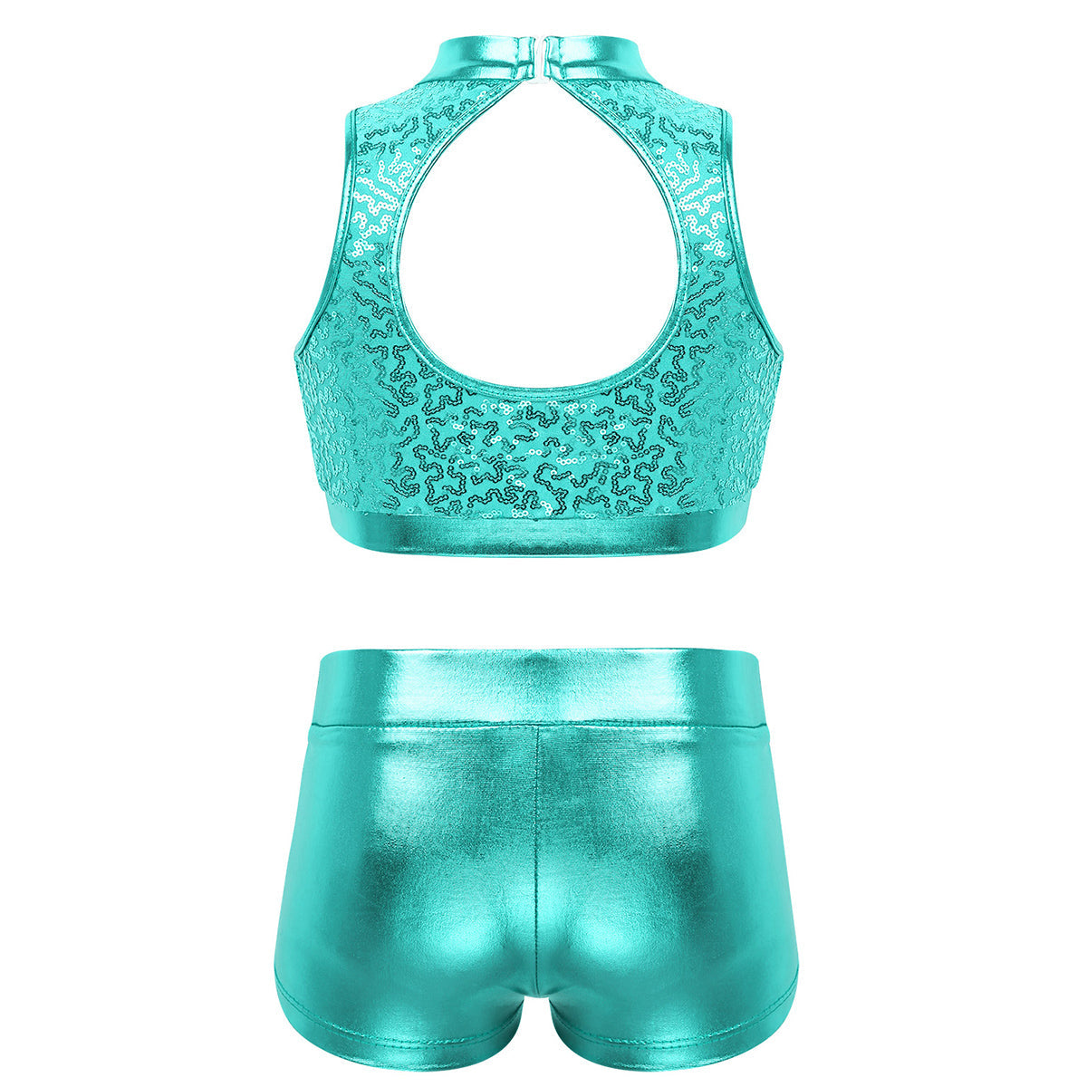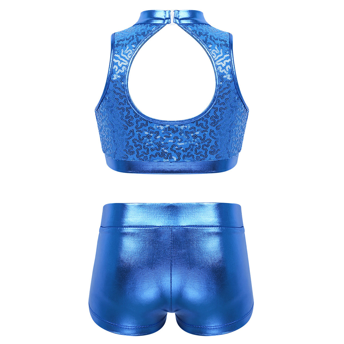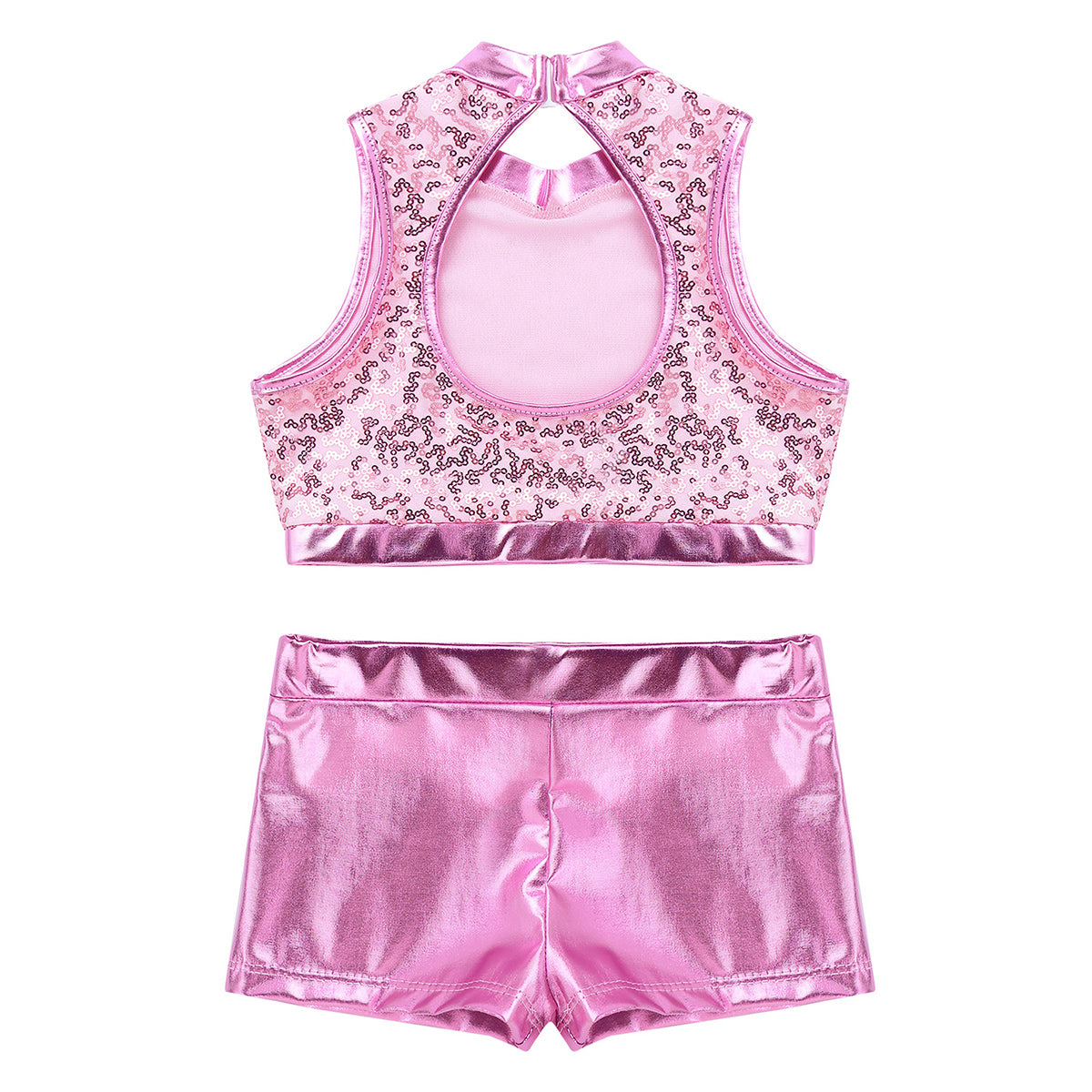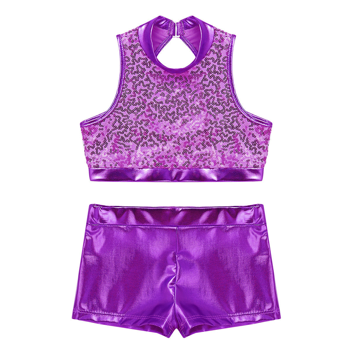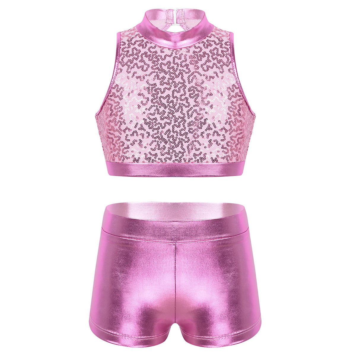This ensemble is composed of polyester and sequins and should be hand washed. The included Size Table provides age ranges for girls, although they are only meant as a general guide. The crop top features a sleeveless design, mock neck with clasp closure, shiny sequins decoration, and cutout back. It also comes with lining for added comfort. The set is completed with matching metallic mid-rise shorts with a wide elastic waistband. It is a stylish and sparkly option for various types of dance including hip-hop, tap, jazz, street, teamwear, and school performances.