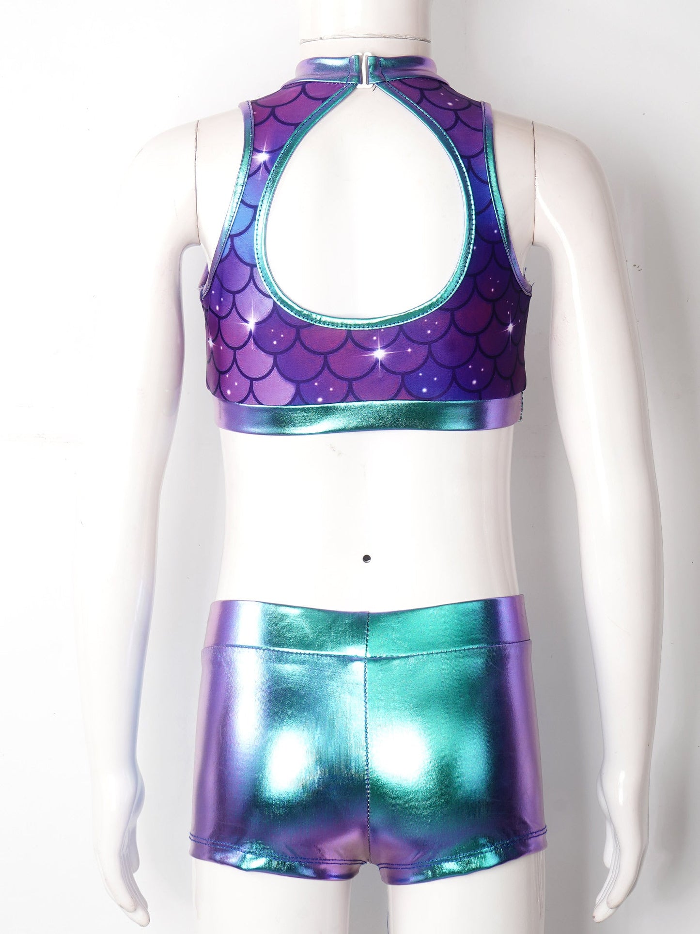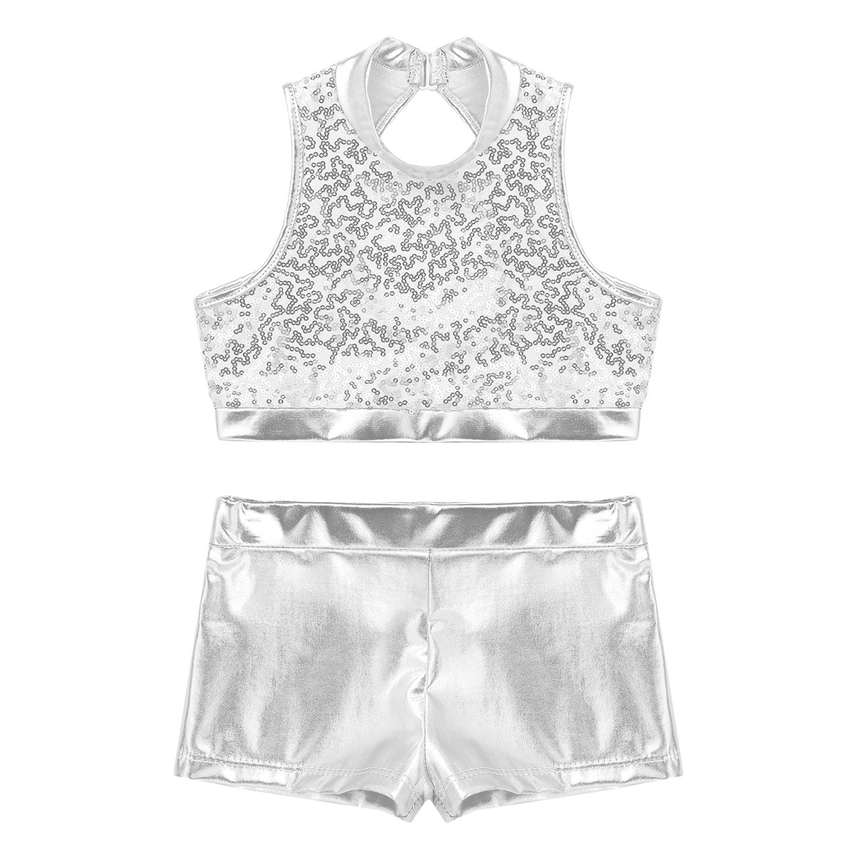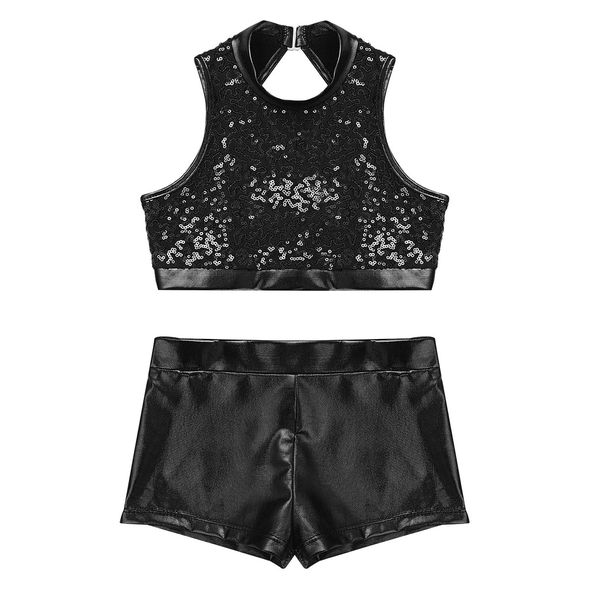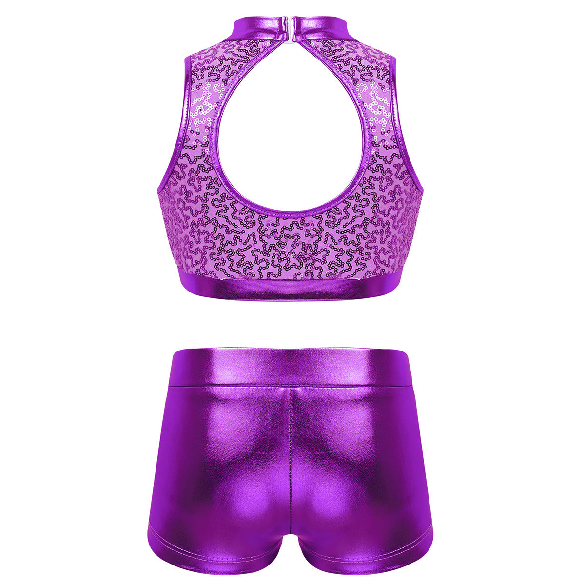 This ensemble is composed of polyester and sequins and should be hand washed. The included Size Table provides age ranges for girls, although they are only meant as a general guide. The crop top features a sleeveless design, mock neck with clasp closure, shiny sequins decoration, and cutout back. It also comes with lining for added comfort. The set is completed with matching metallic mid-rise shorts with a wide elastic waistband. It is a stylish and sparkly option for various types of dance including hip-hop, tap, jazz, street, teamwear, and school performances.