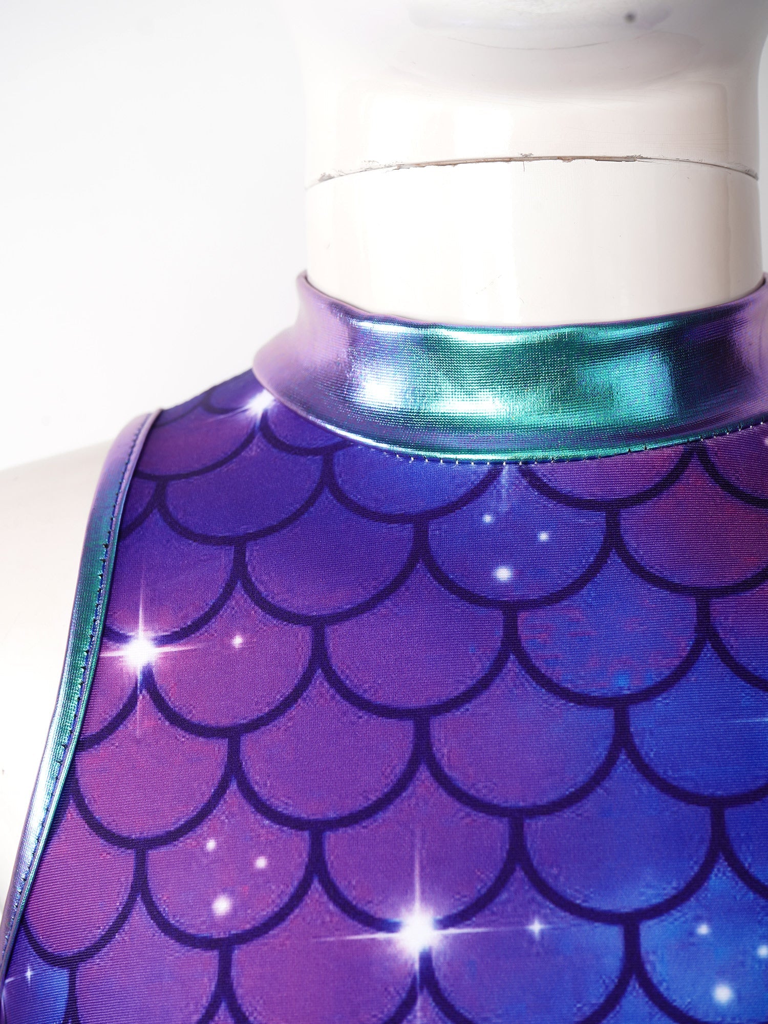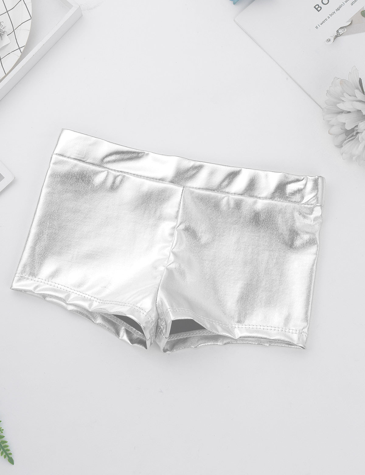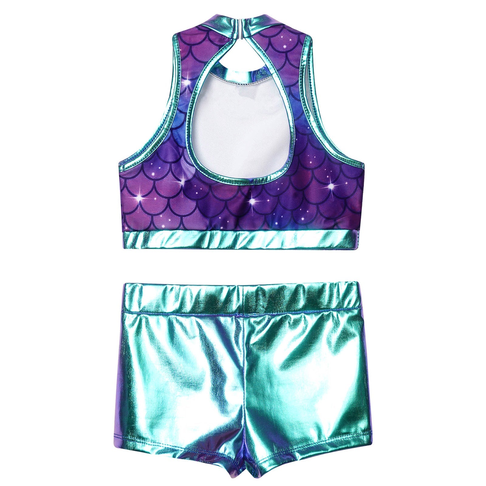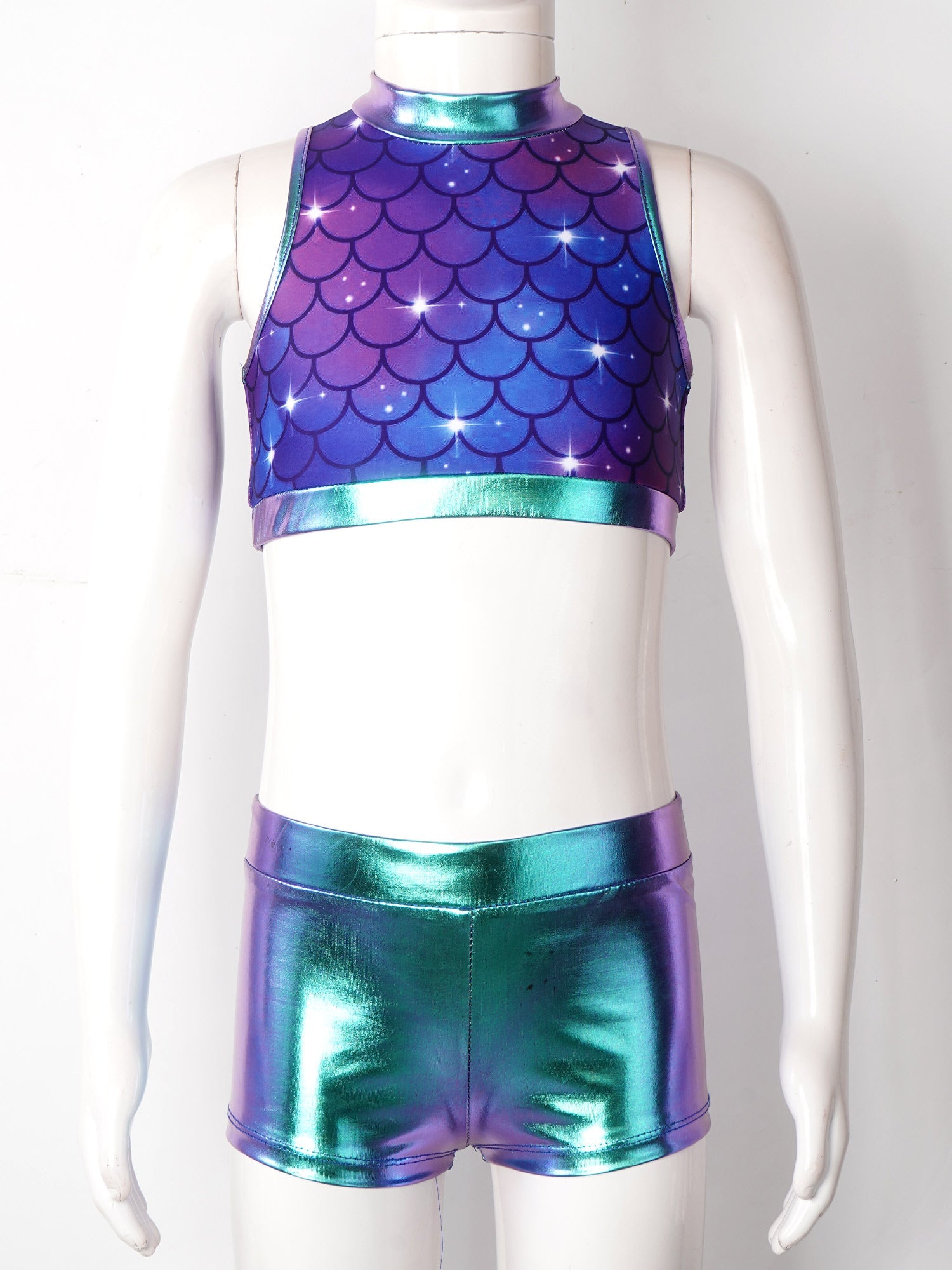 This ensemble is composed of polyester and sequins and should be hand washed. The included Size Table provides age ranges for girls, although they are only meant as a general guide. The crop top features a sleeveless design, mock neck with clasp closure, shiny sequins decoration, and cutout back. It also comes with lining for added comfort. The set is completed with matching metallic mid-rise shorts with a wide elastic waistband. It is a stylish and sparkly option for various types of dance including hip-hop, tap, jazz, street, teamwear, and school performances.