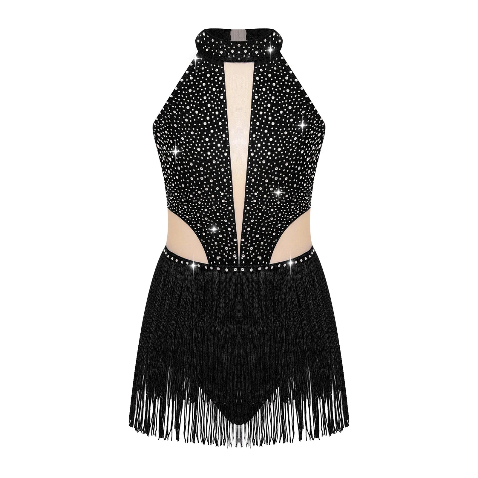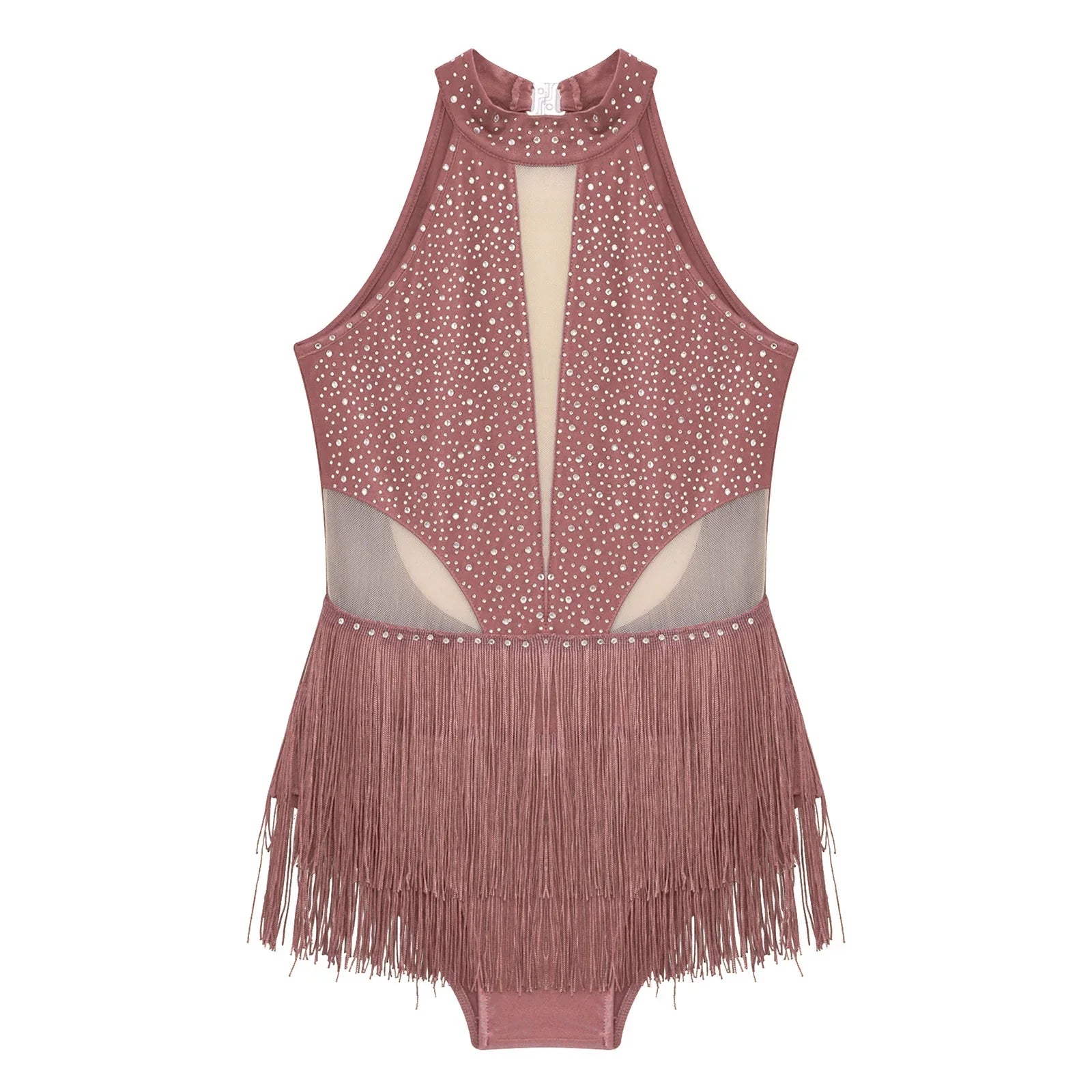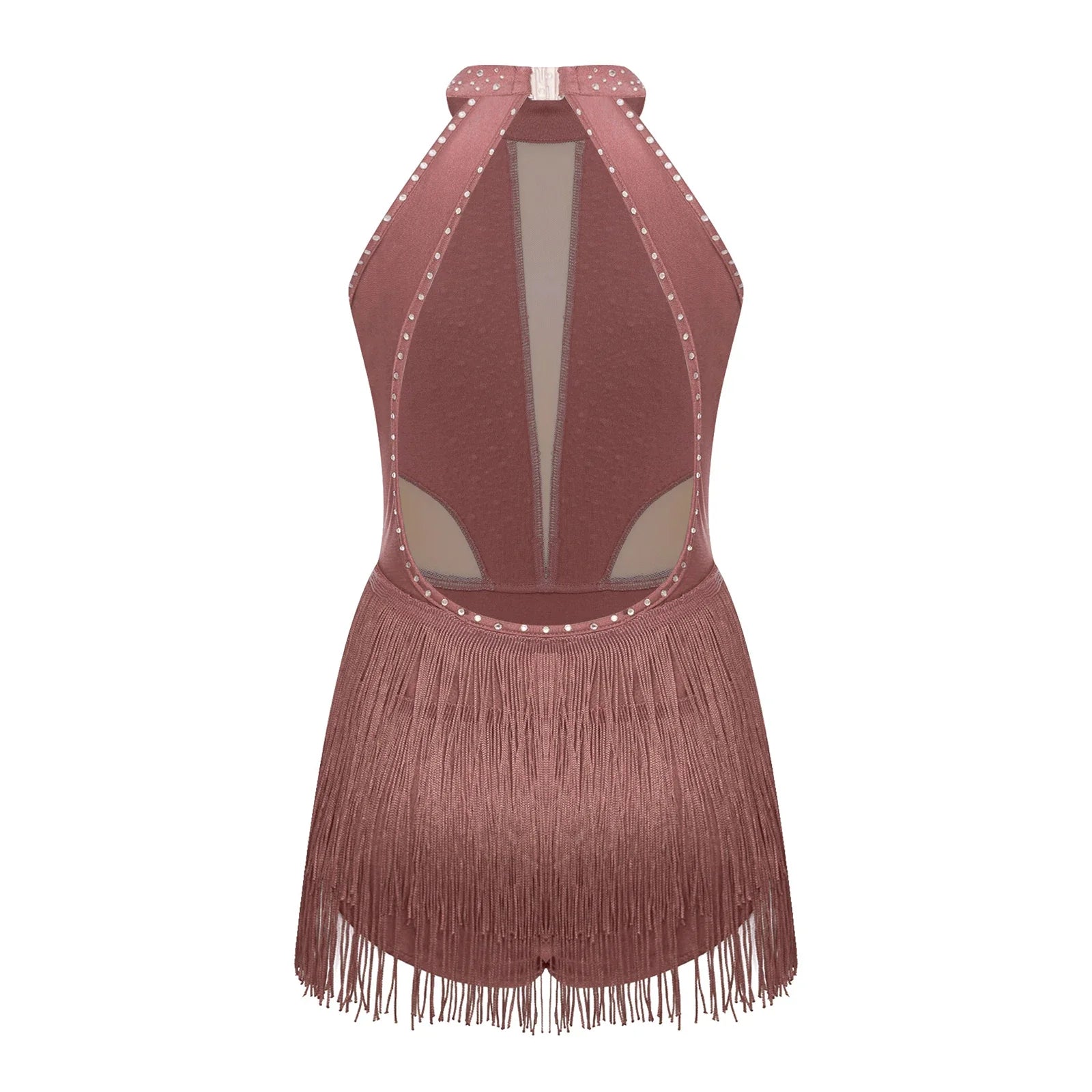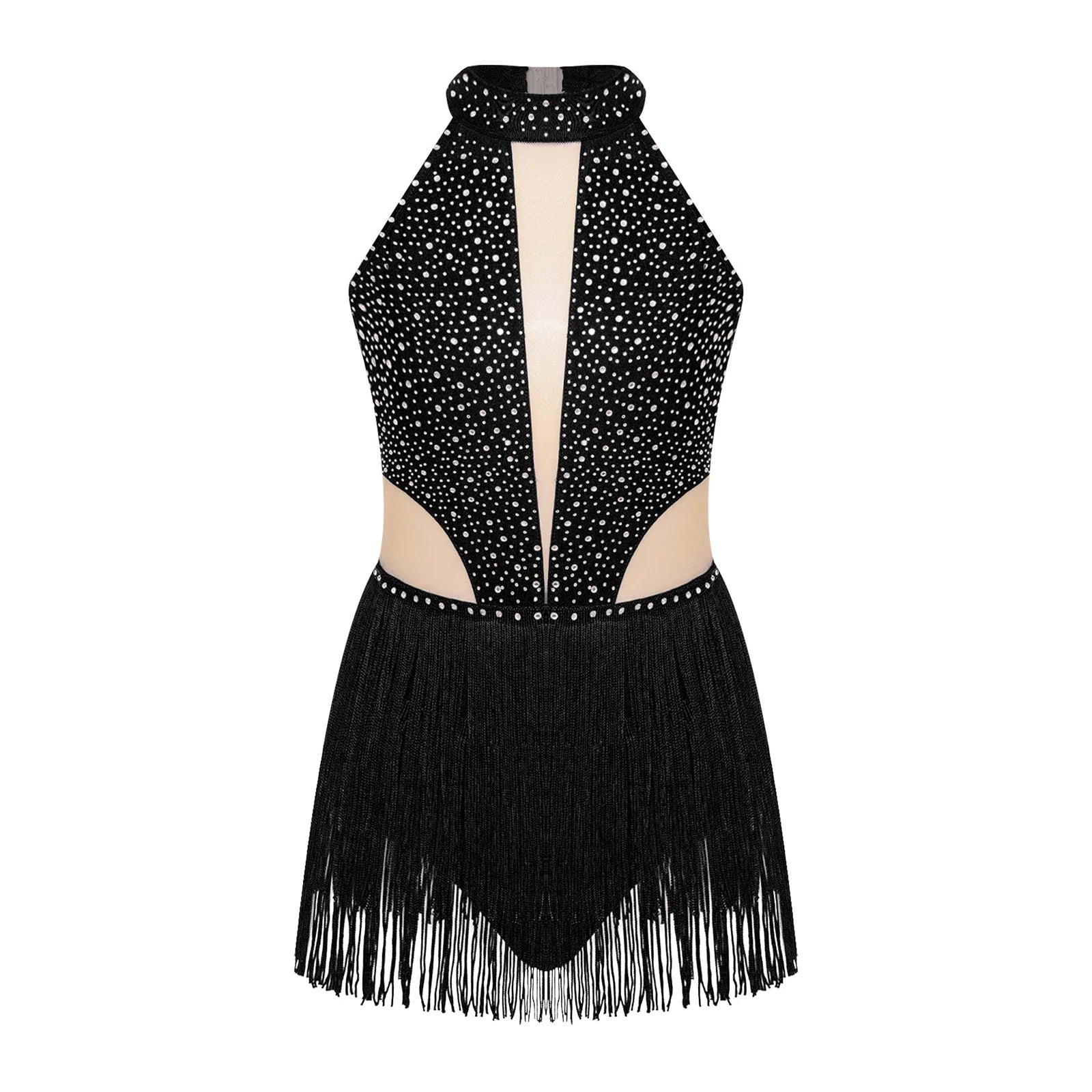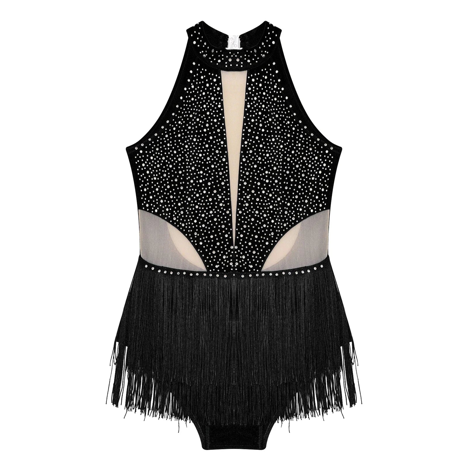 Enhance your girl's performance with this sparkling rhinestone leotard. The nude sheer mesh and high-density tassels create a sense of movement, adding to the beauty of her dance. Designed for flexibility and comfort, this leotard is perfect for Latin Dance, tango, rumba, samba, cha-cha, and other special occasions. With a backless and mock neck design, it's easy to wear and guarantees a stunning appearance on stage.