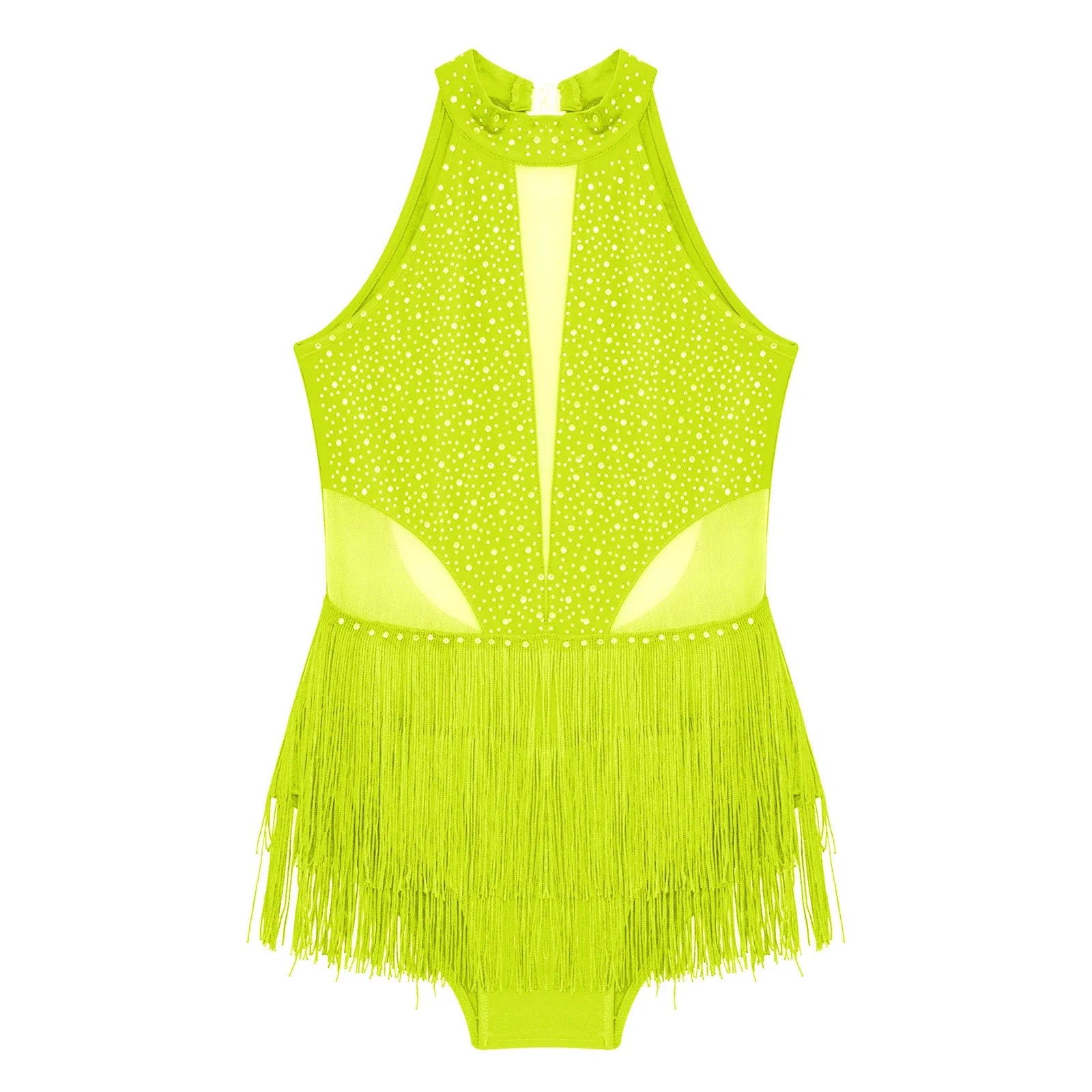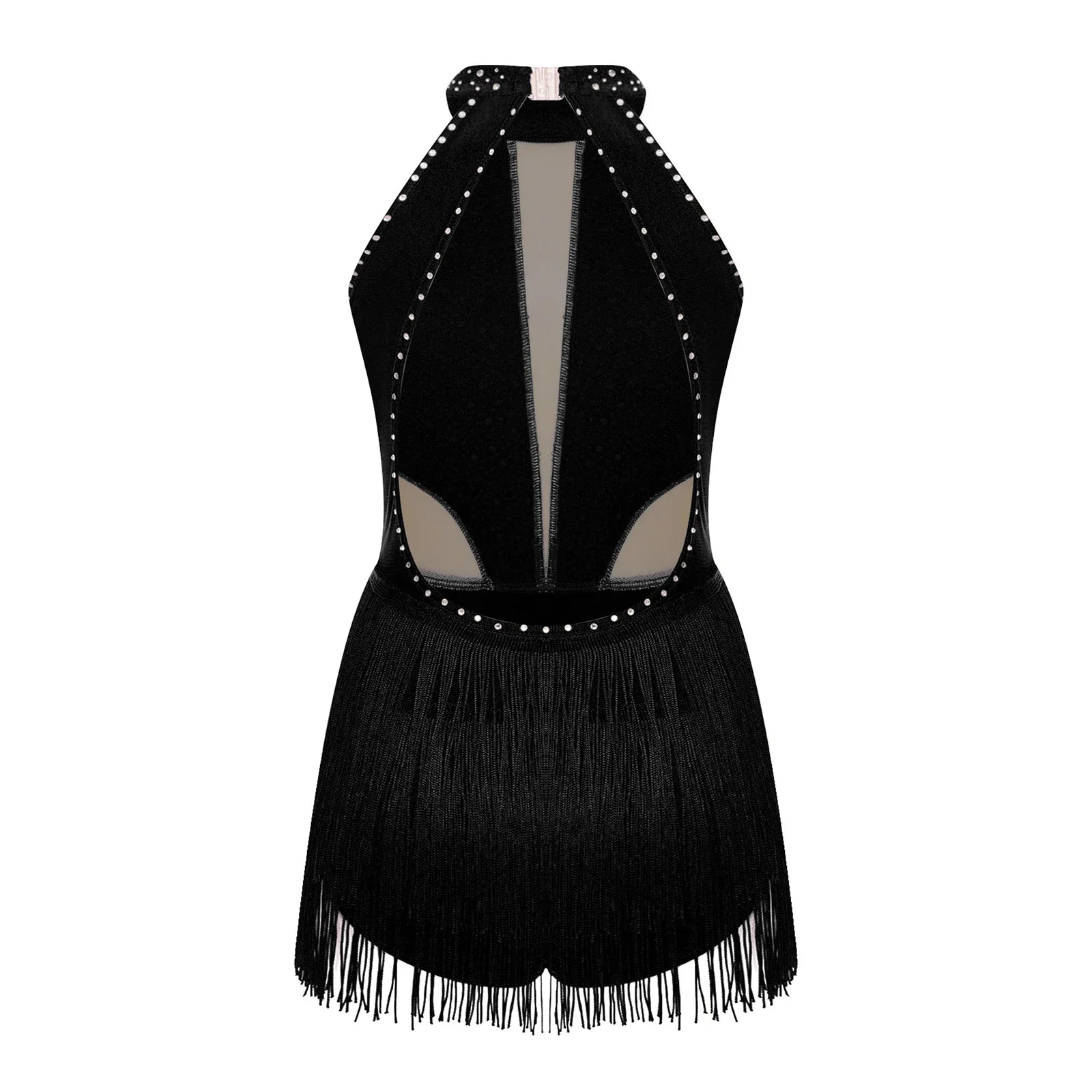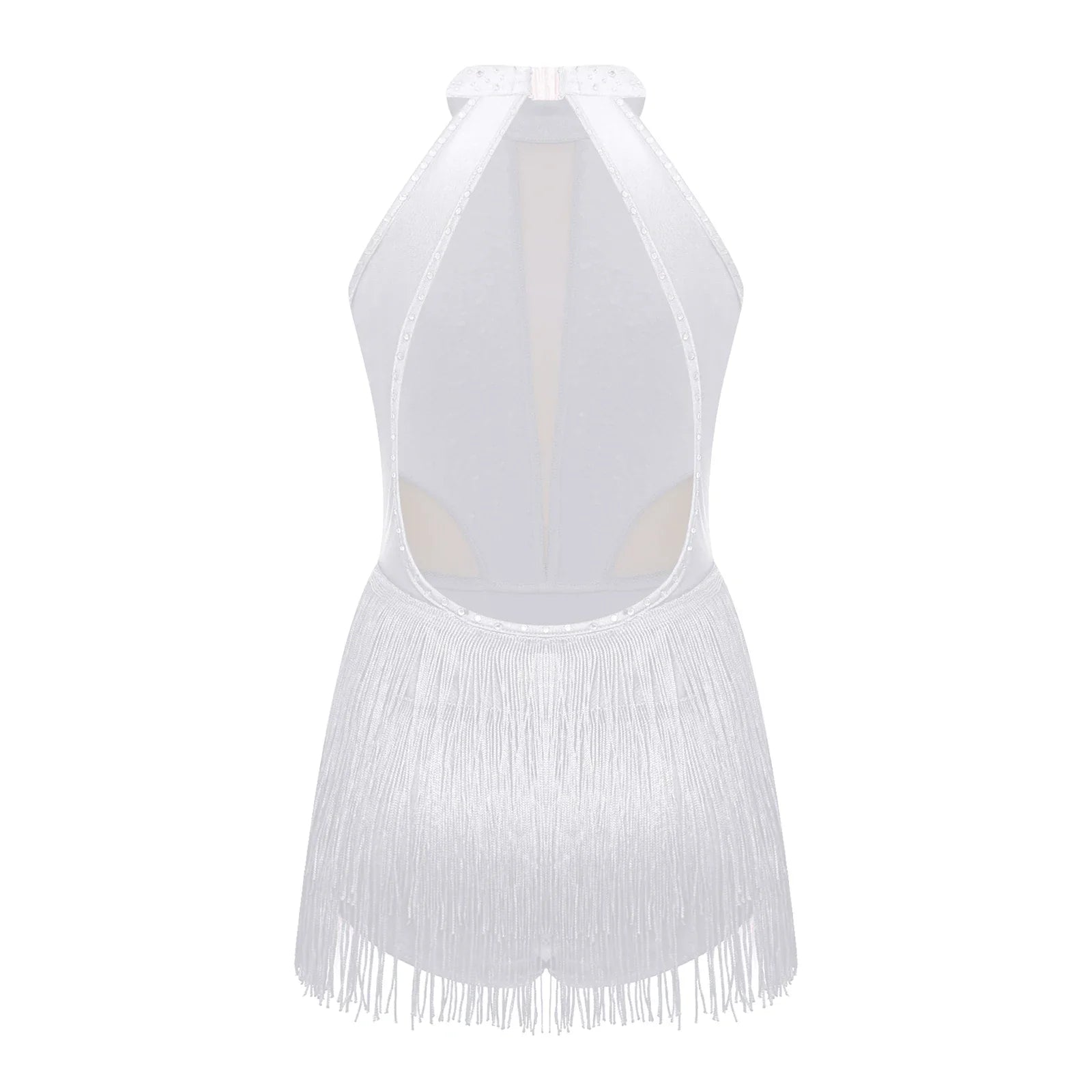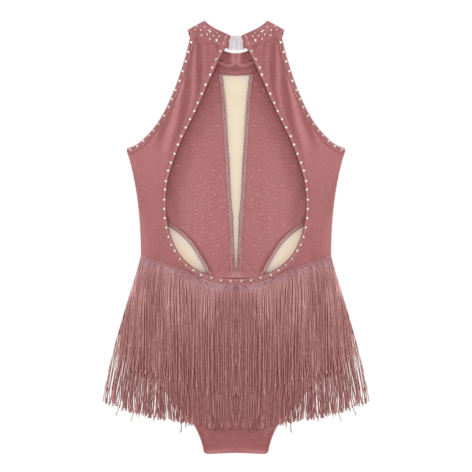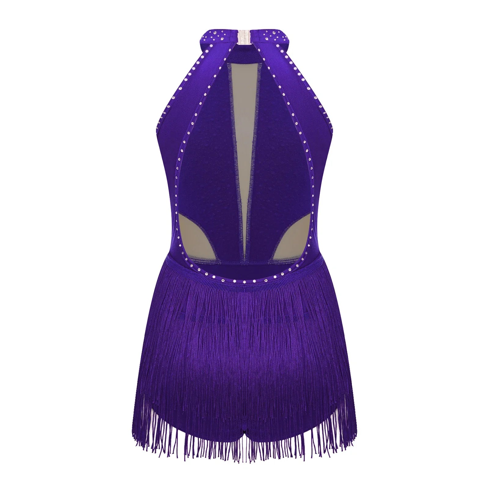 Enhance your girl's performance with this sparkling rhinestone leotard. The nude sheer mesh and high-density tassels create a sense of movement, adding to the beauty of her dance. Designed for flexibility and comfort, this leotard is perfect for Latin Dance, tango, rumba, samba, cha-cha, and other special occasions. With a backless and mock neck design, it's easy to wear and guarantees a stunning appearance on stage.