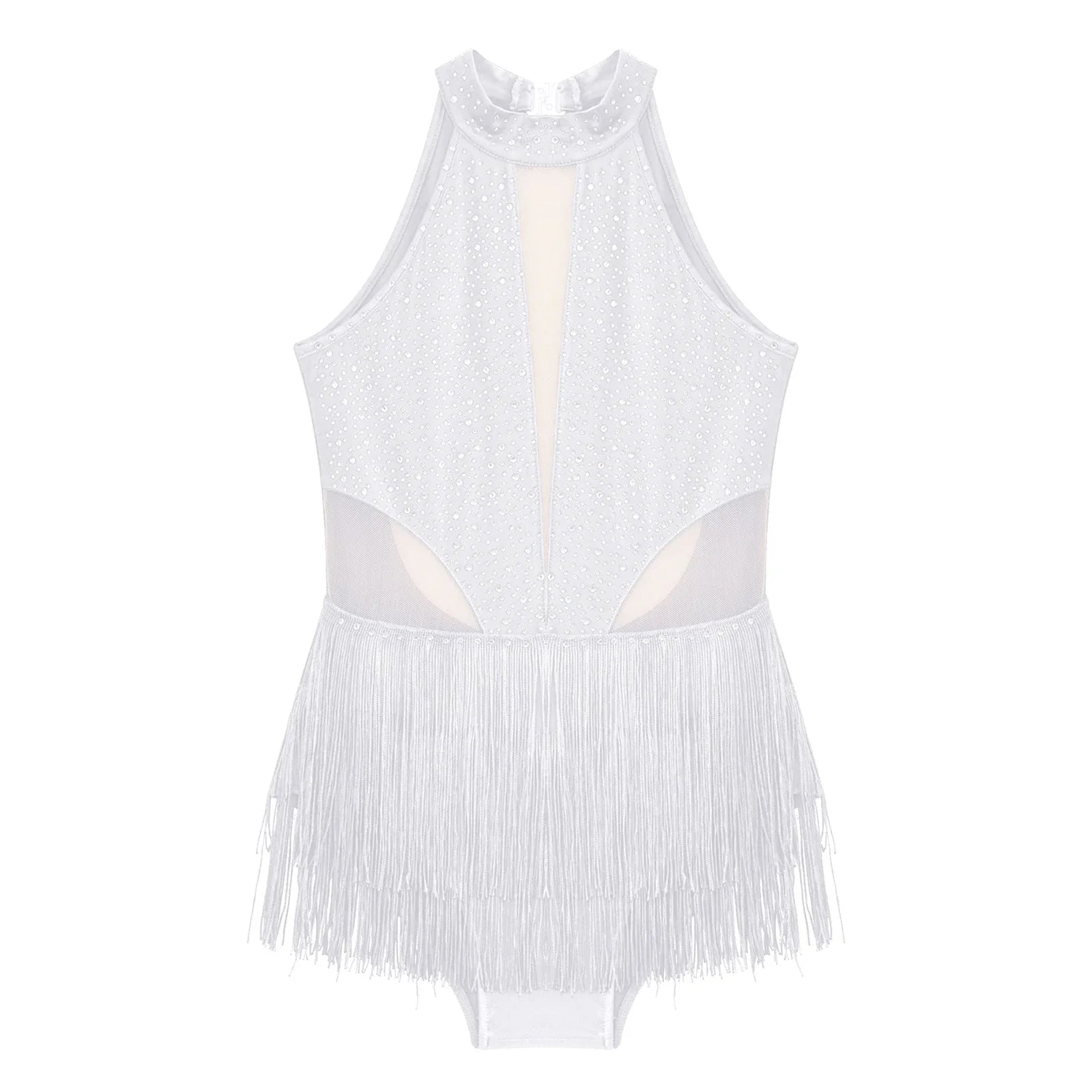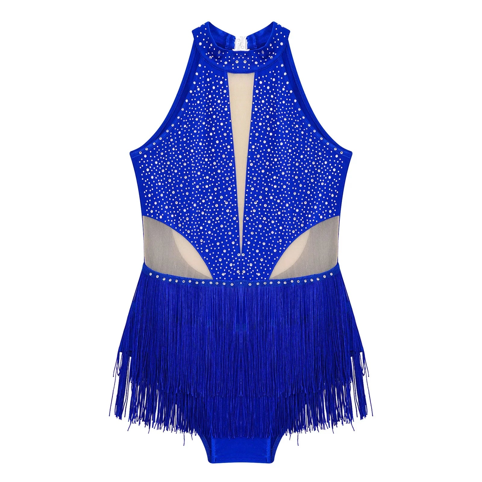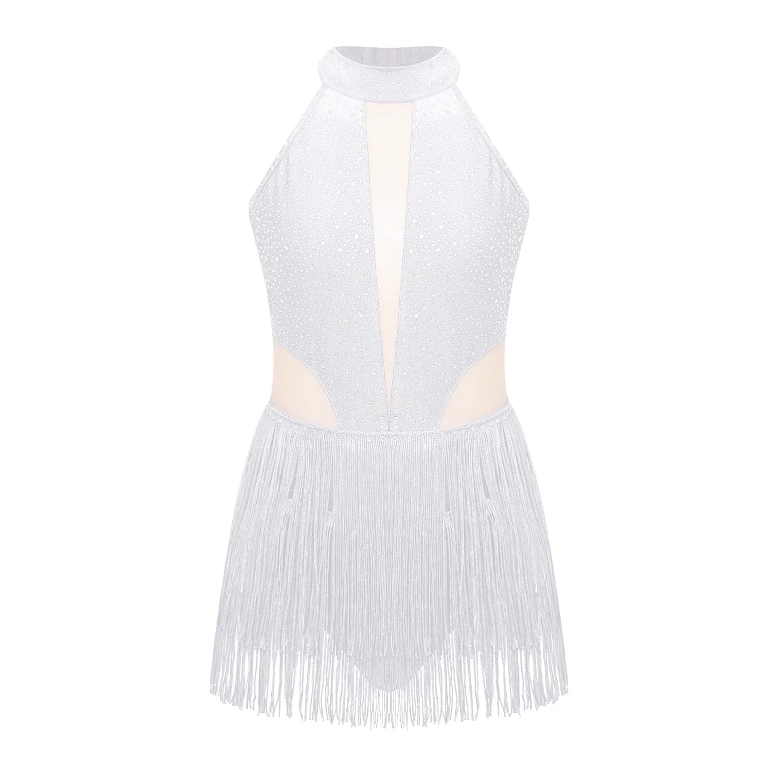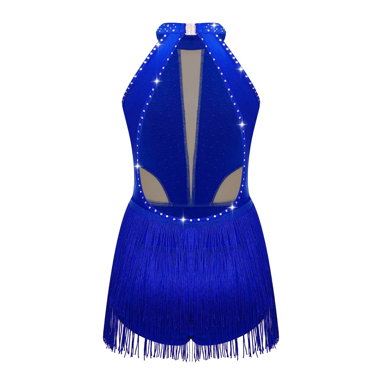 Enhance your girl's performance with this sparkling rhinestone leotard. The nude sheer mesh and high-density tassels create a sense of movement, adding to the beauty of her dance. Designed for flexibility and comfort, this leotard is perfect for Latin Dance, tango, rumba, samba, cha-cha, and other special occasions. With a backless and mock neck design, it's easy to wear and guarantees a stunning appearance on stage.