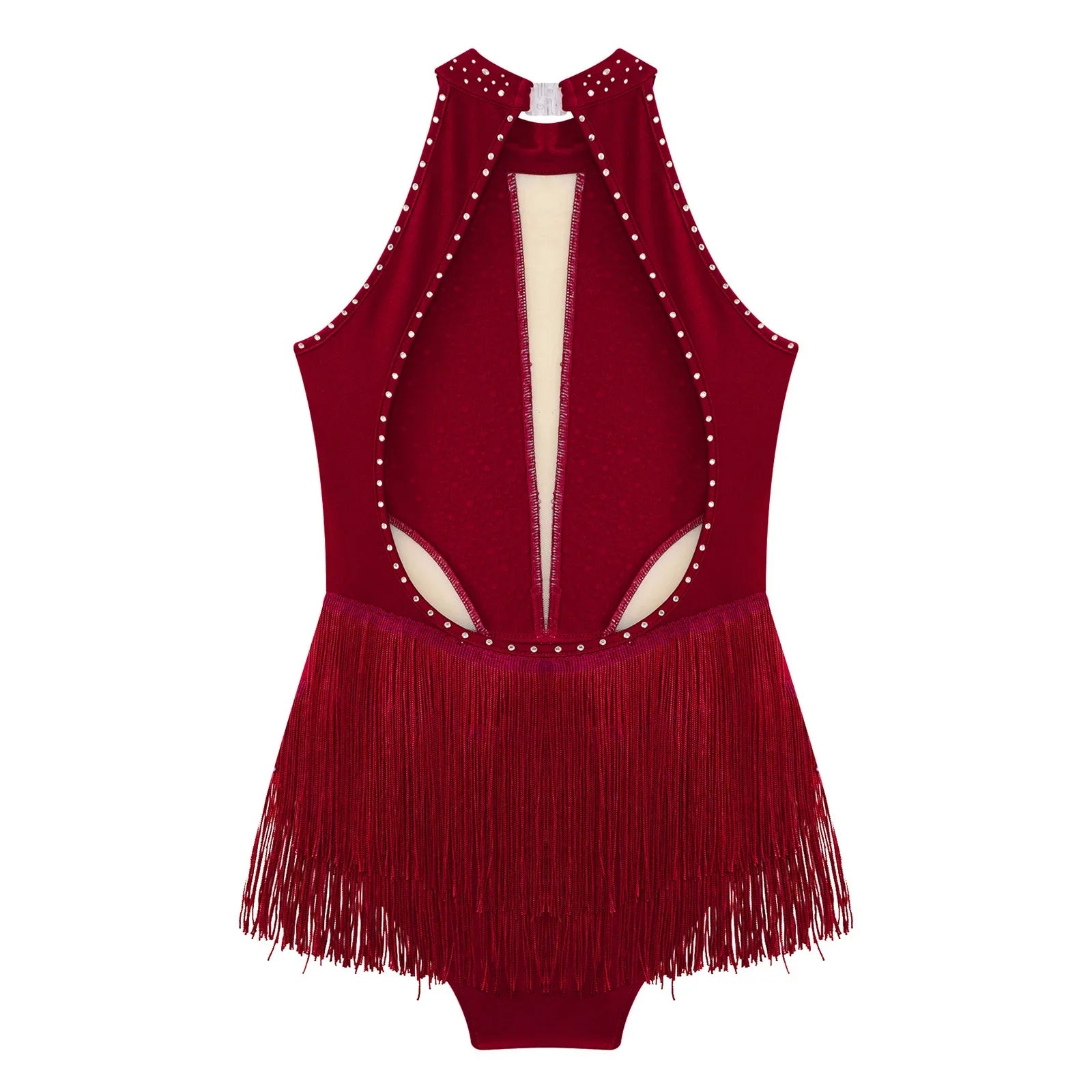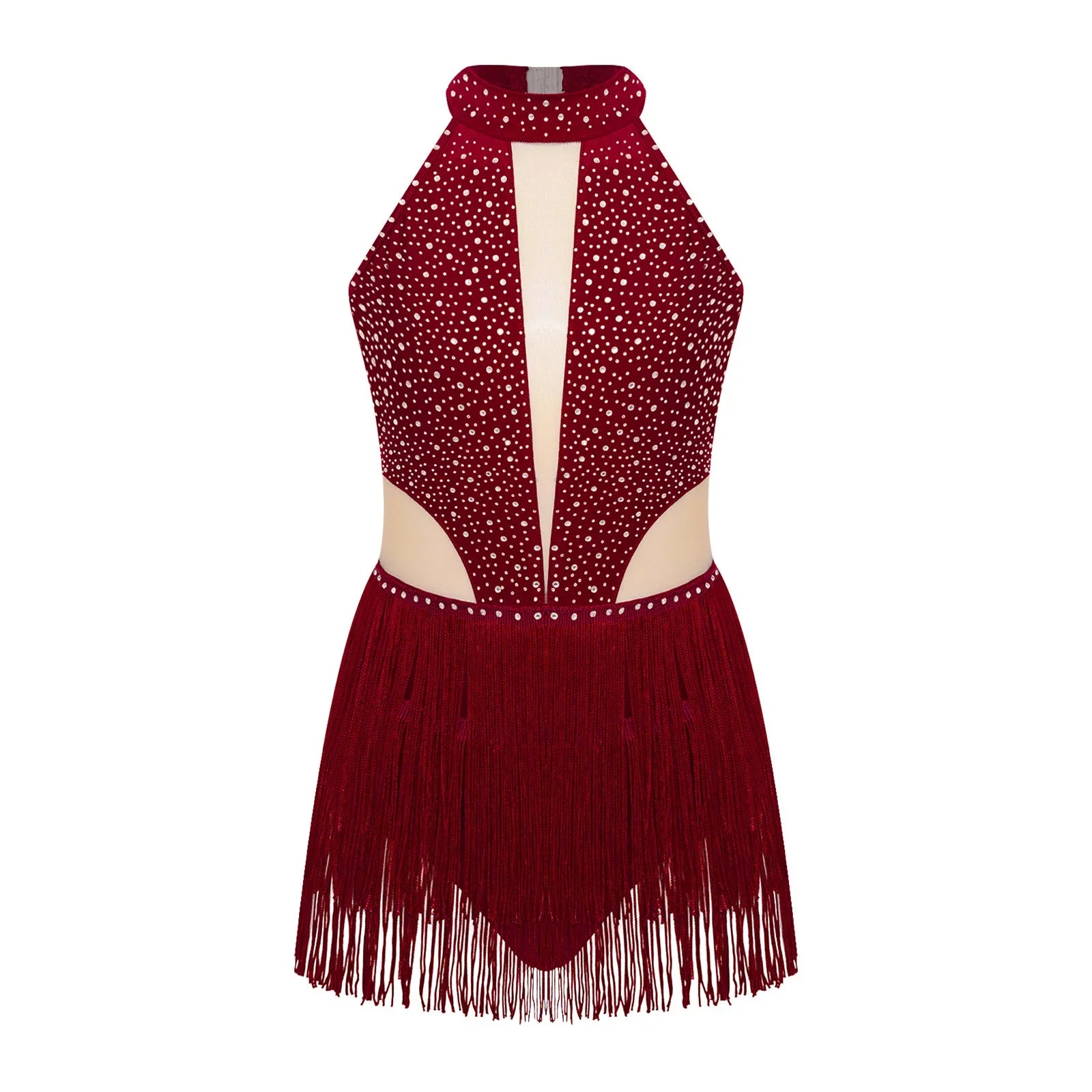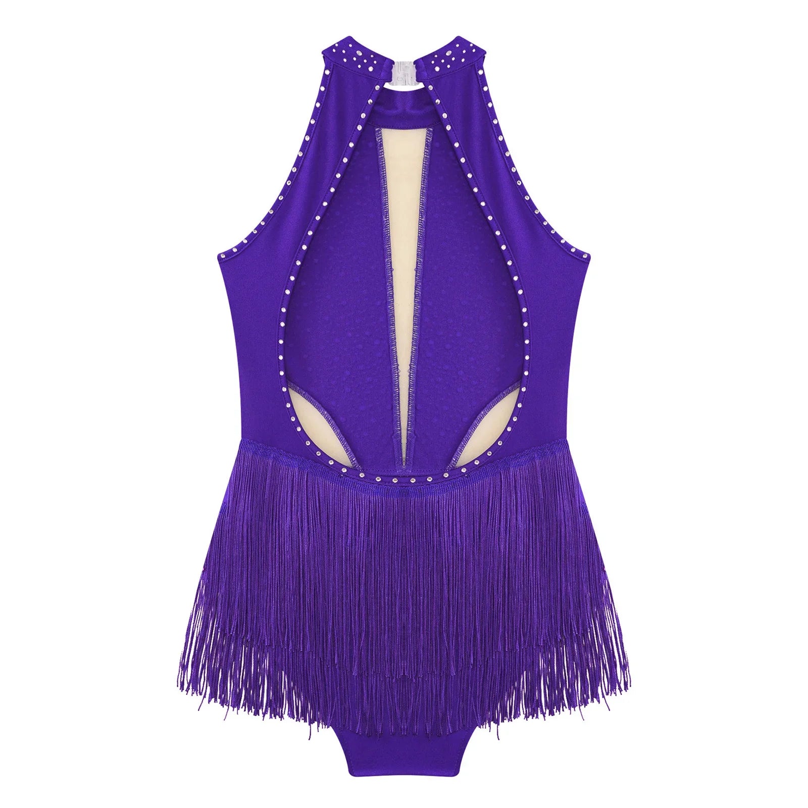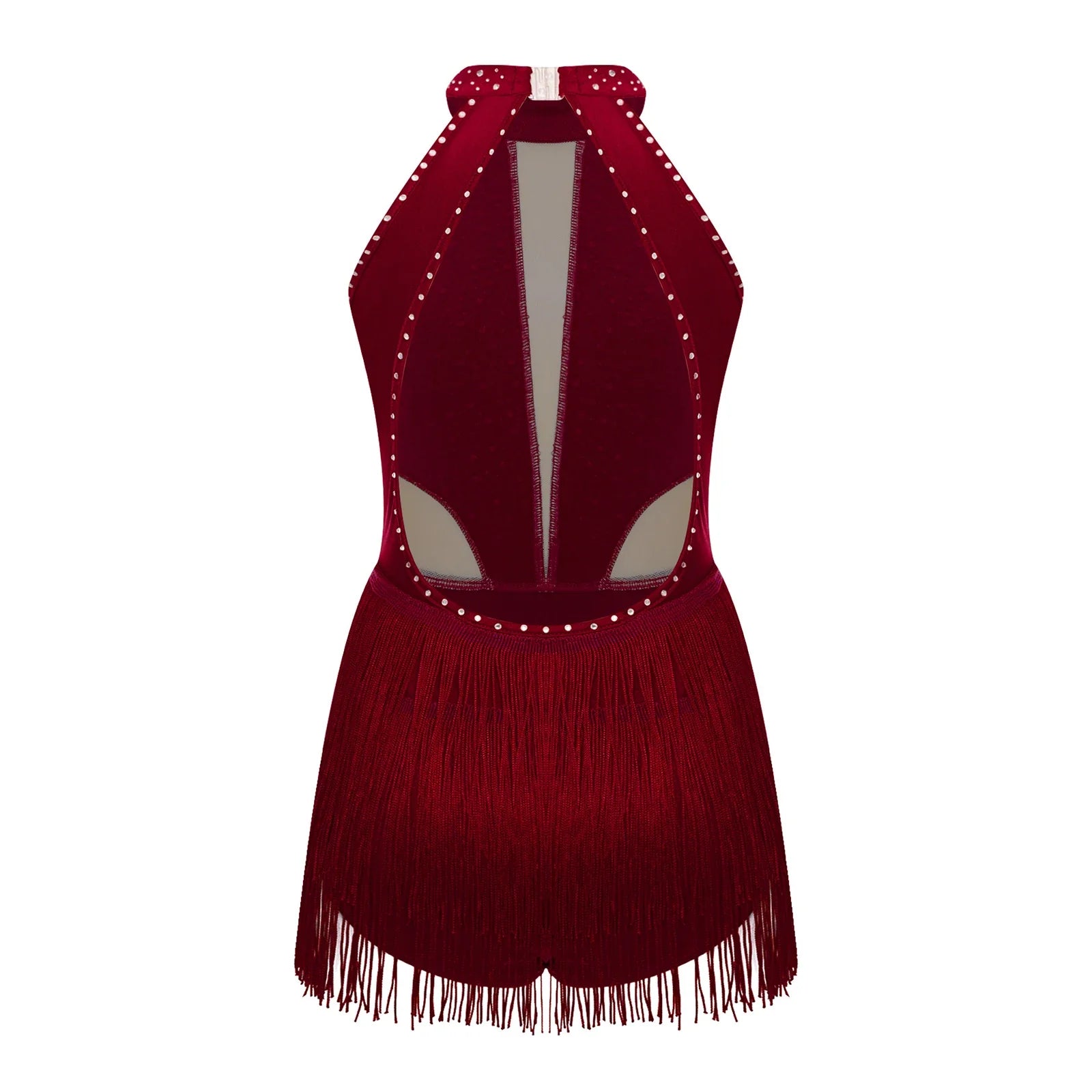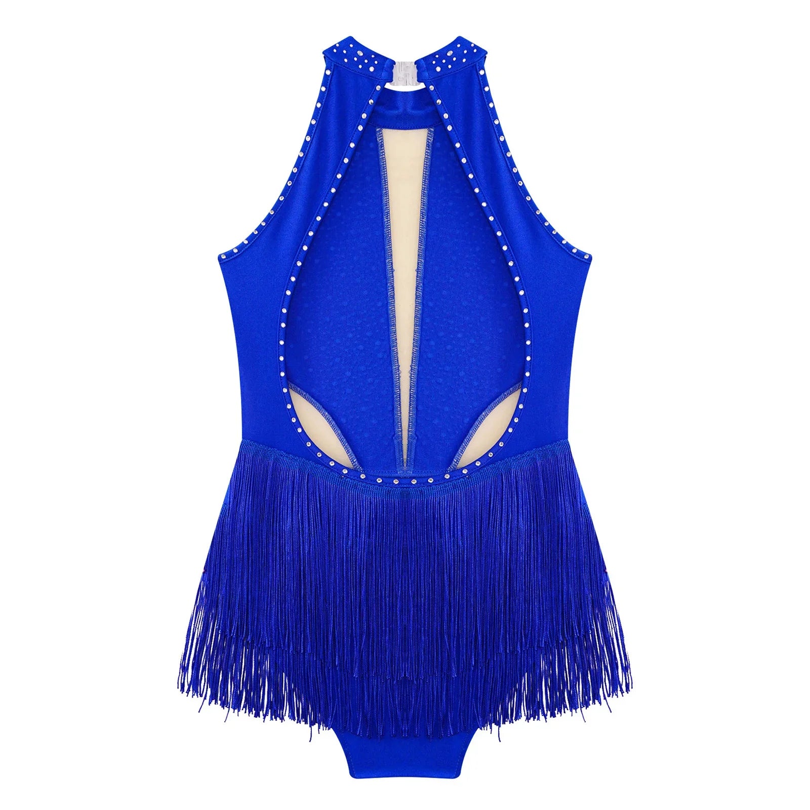 Enhance your girl's performance with this sparkling rhinestone leotard. The nude sheer mesh and high-density tassels create a sense of movement, adding to the beauty of her dance. Designed for flexibility and comfort, this leotard is perfect for Latin Dance, tango, rumba, samba, cha-cha, and other special occasions. With a backless and mock neck design, it's easy to wear and guarantees a stunning appearance on stage.