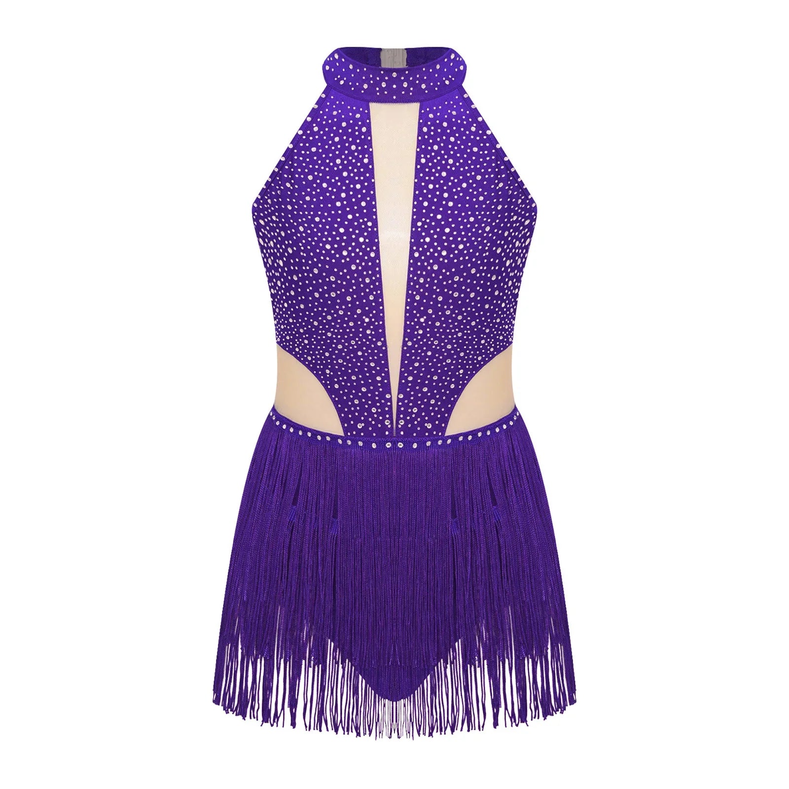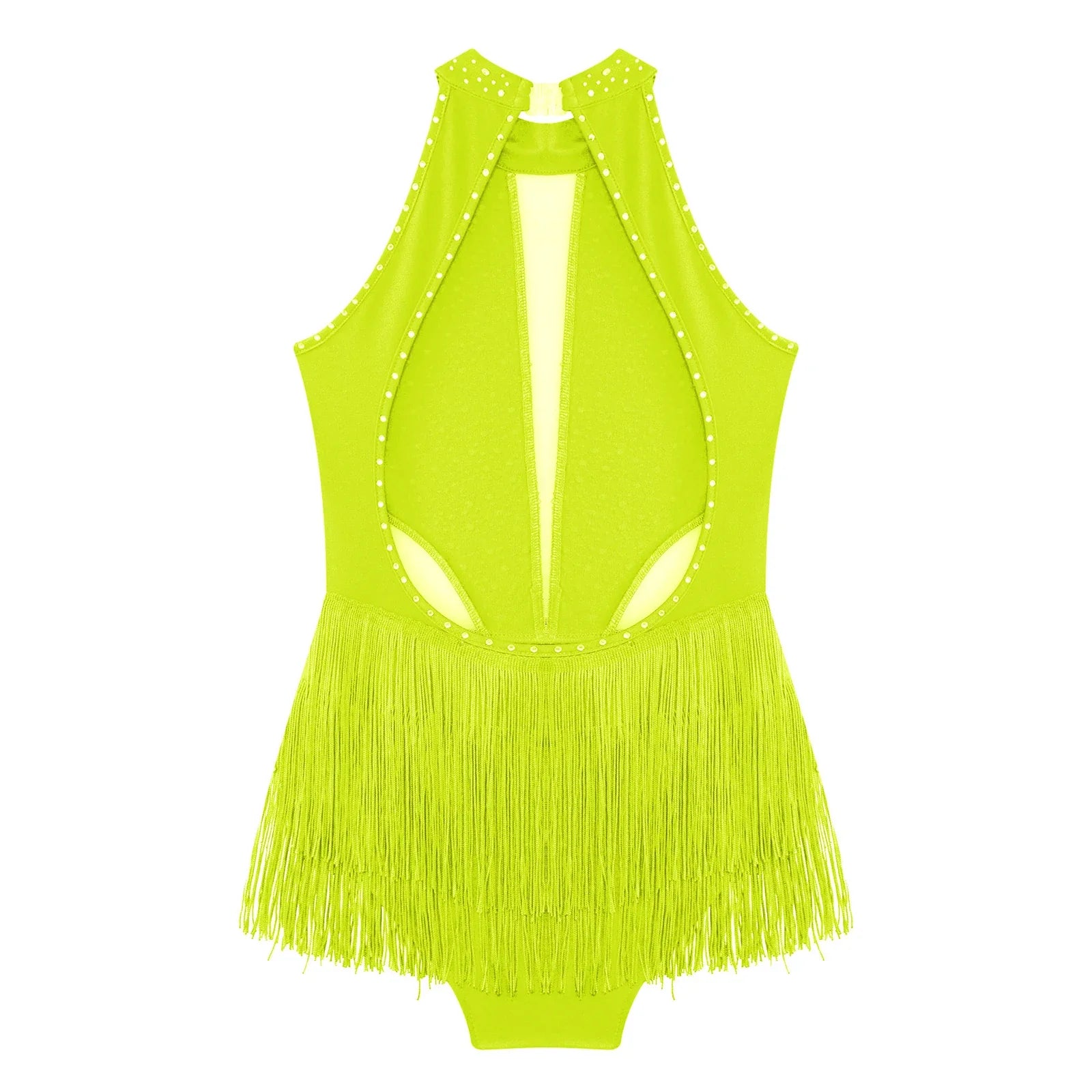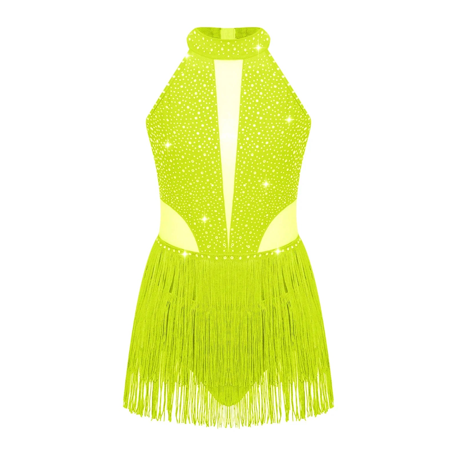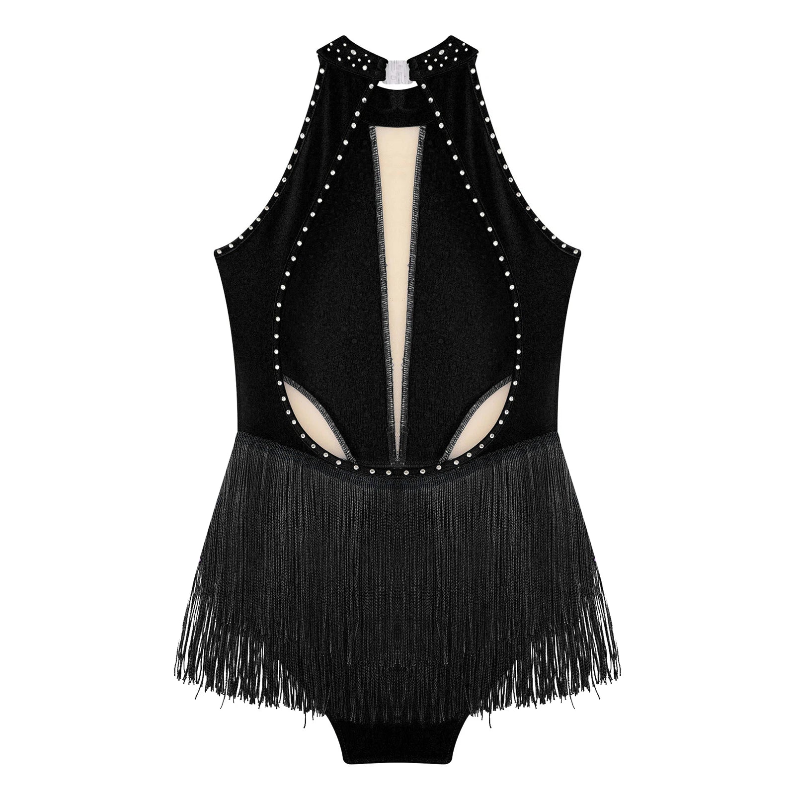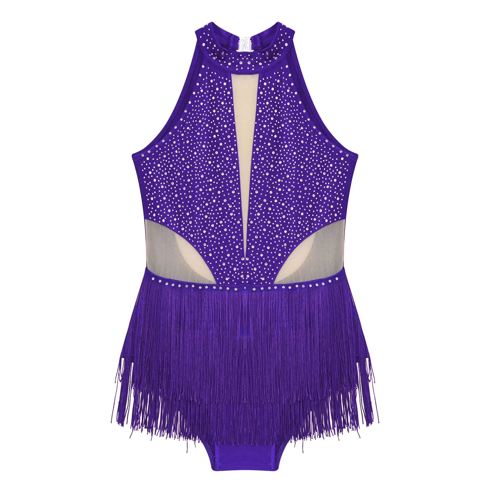 Enhance your girl's performance with this sparkling rhinestone leotard. The nude sheer mesh and high-density tassels create a sense of movement, adding to the beauty of her dance. Designed for flexibility and comfort, this leotard is perfect for Latin Dance, tango, rumba, samba, cha-cha, and other special occasions. With a backless and mock neck design, it's easy to wear and guarantees a stunning appearance on stage.