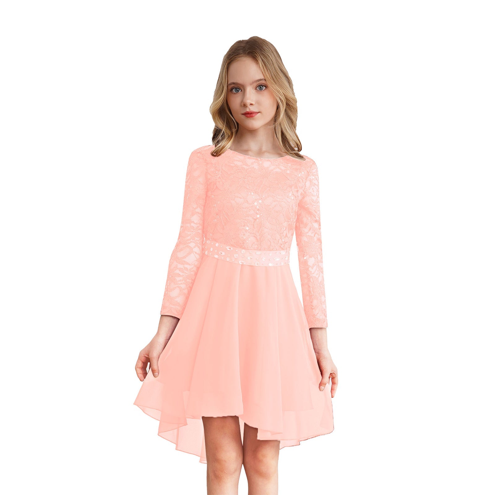 Girls Lace Chiffon Long Sleeve High-Rhinestone Sash Dress (Age 6-16 YRS)