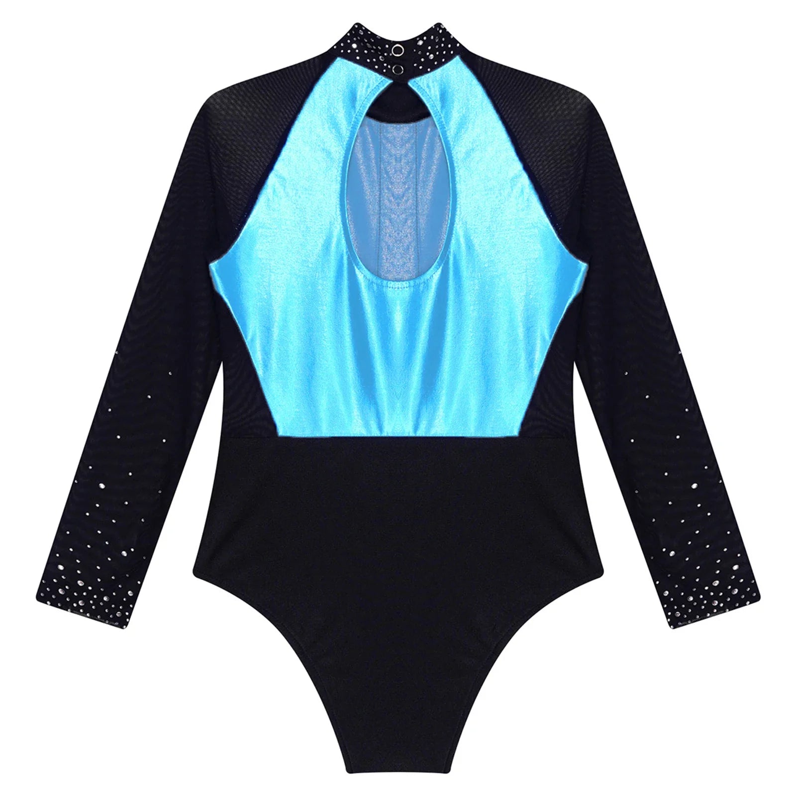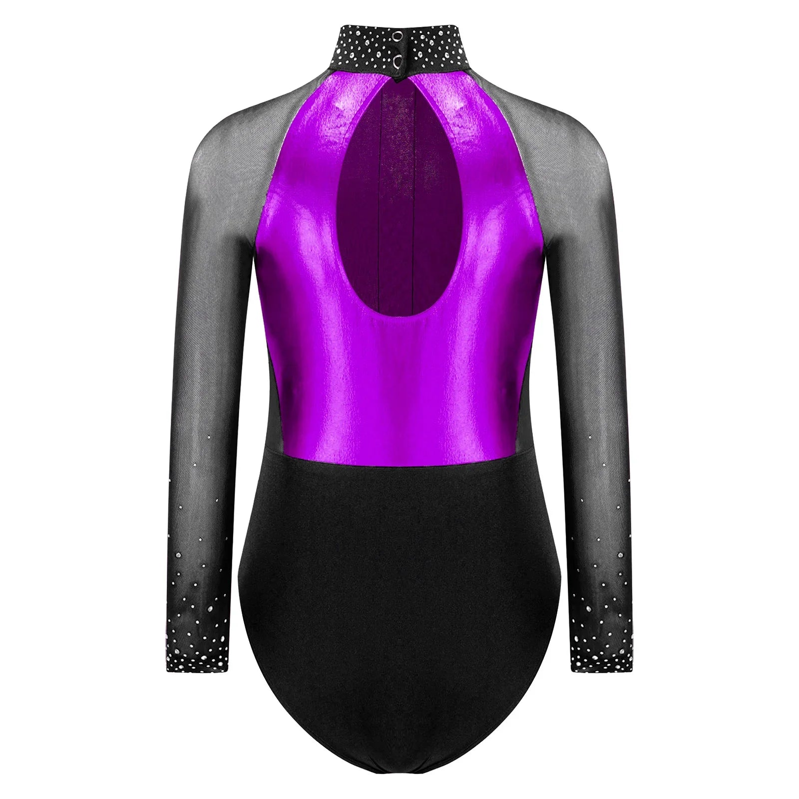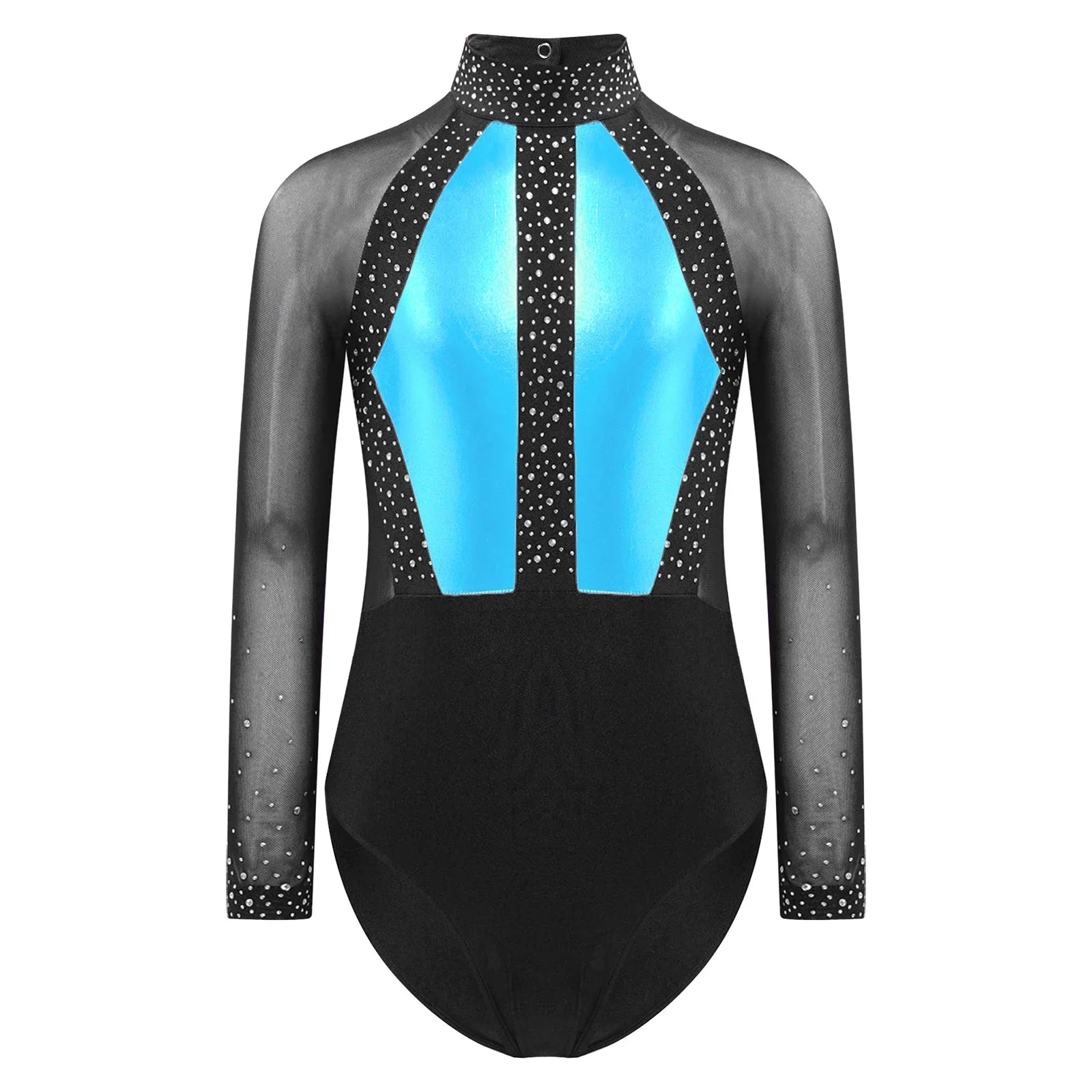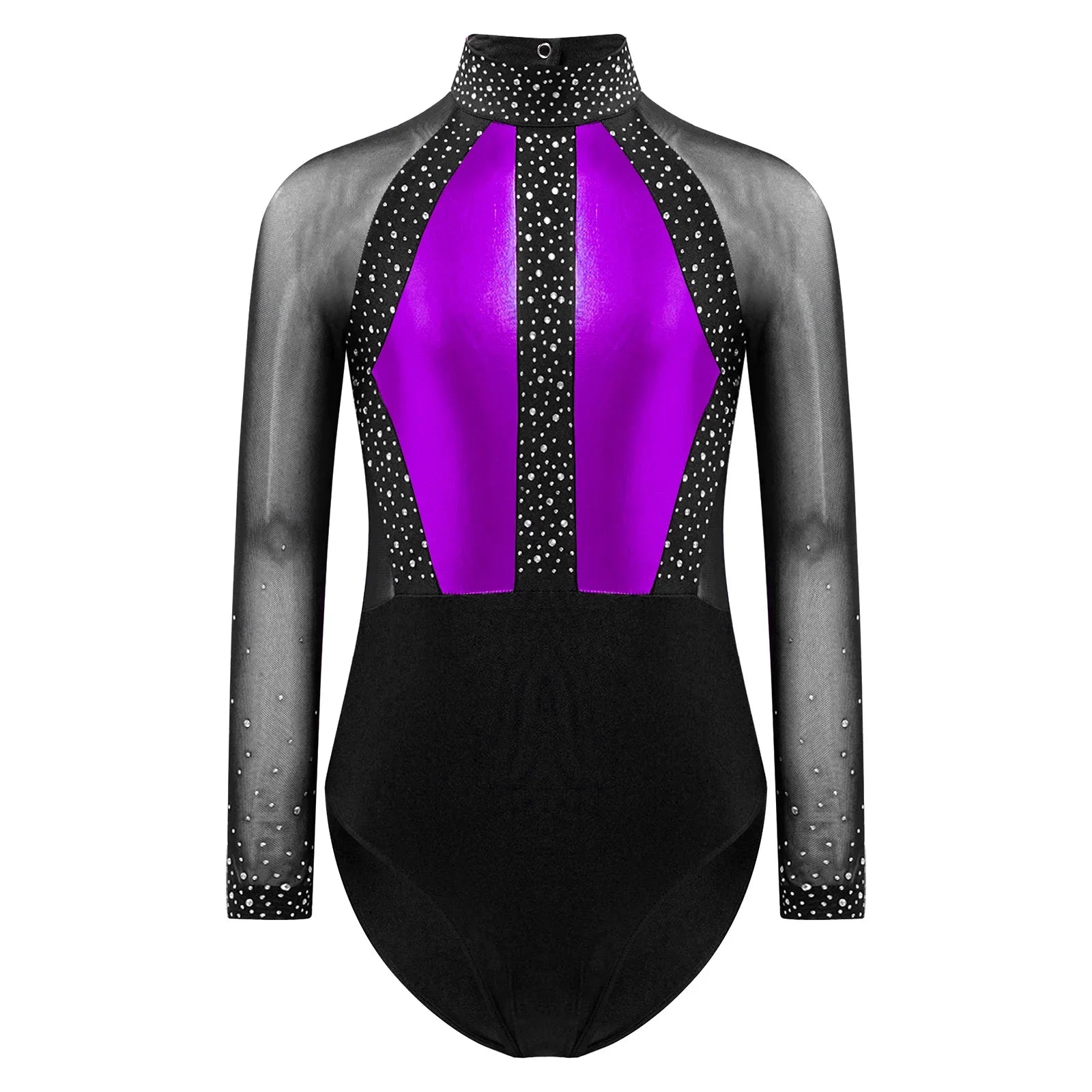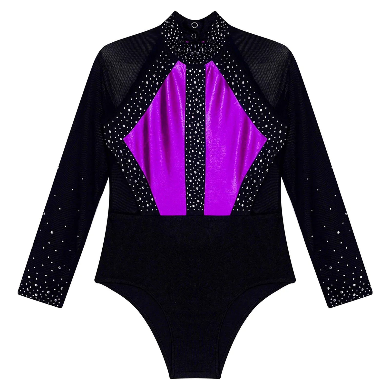 This long sleeve leotard guarantees maximum flexibility during jumps, dances, and tumbling. With a triangular fit and wide crotch area, it allows for optimal stretching while working out. The metallic color block design features sparkling rhinestones that add brightness to any performance. The sheer mesh material, along with a keyhole back and mock neck with press buttons, makes this leotard easy to wear. It is suitable for various activities such as rhythmic gymnastics, figure skating, acrobatics, dance, competitions, and stage performances.