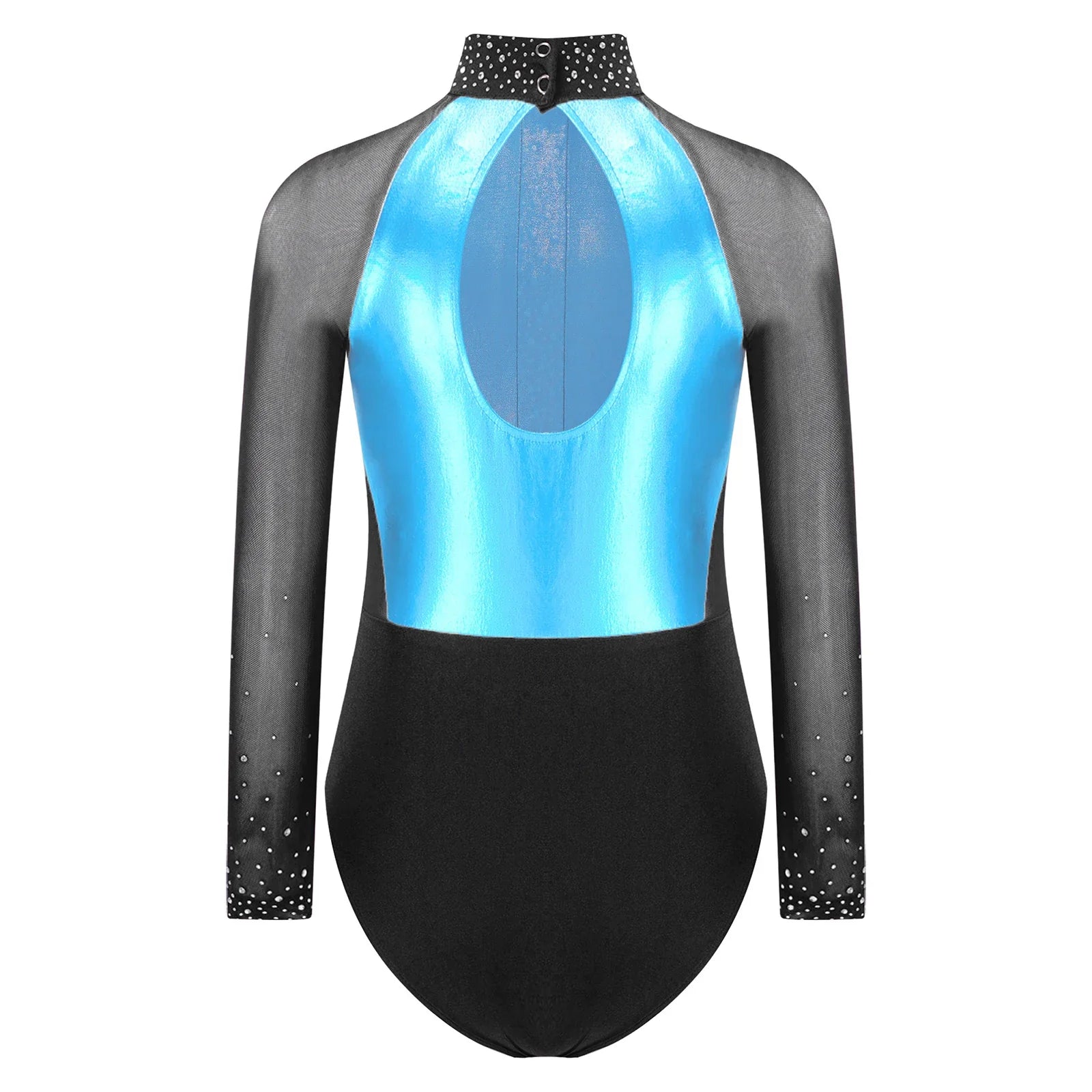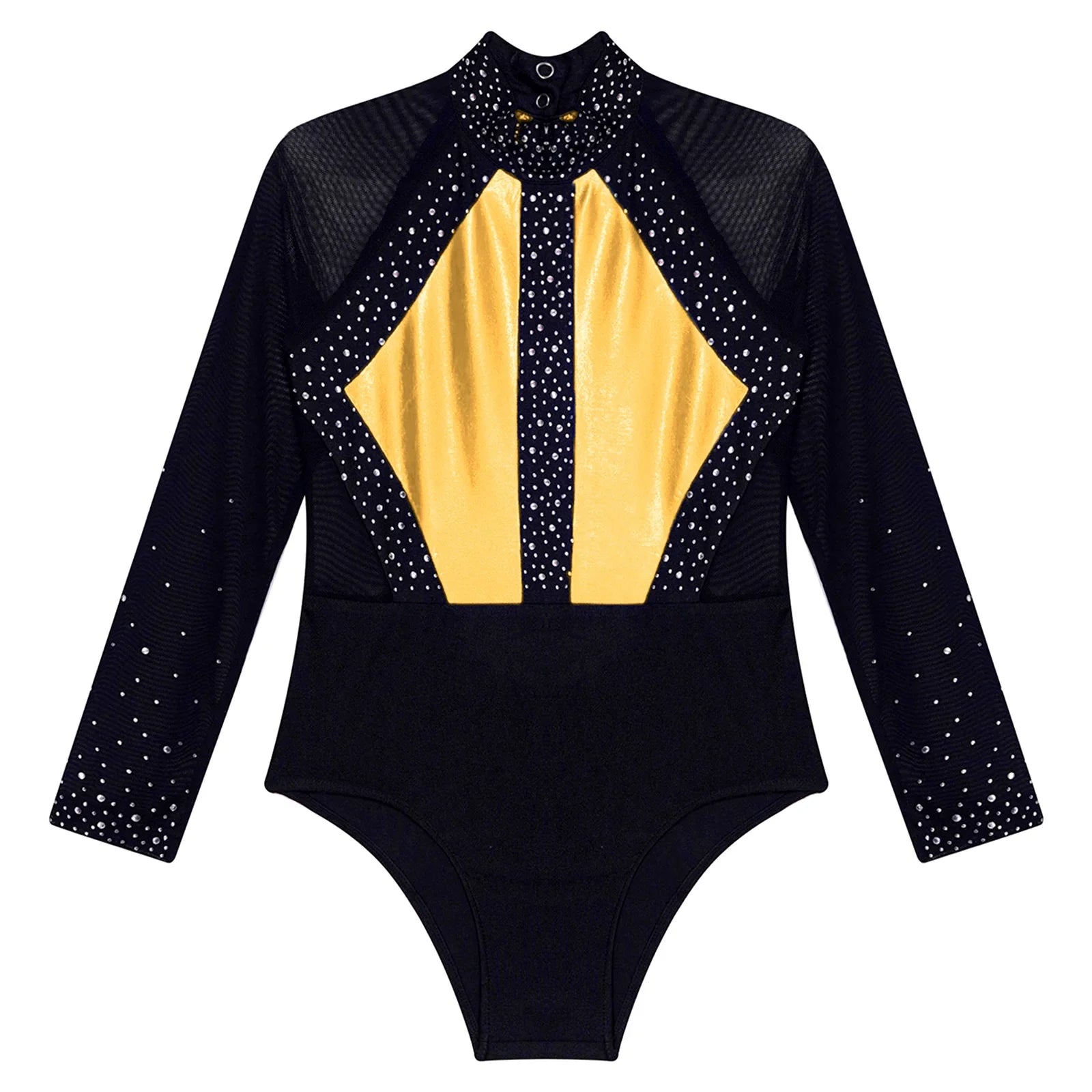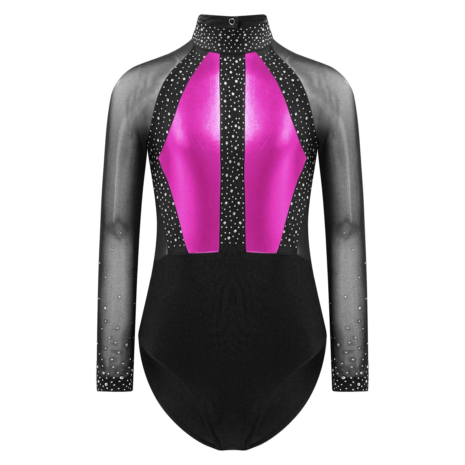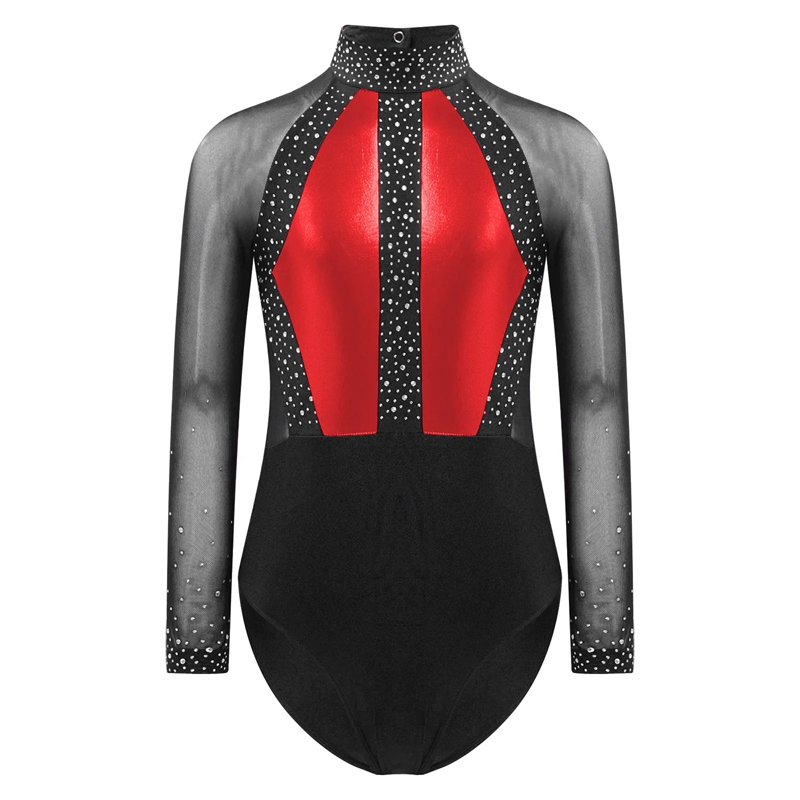 This long sleeve leotard guarantees maximum flexibility during jumps, dances, and tumbling. With a triangular fit and wide crotch area, it allows for optimal stretching while working out. The metallic color block design features sparkling rhinestones that add brightness to any performance. The sheer mesh material, along with a keyhole back and mock neck with press buttons, makes this leotard easy to wear. It is suitable for various activities such as rhythmic gymnastics, figure skating, acrobatics, dance, competitions, and stage performances.