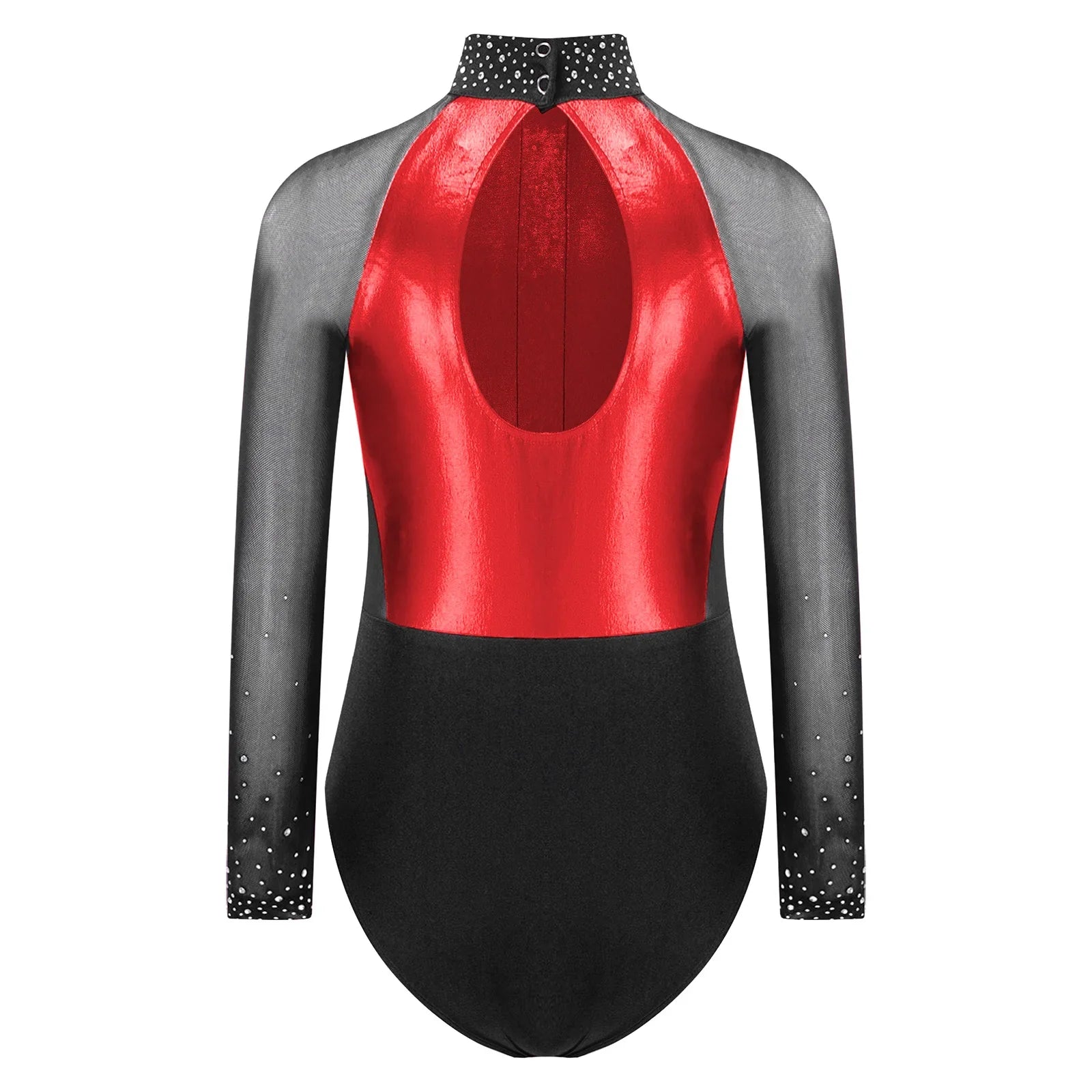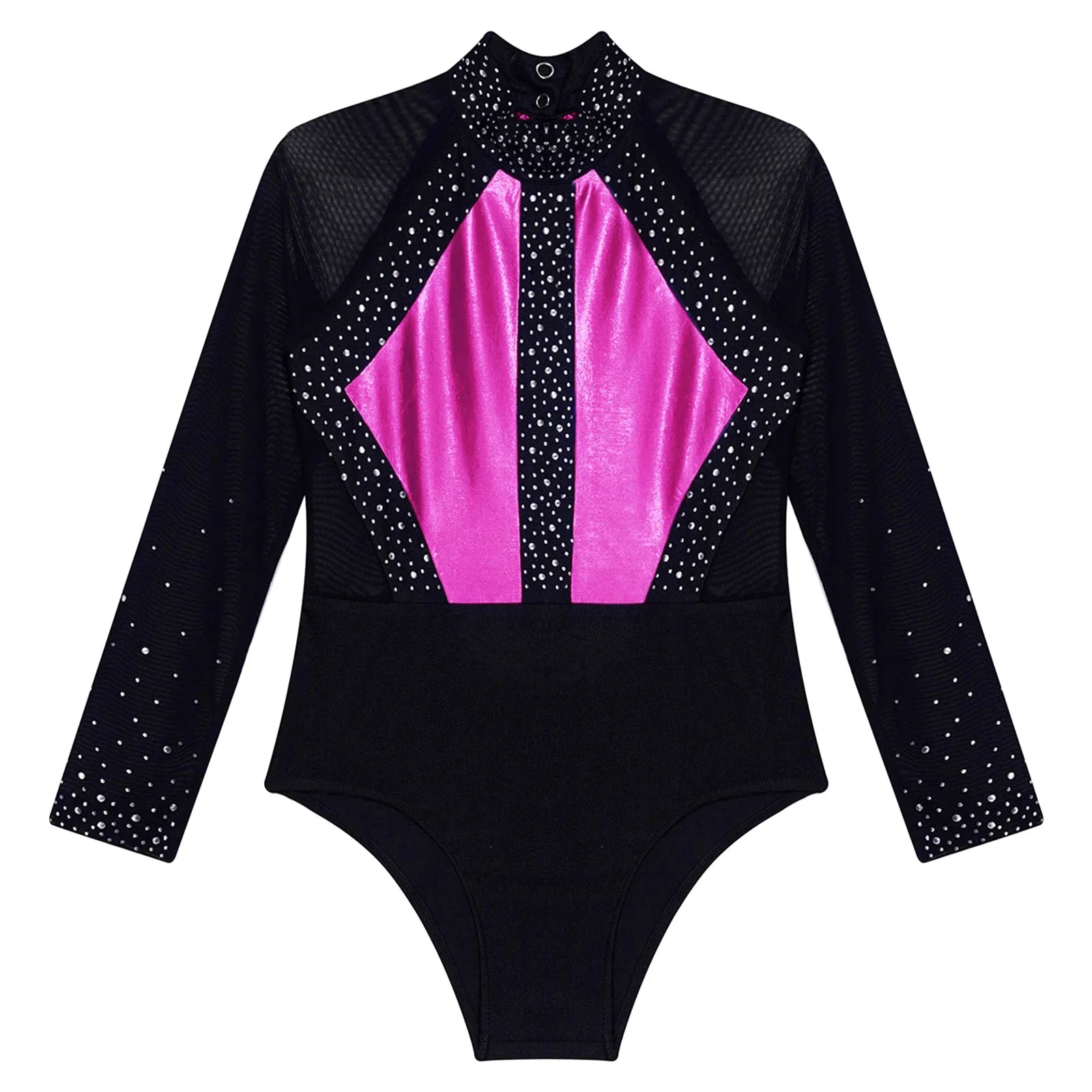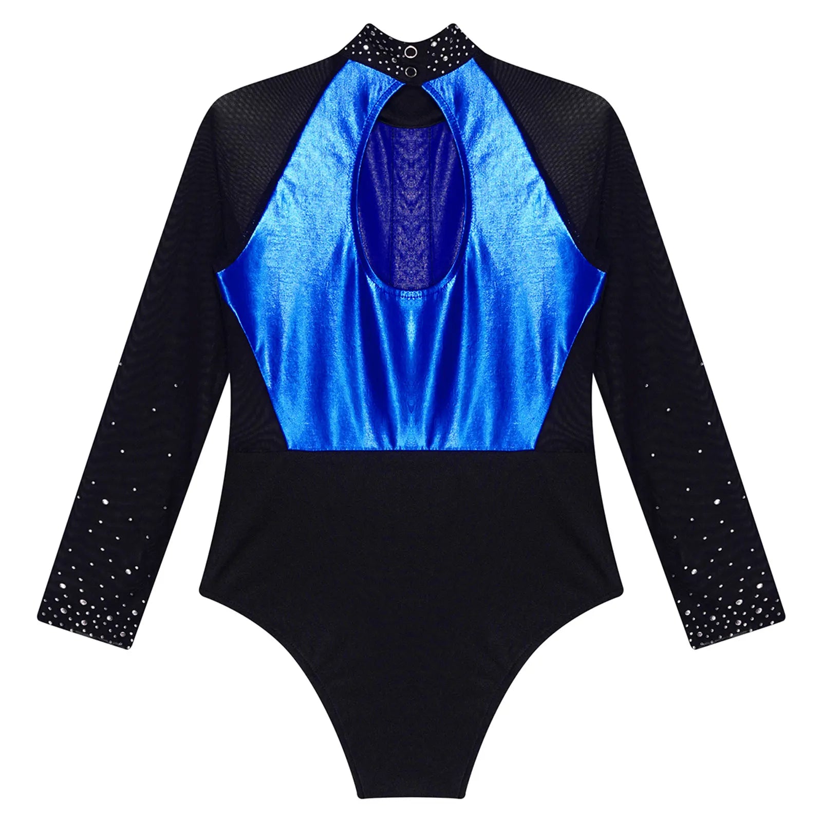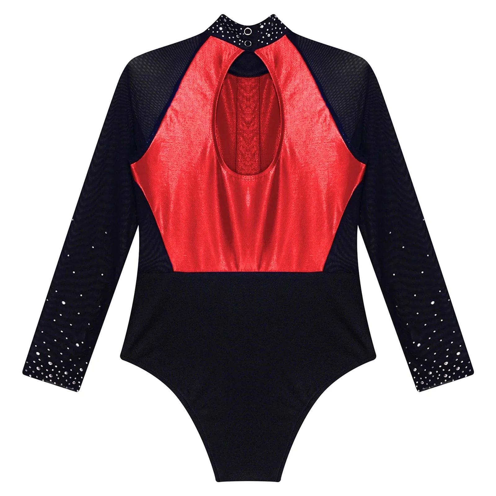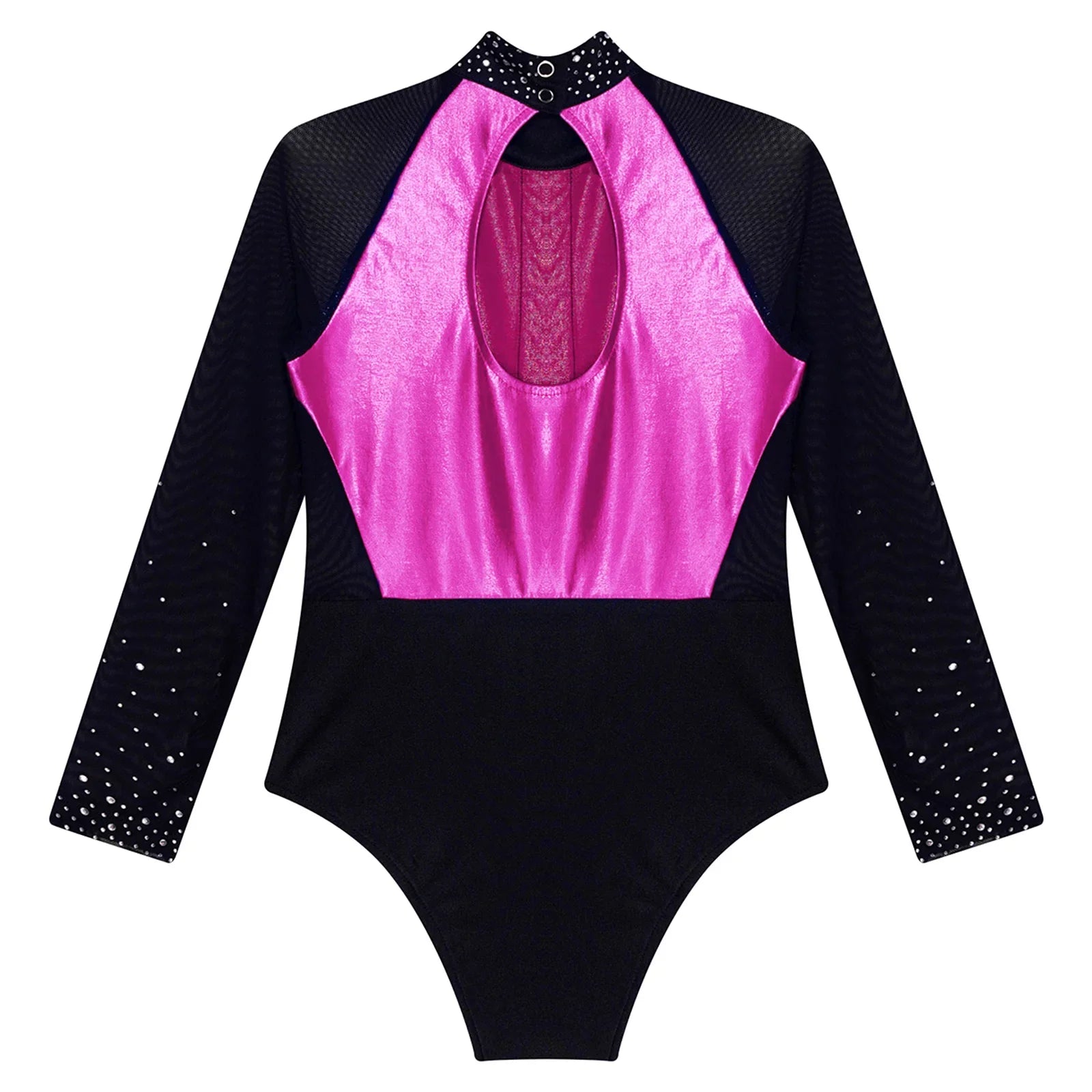 This long sleeve leotard guarantees maximum flexibility during jumps, dances, and tumbling. With a triangular fit and wide crotch area, it allows for optimal stretching while working out. The metallic color block design features sparkling rhinestones that add brightness to any performance. The sheer mesh material, along with a keyhole back and mock neck with press buttons, makes this leotard easy to wear. It is suitable for various activities such as rhythmic gymnastics, figure skating, acrobatics, dance, competitions, and stage performances.