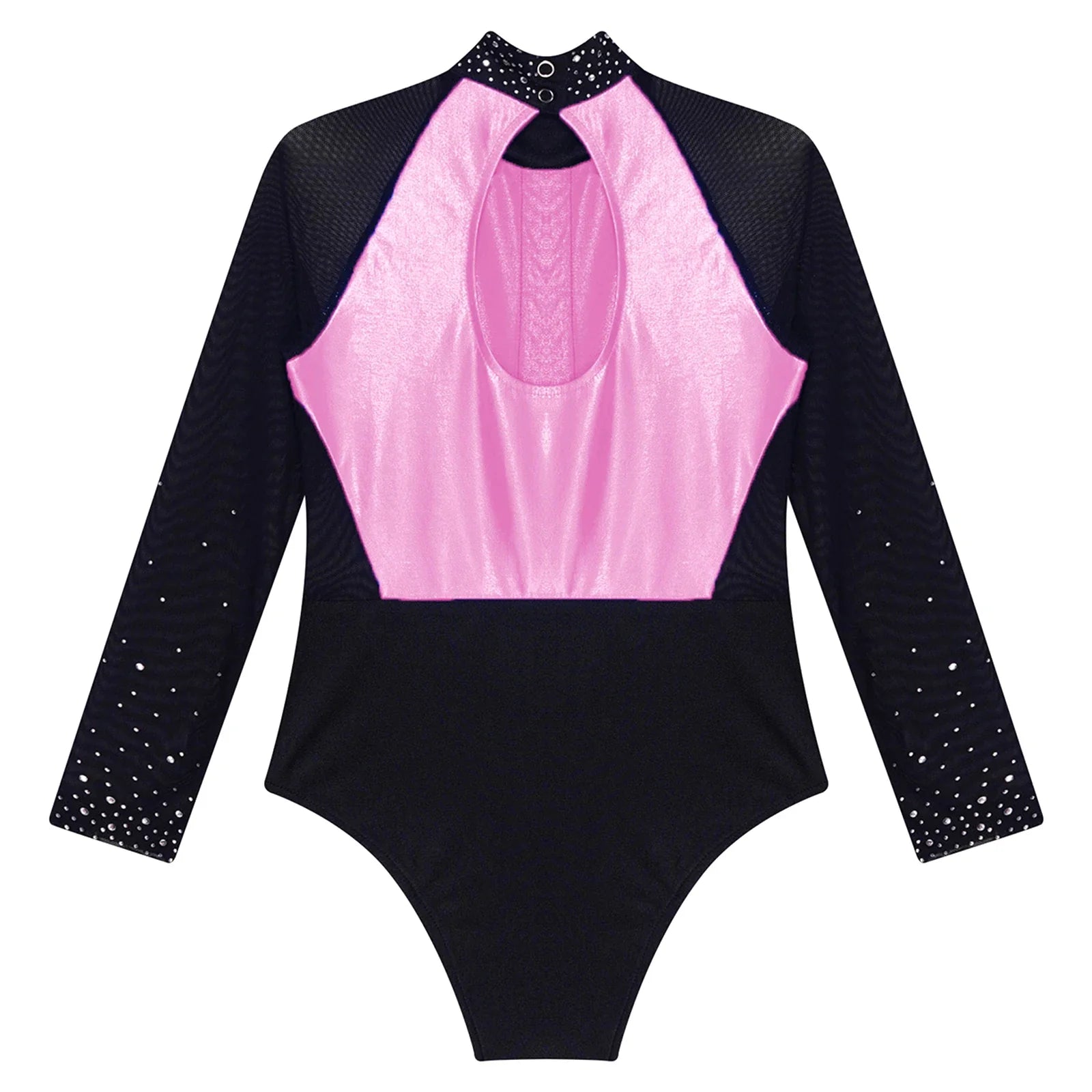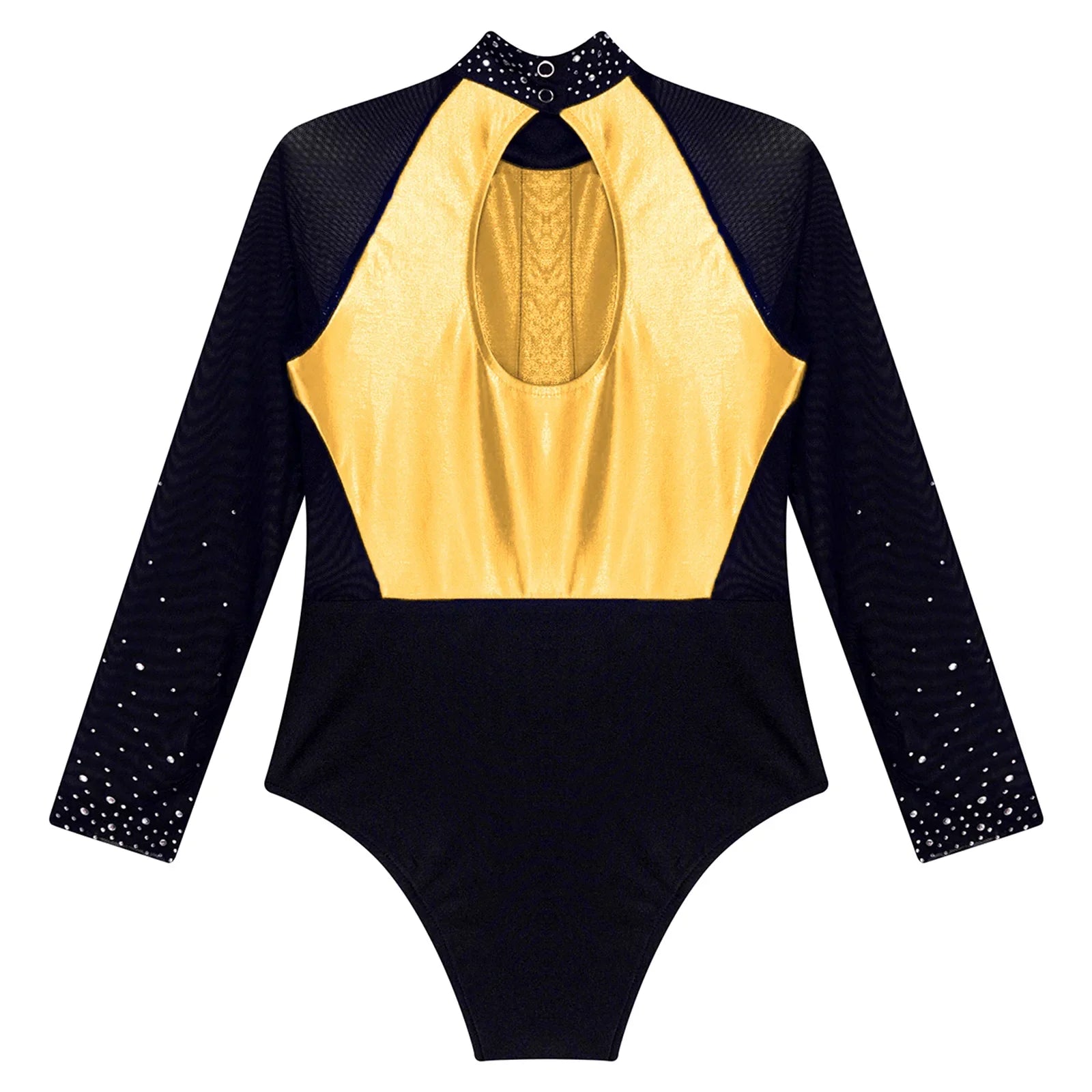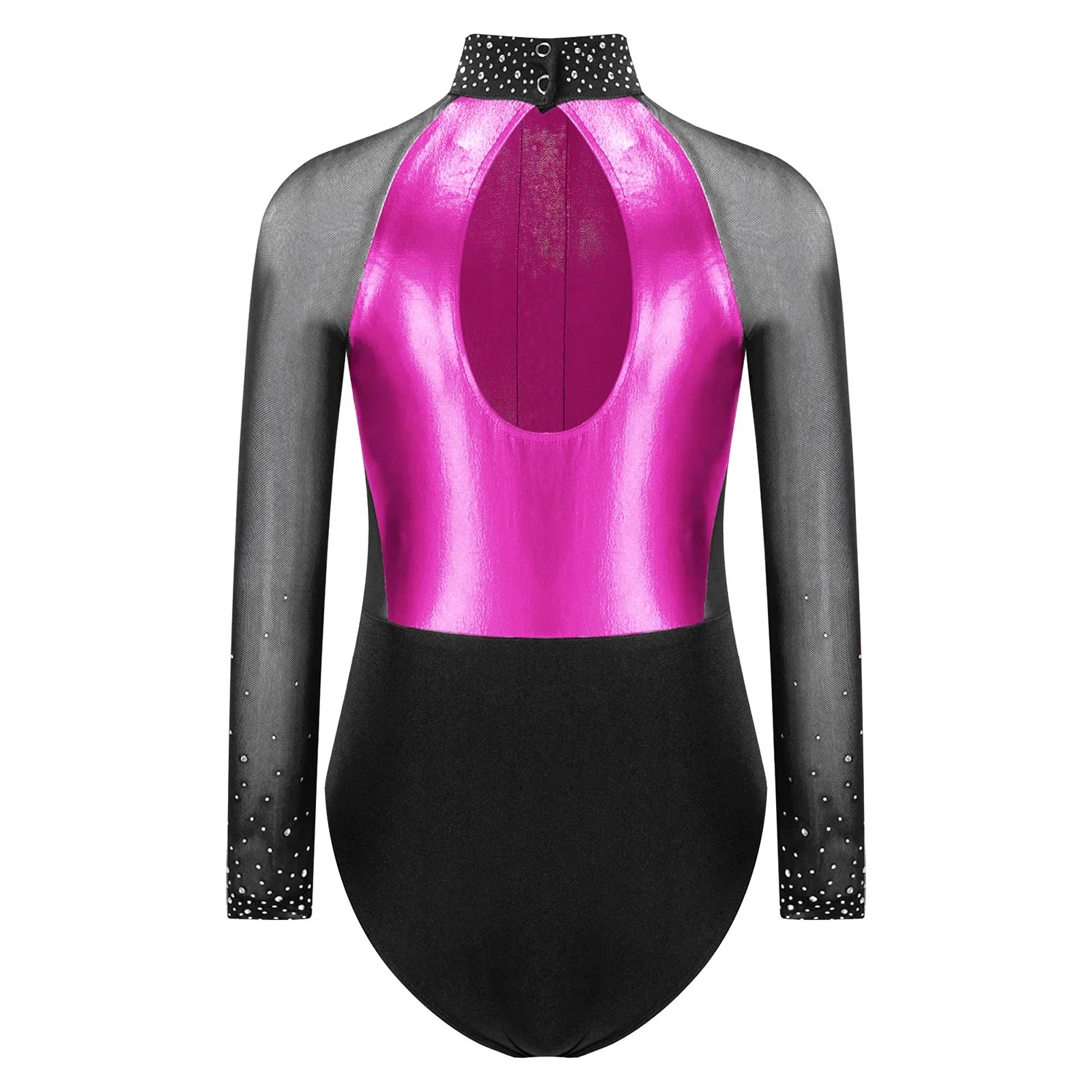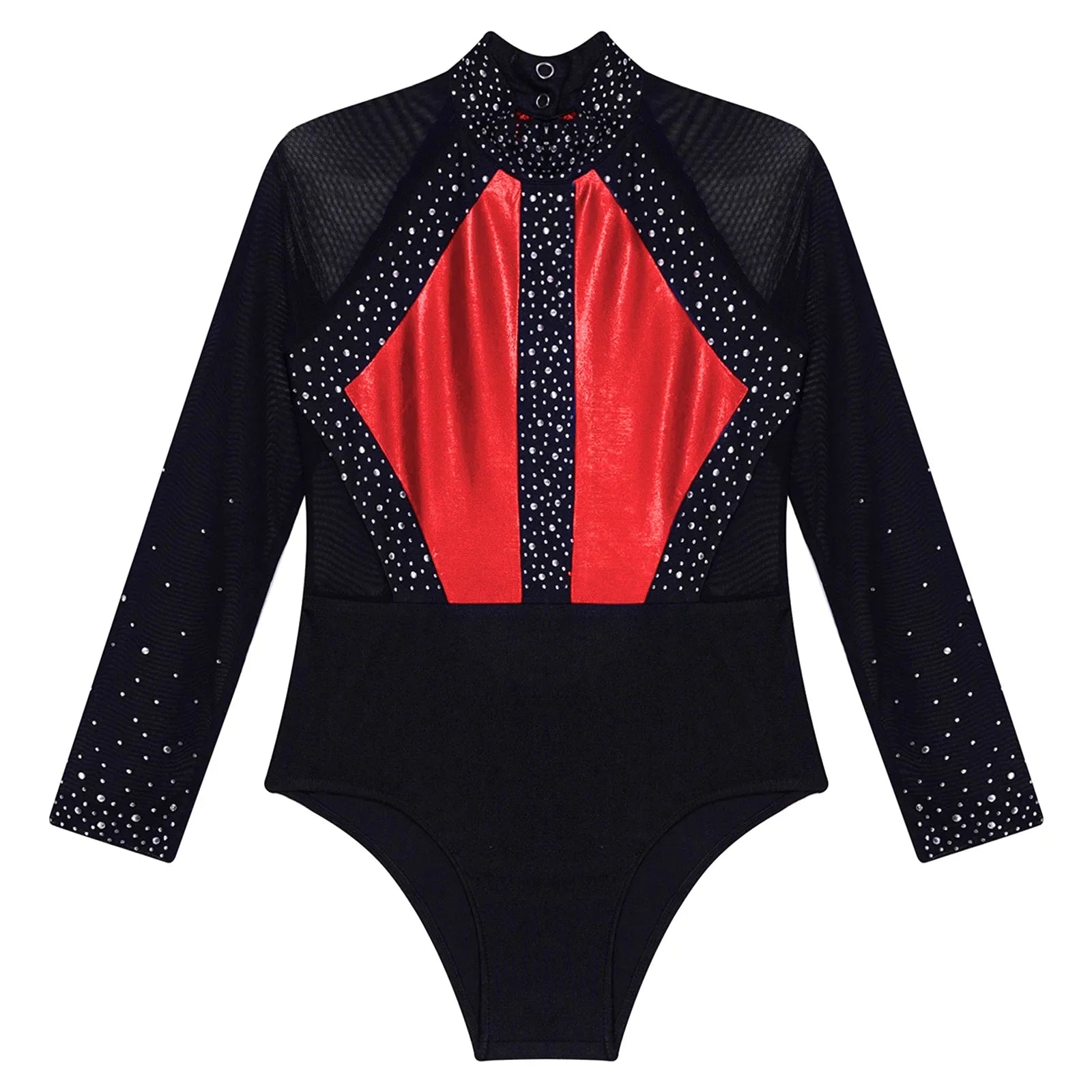 This long sleeve leotard guarantees maximum flexibility during jumps, dances, and tumbling. With a triangular fit and wide crotch area, it allows for optimal stretching while working out. The metallic color block design features sparkling rhinestones that add brightness to any performance. The sheer mesh material, along with a keyhole back and mock neck with press buttons, makes this leotard easy to wear. It is suitable for various activities such as rhythmic gymnastics, figure skating, acrobatics, dance, competitions, and stage performances.