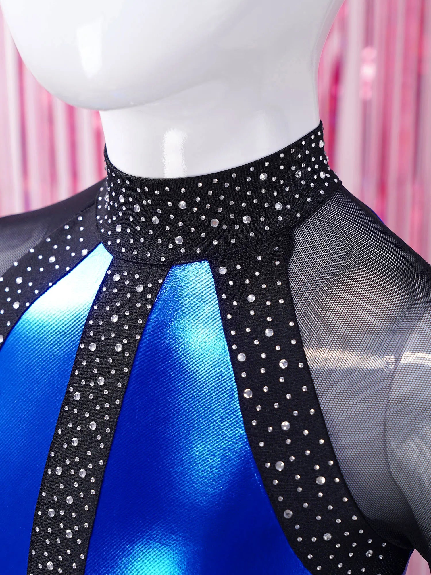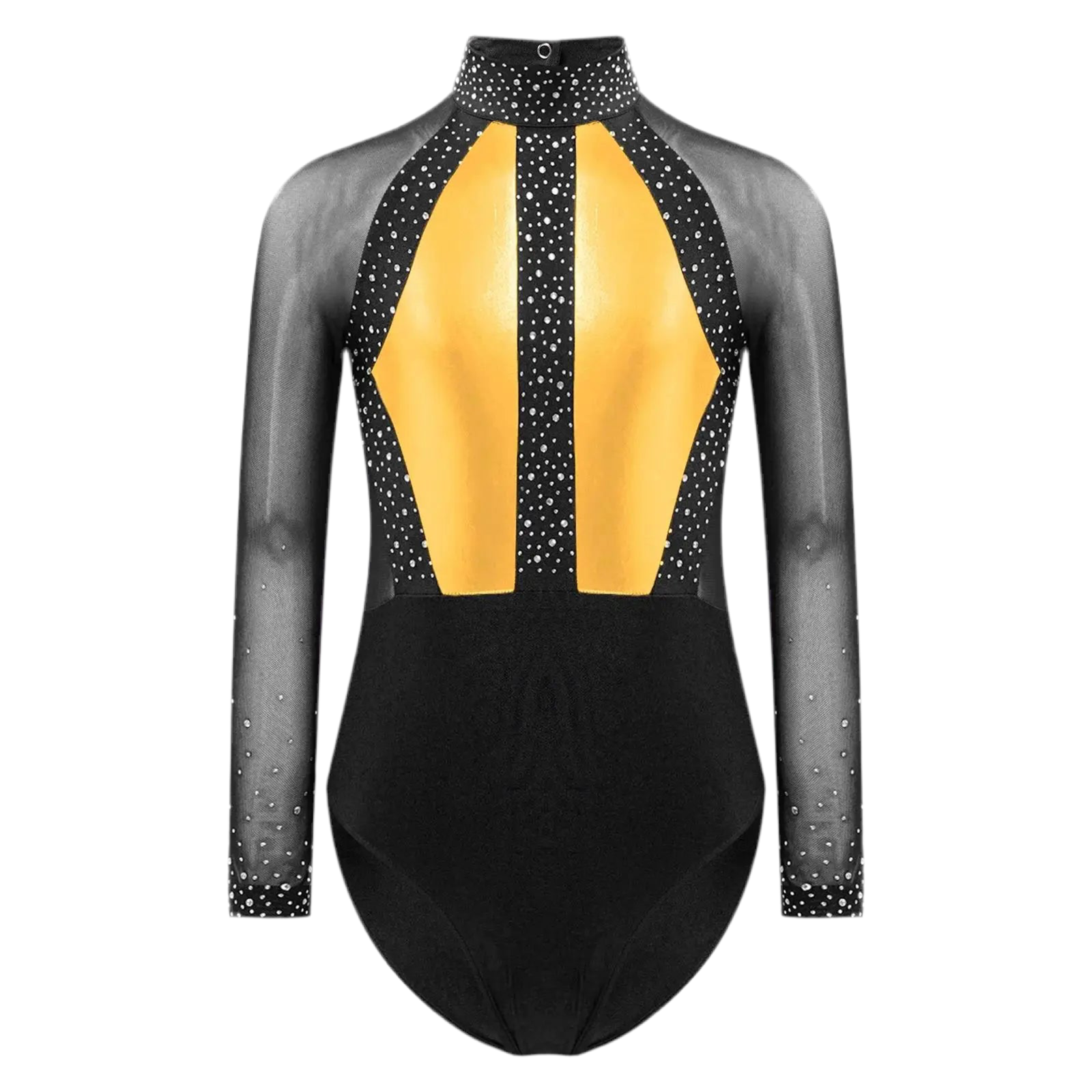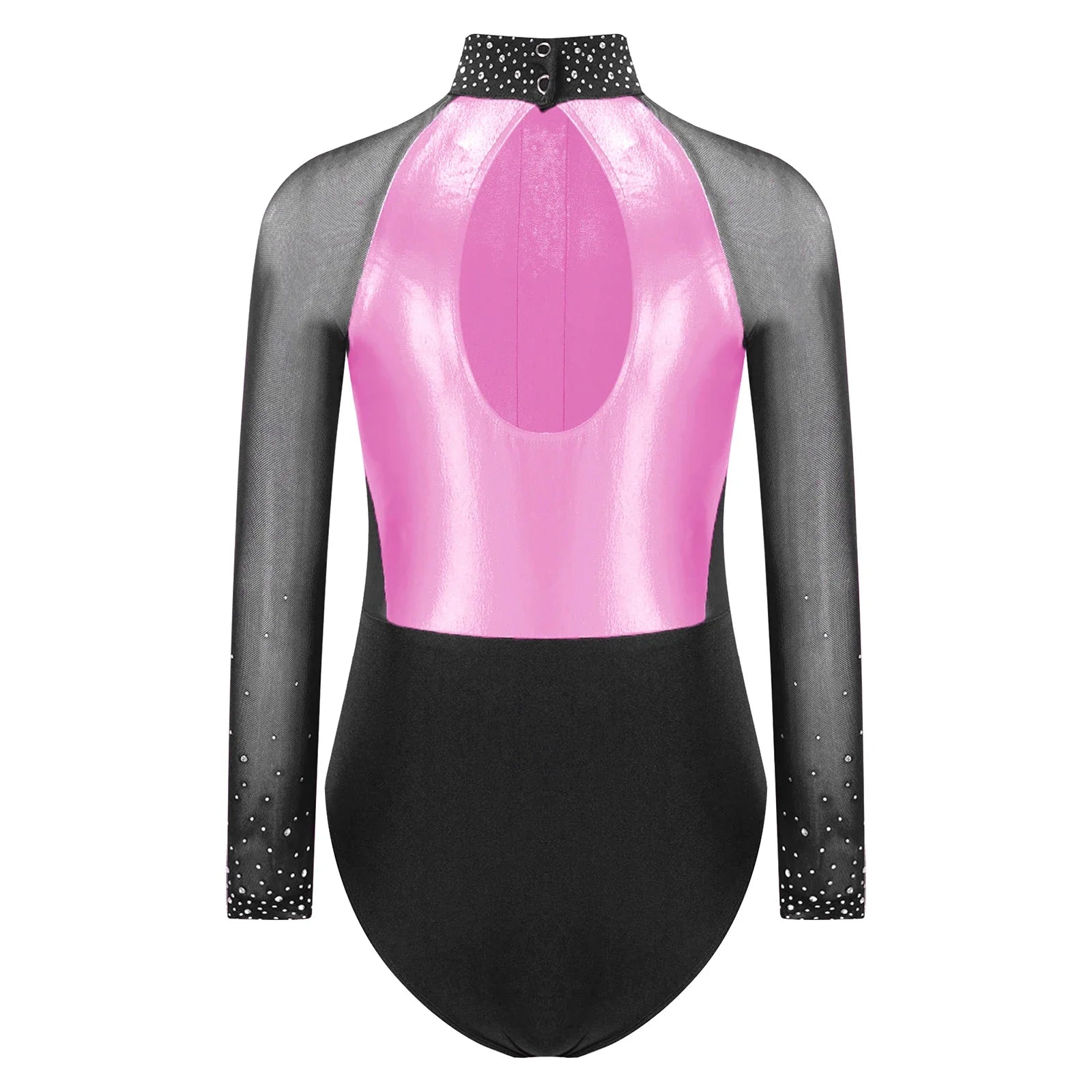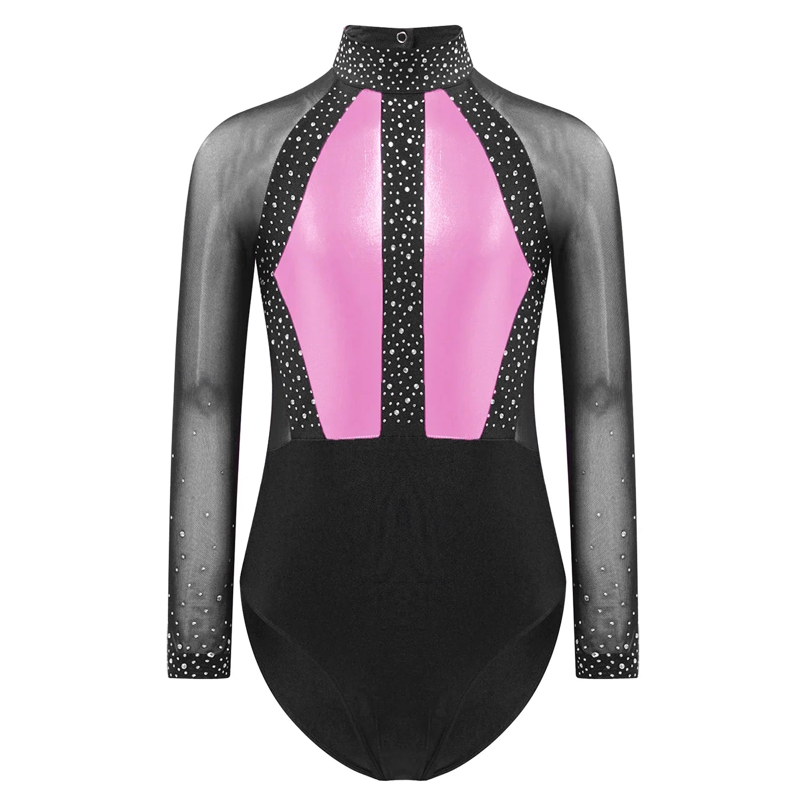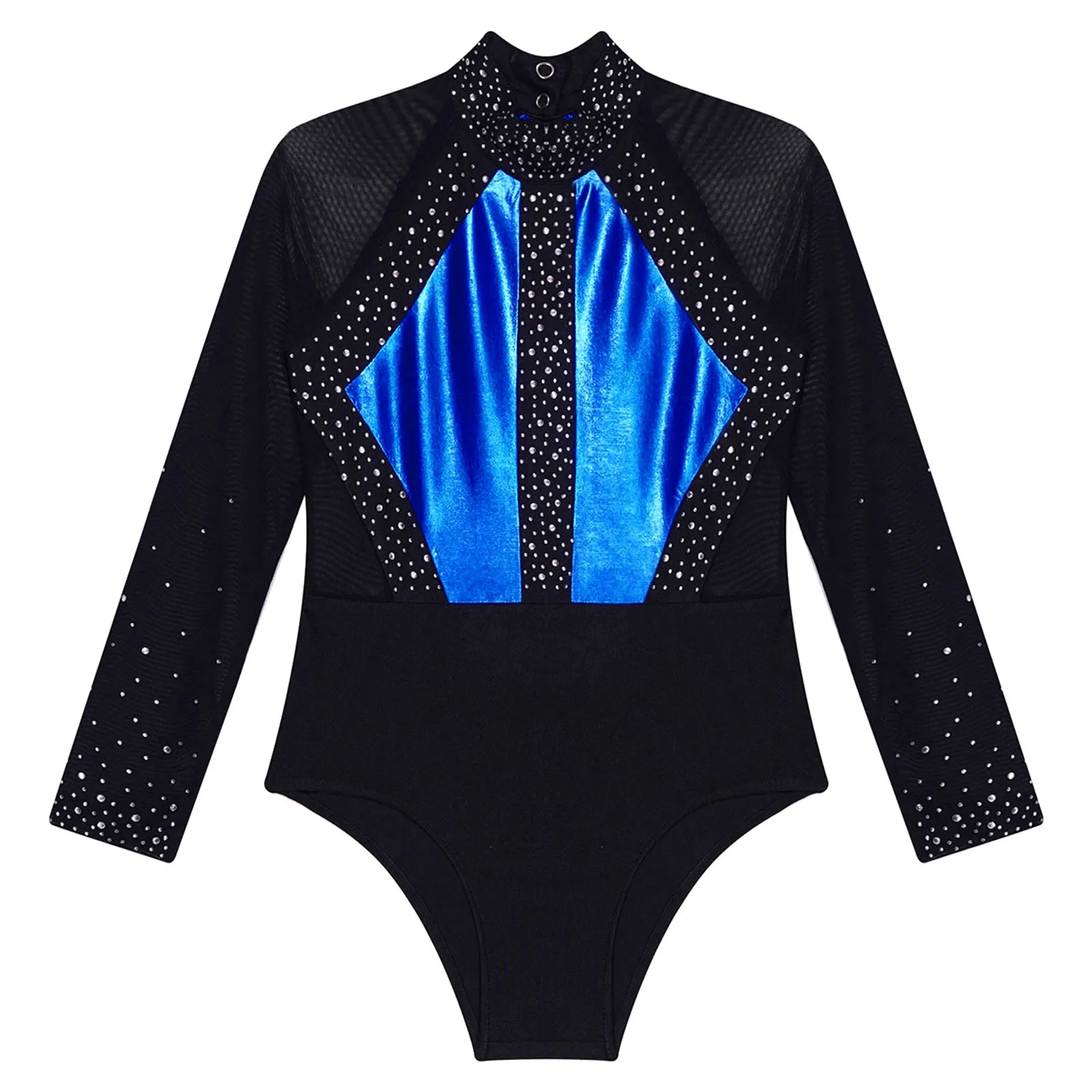 This long sleeve leotard guarantees maximum flexibility during jumps, dances, and tumbling. With a triangular fit and wide crotch area, it allows for optimal stretching while working out. The metallic color block design features sparkling rhinestones that add brightness to any performance. The sheer mesh material, along with a keyhole back and mock neck with press buttons, makes this leotard easy to wear. It is suitable for various activities such as rhythmic gymnastics, figure skating, acrobatics, dance, competitions, and stage performances.