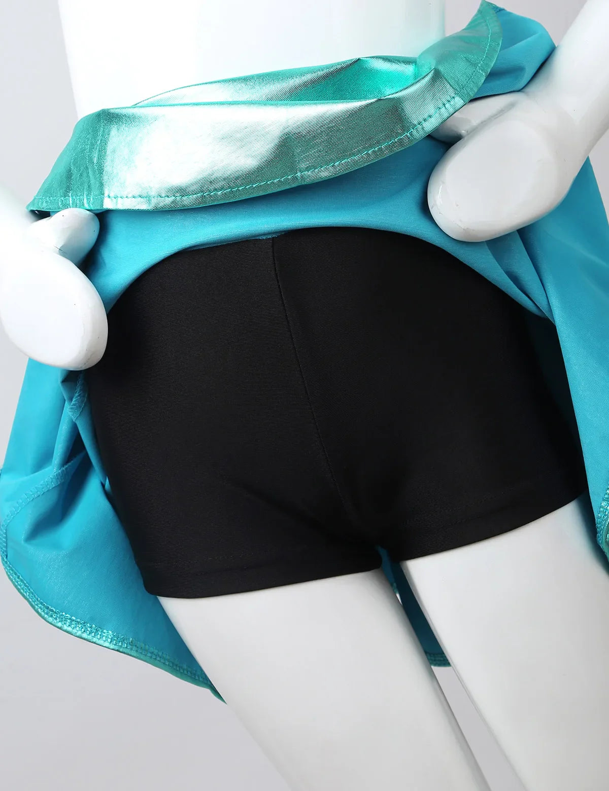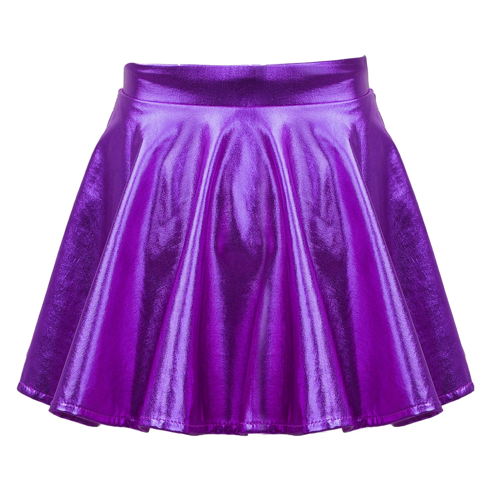 This skirt is constructed from a blend of polyester and spandex, and should be hand washed for best results. The age ranges listed in the size table are for reference only. Its flared A-line silhouette features a high-rise waistband with full elastic for a comfortable fit, and boasts a glossy metallic finish. Hidden shorts are included for modesty and maximum comfort, ensuring worry-free play, cheer, dance, cartwheeling, or twirling. A must-have for any dancer or gymnast, it's a great addition to a dance recital or cheering competition wardrobe.