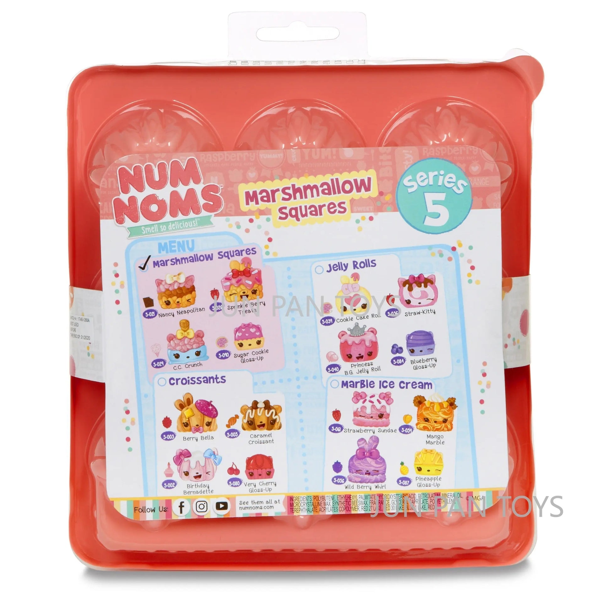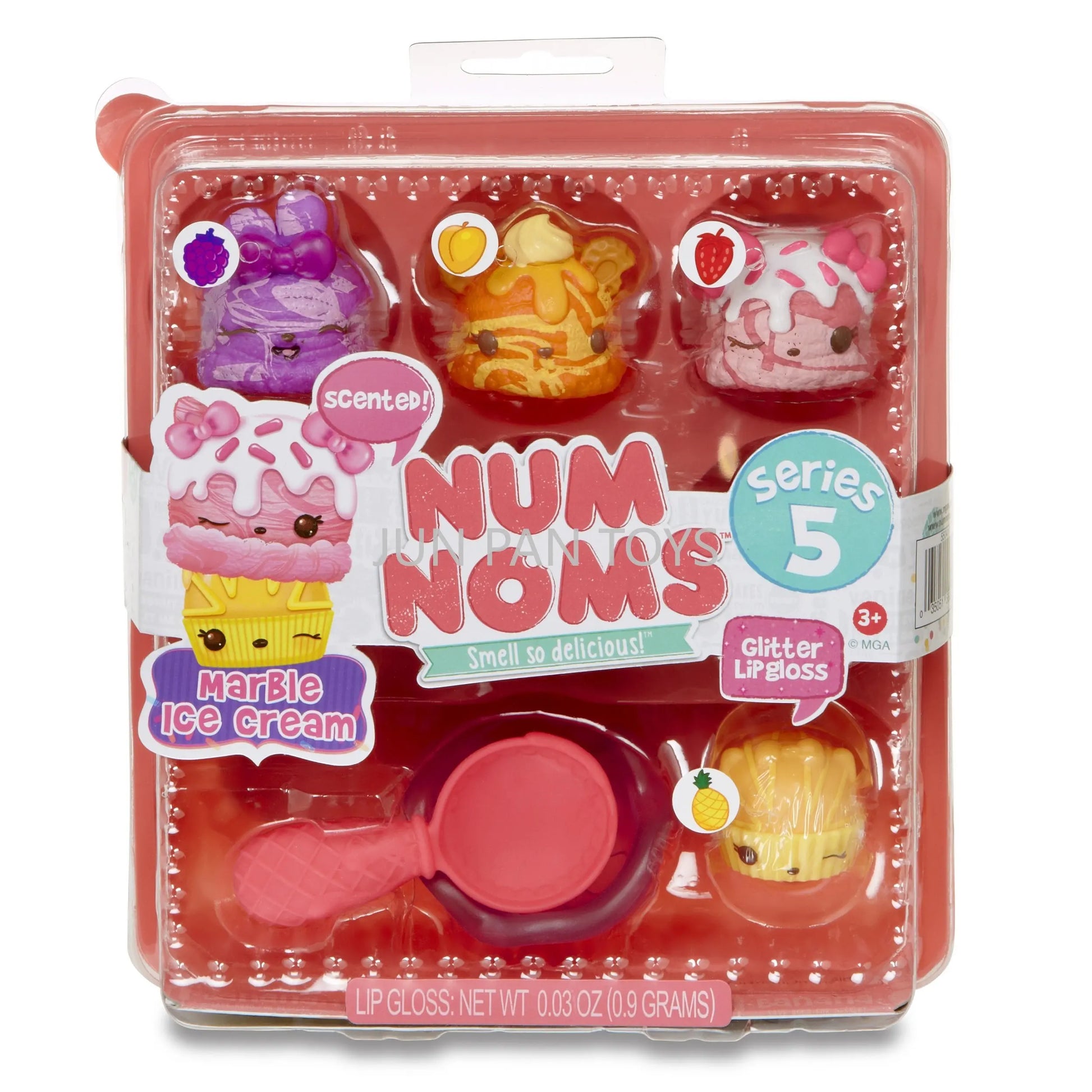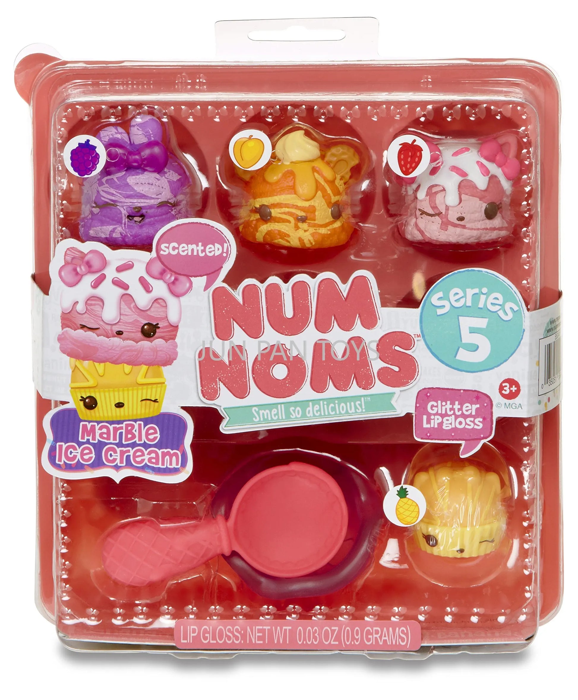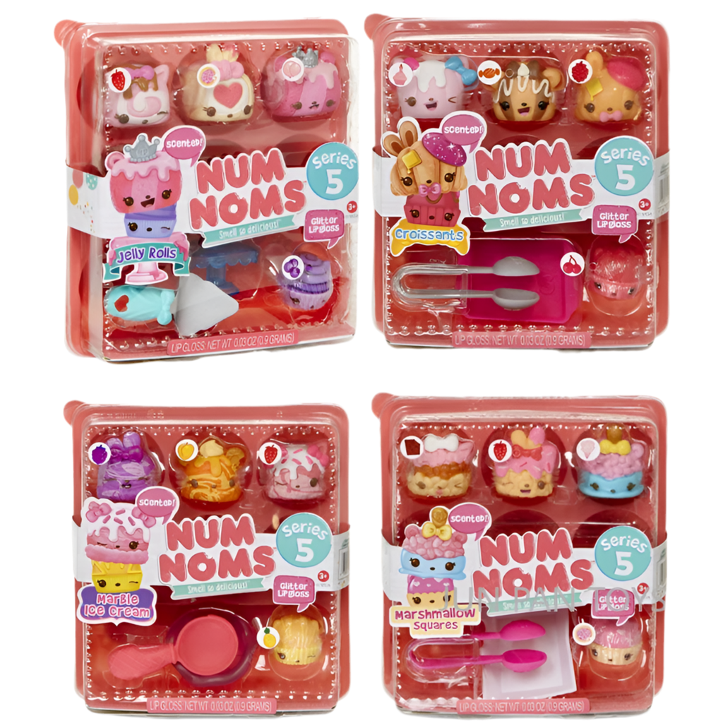 The Num Noms Smell So Delicious Starter Pack Series 5 Toy includes three scented Nums: Nancy Neapolitan, sprinkle berry treats, and C.C. Crunch. Each food Package is packaged together in a themed meal inside an egg carton to-go box, and comes with one flavored glitter lip gloss Nom: sugar cookie gloss-up, tongs, and food tray accessories. Additionally, a collector's menu is included for a complete set. Look out for special edition Num Noms to add to your collection.