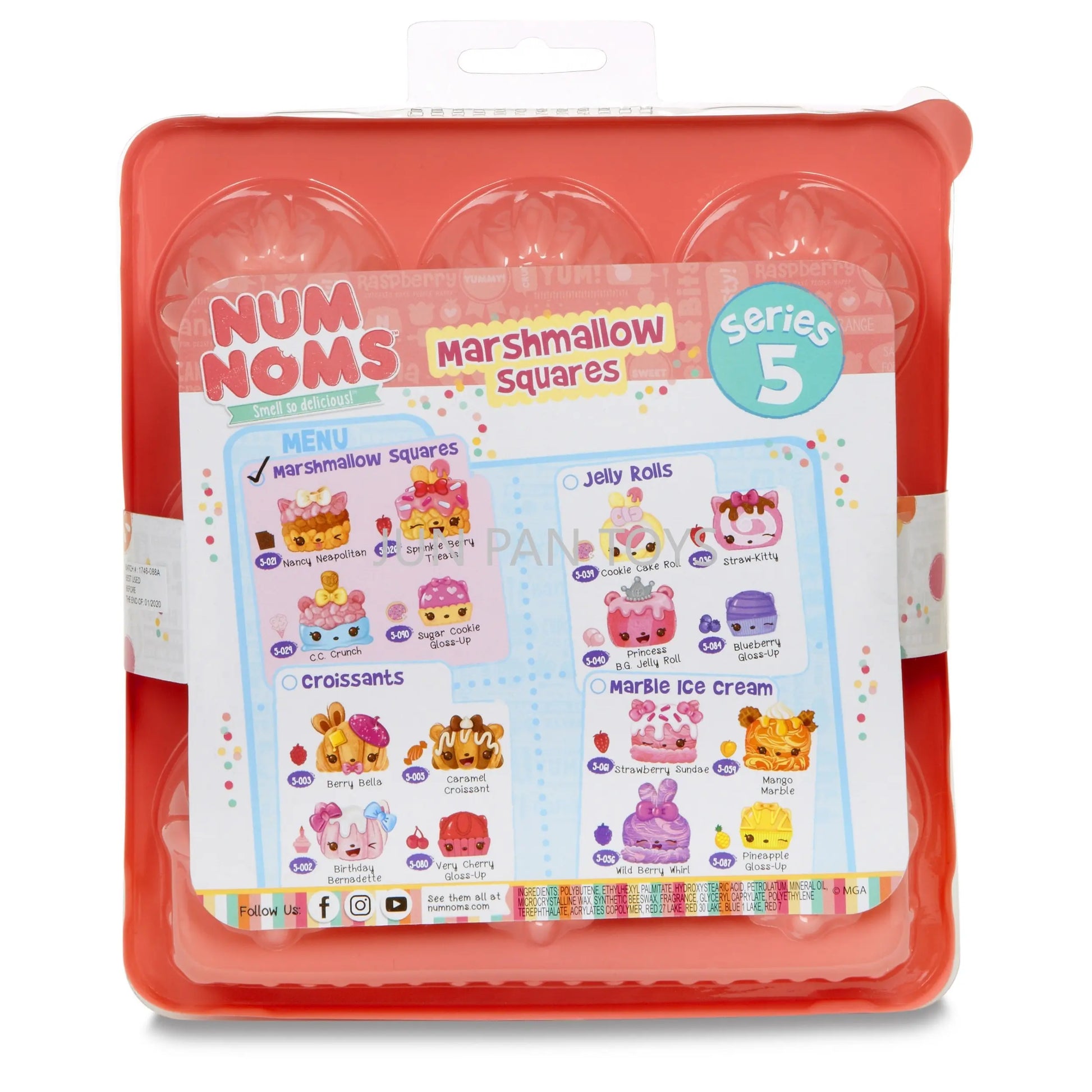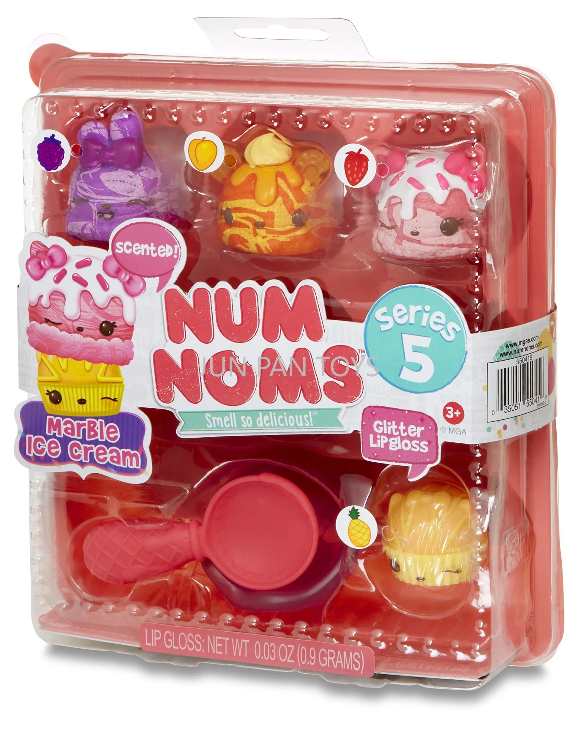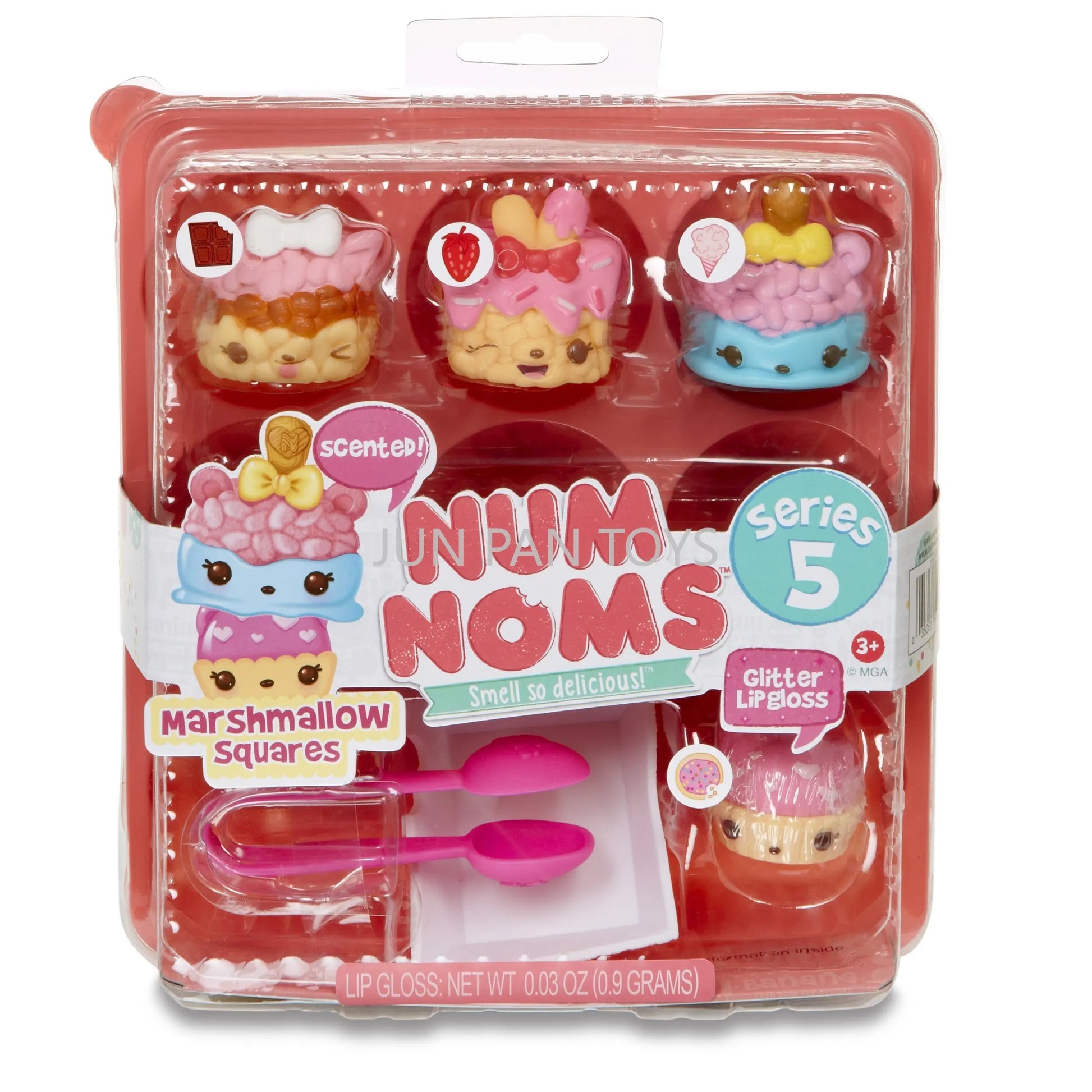 The Num Noms Smell So Delicious Starter Pack Series 5 Toy includes three scented Nums: Nancy Neapolitan, sprinkle berry treats, and C.C. Crunch. Each food Package is packaged together in a themed meal inside an egg carton to-go box, and comes with one flavored glitter lip gloss Nom: sugar cookie gloss-up, tongs, and food tray accessories. Additionally, a collector's menu is included for a complete set. Look out for special edition Num Noms to add to your collection.