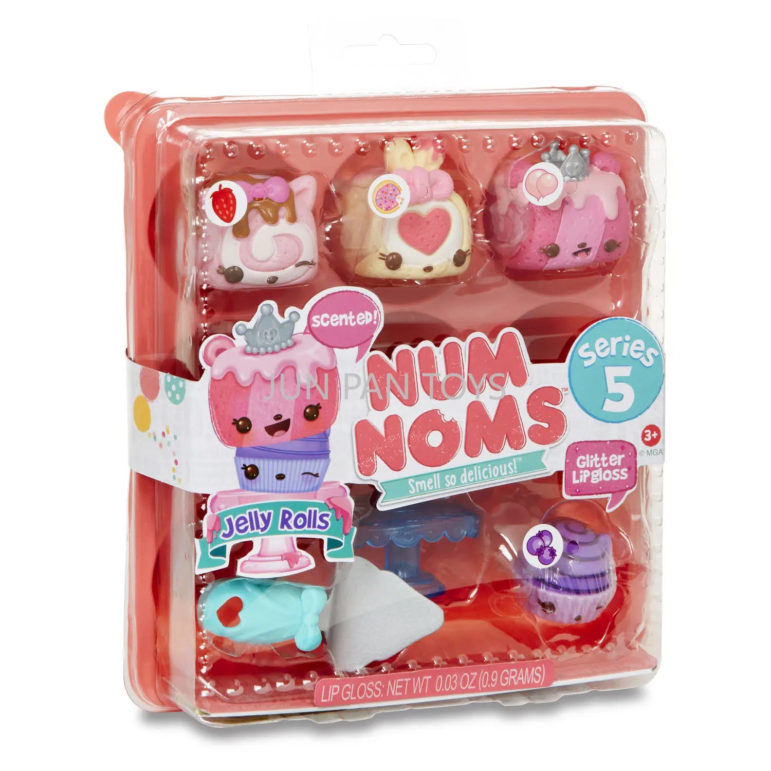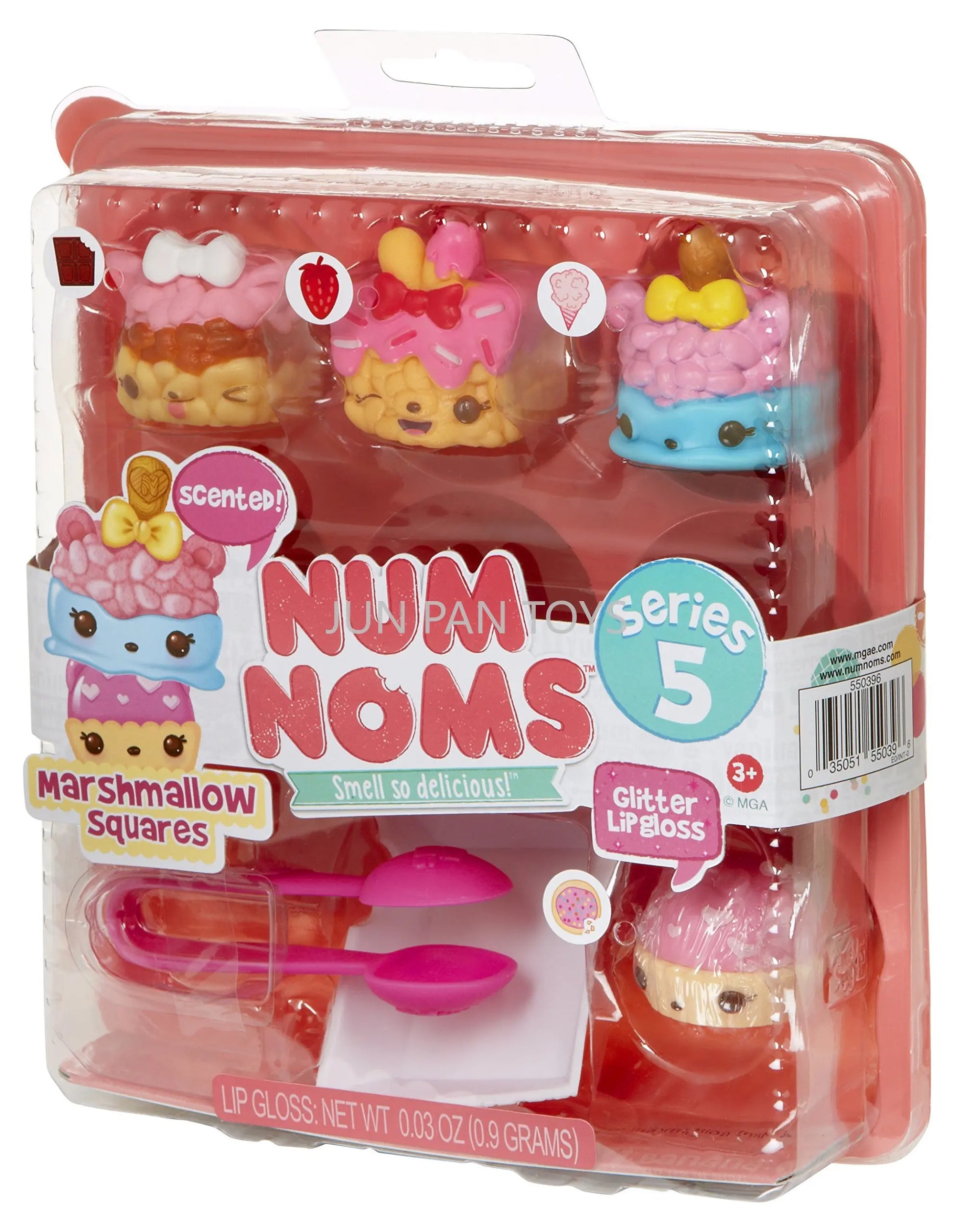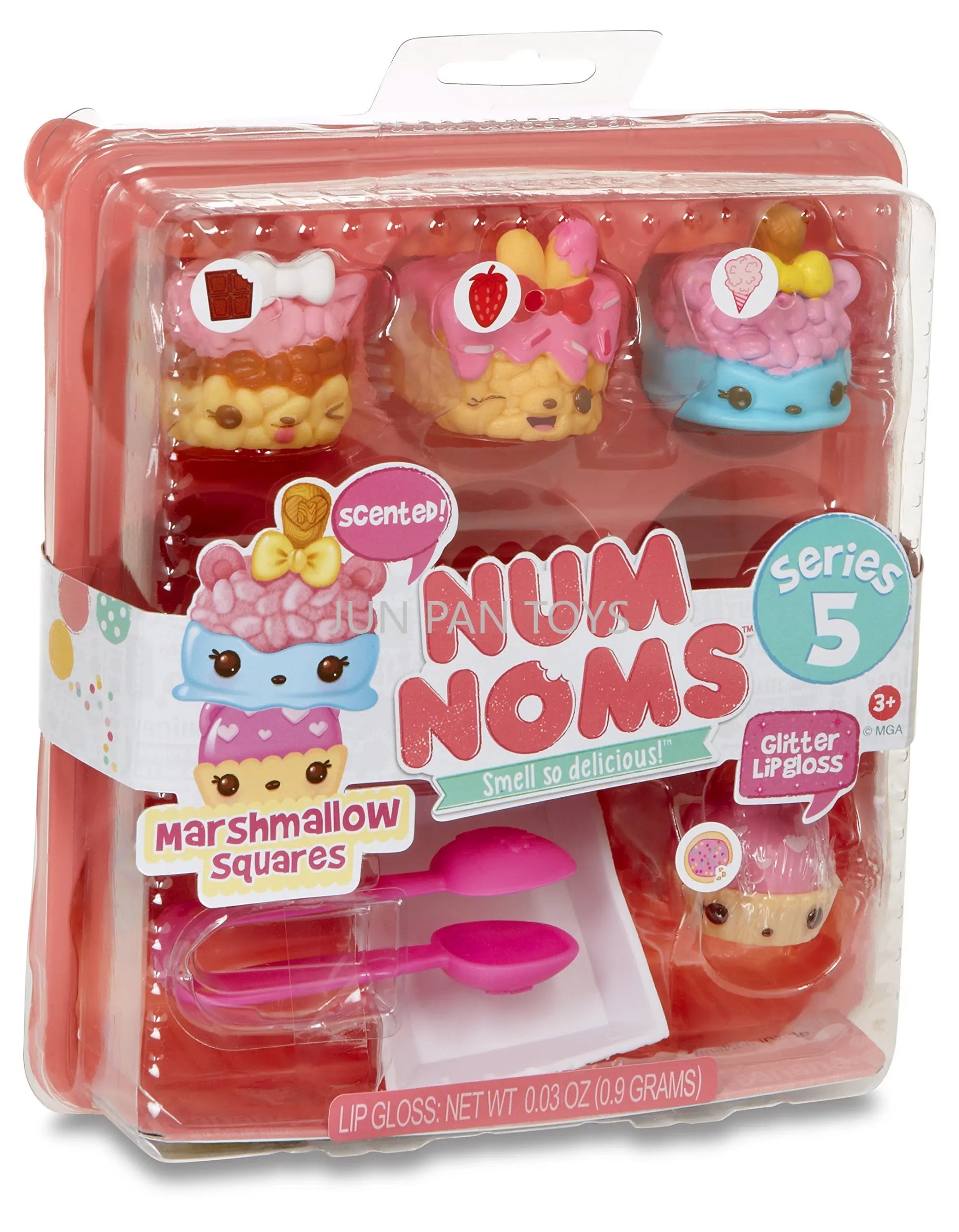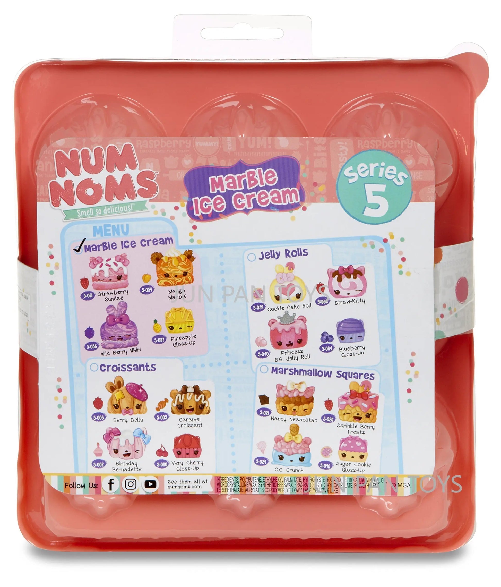 The Num Noms Smell So Delicious Starter Pack Series 5 Toy includes three scented Nums: Nancy Neapolitan, sprinkle berry treats, and C.C. Crunch. Each food Package is packaged together in a themed meal inside an egg carton to-go box, and comes with one flavored glitter lip gloss Nom: sugar cookie gloss-up, tongs, and food tray accessories. Additionally, a collector's menu is included for a complete set. Look out for special edition Num Noms to add to your collection.