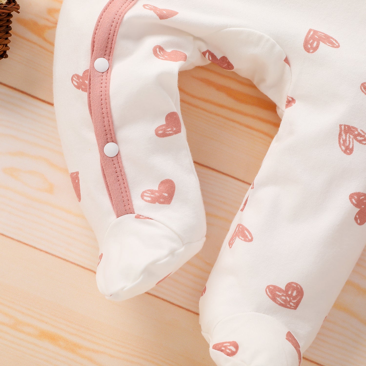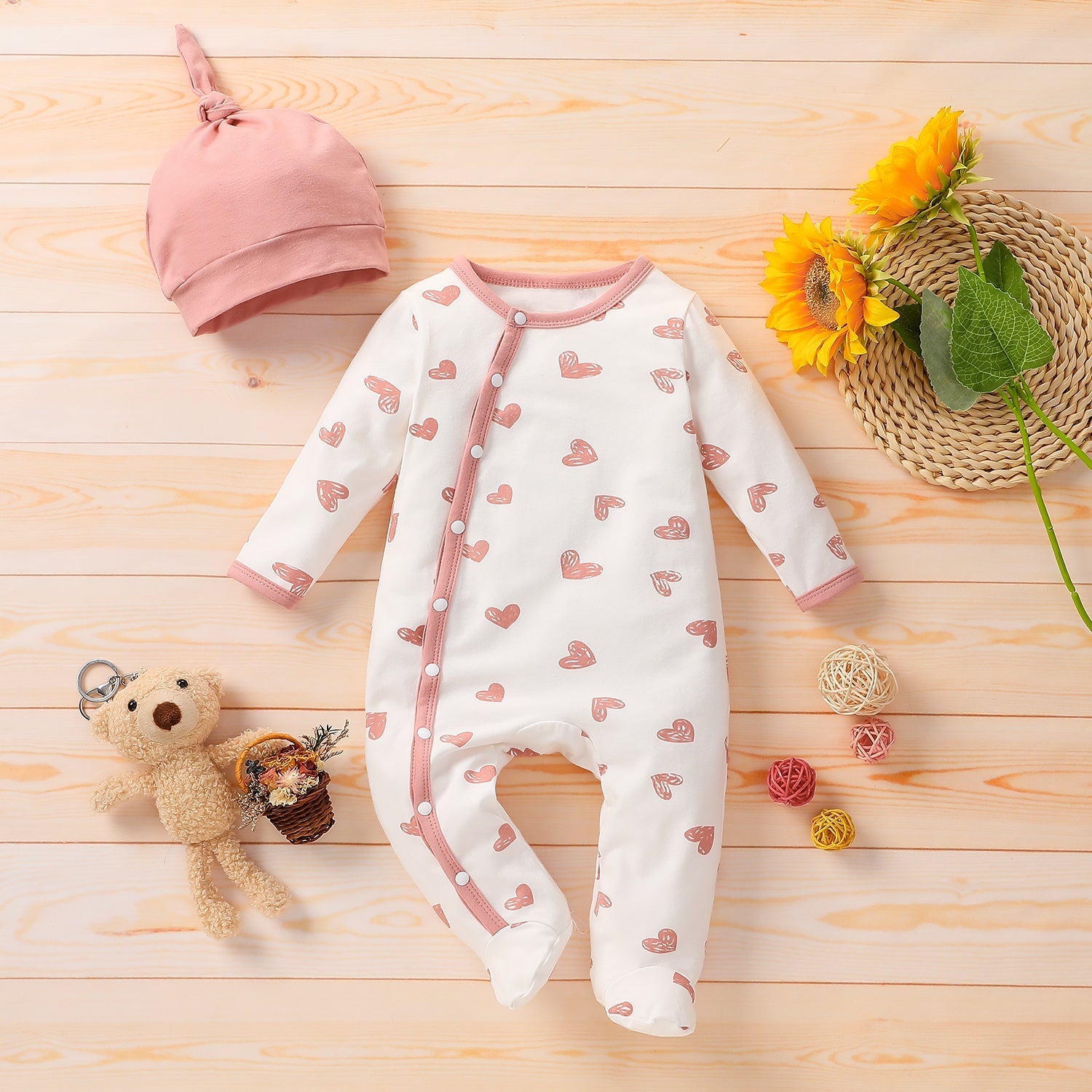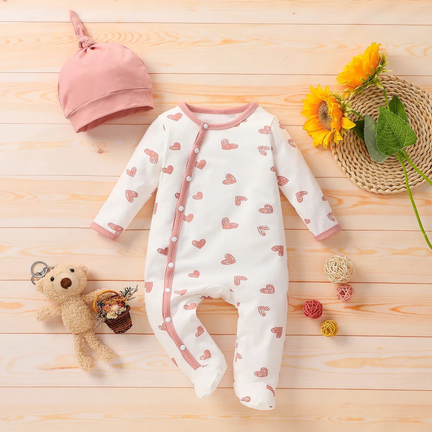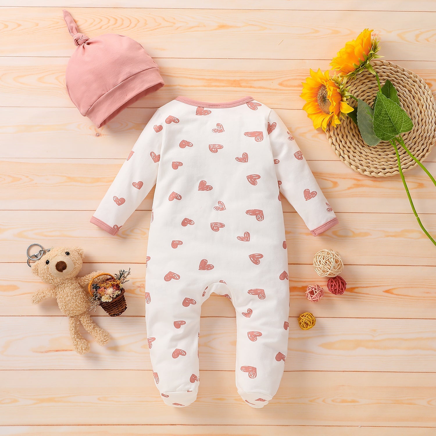 Baby Girls Cotton Long-sleeve Love Heart Print Footed Jumpsuit with Hat Set (Age 3M-18M)