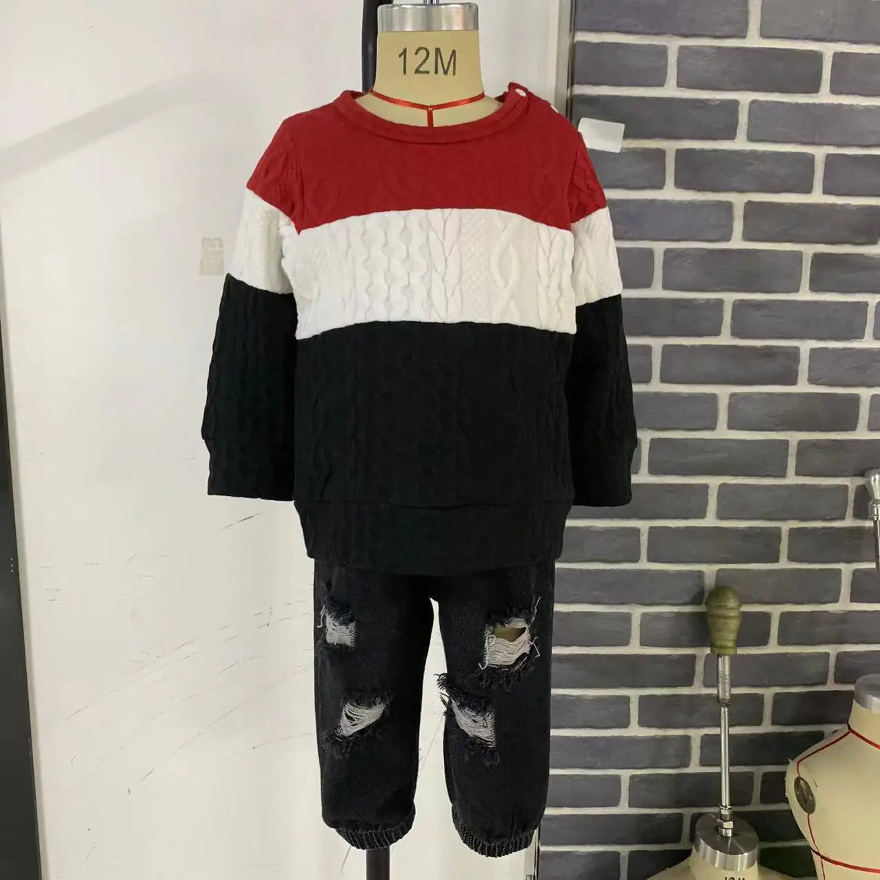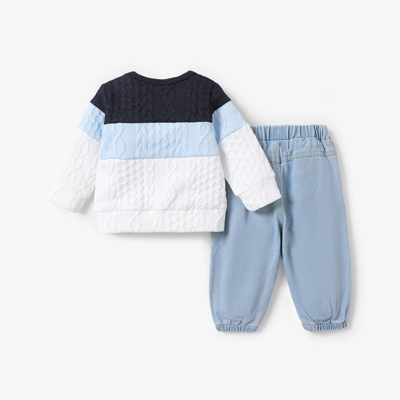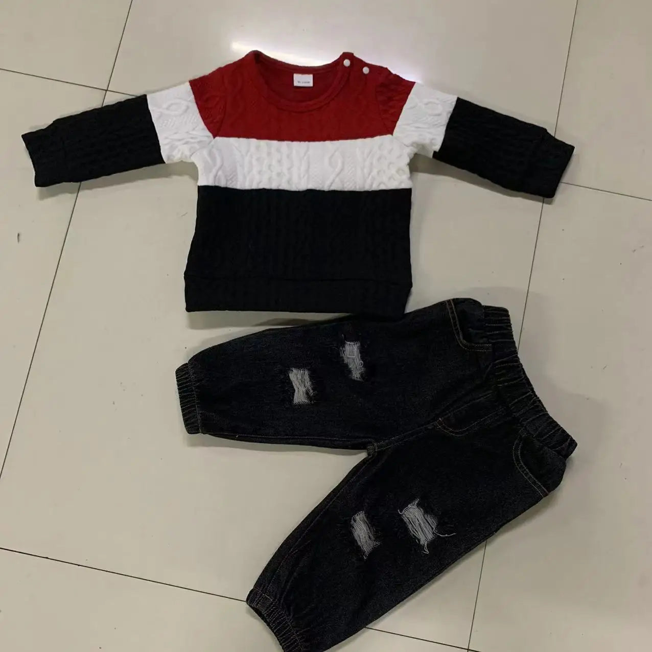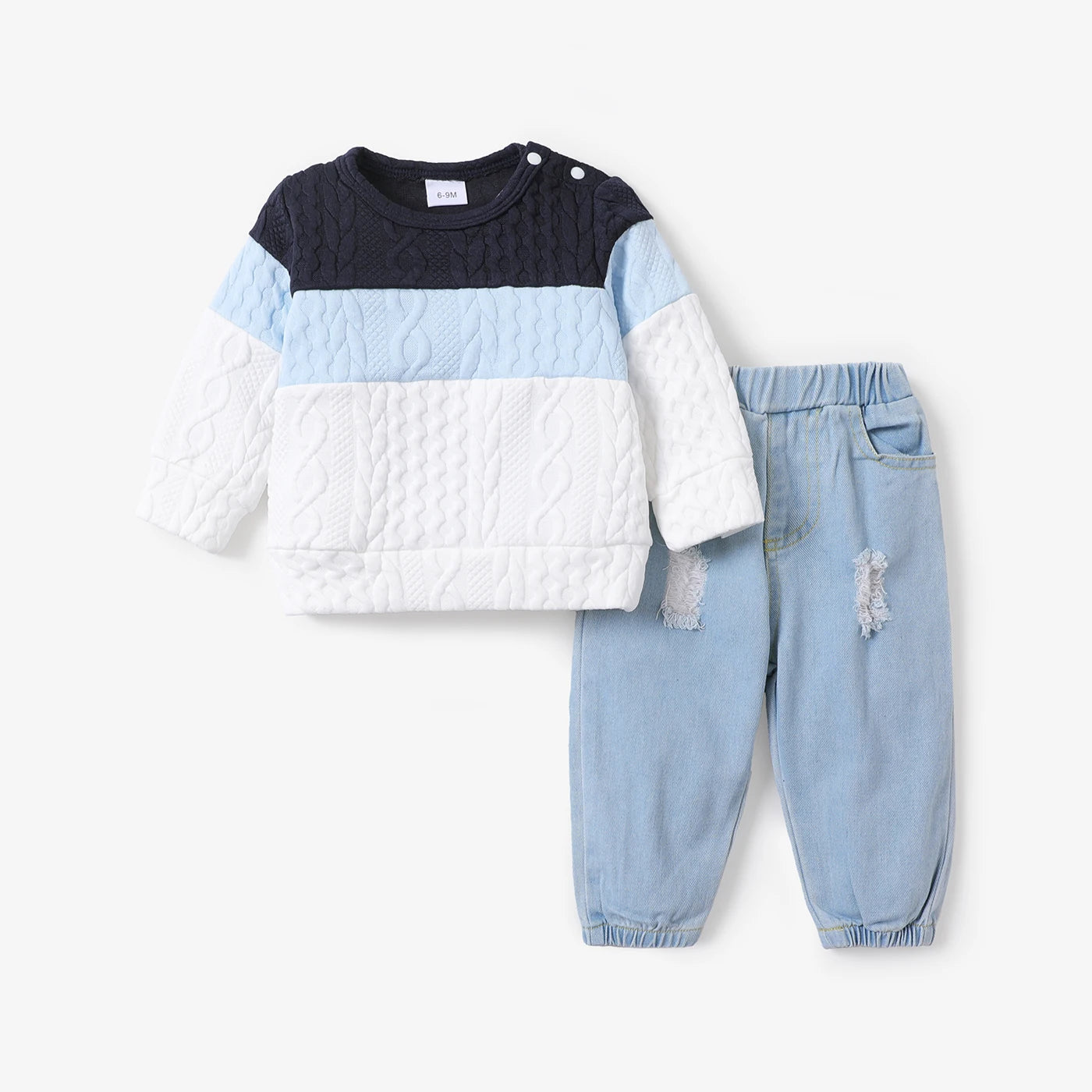 Introducing our Baby Boys Jumper & Ripped Jeans Set! Each size comes with a soft and comfy sweatshirt and elasticized waist jeans featuring a pockets design. The sweatshirt even has convenient shoulder snaps. Made with a blend of polyester and spandex for the sweatshirt and cotton and polyester for the jeans. Machine wash and tumble dry for easy care. Imported for quality you can trust. (Note: this outfit is so cute, it should come with a warning for excessive compliments!)
