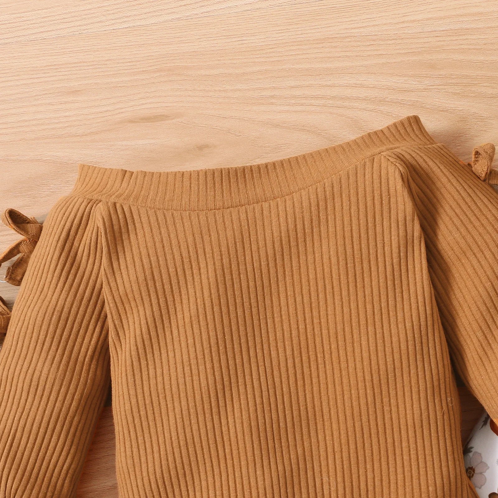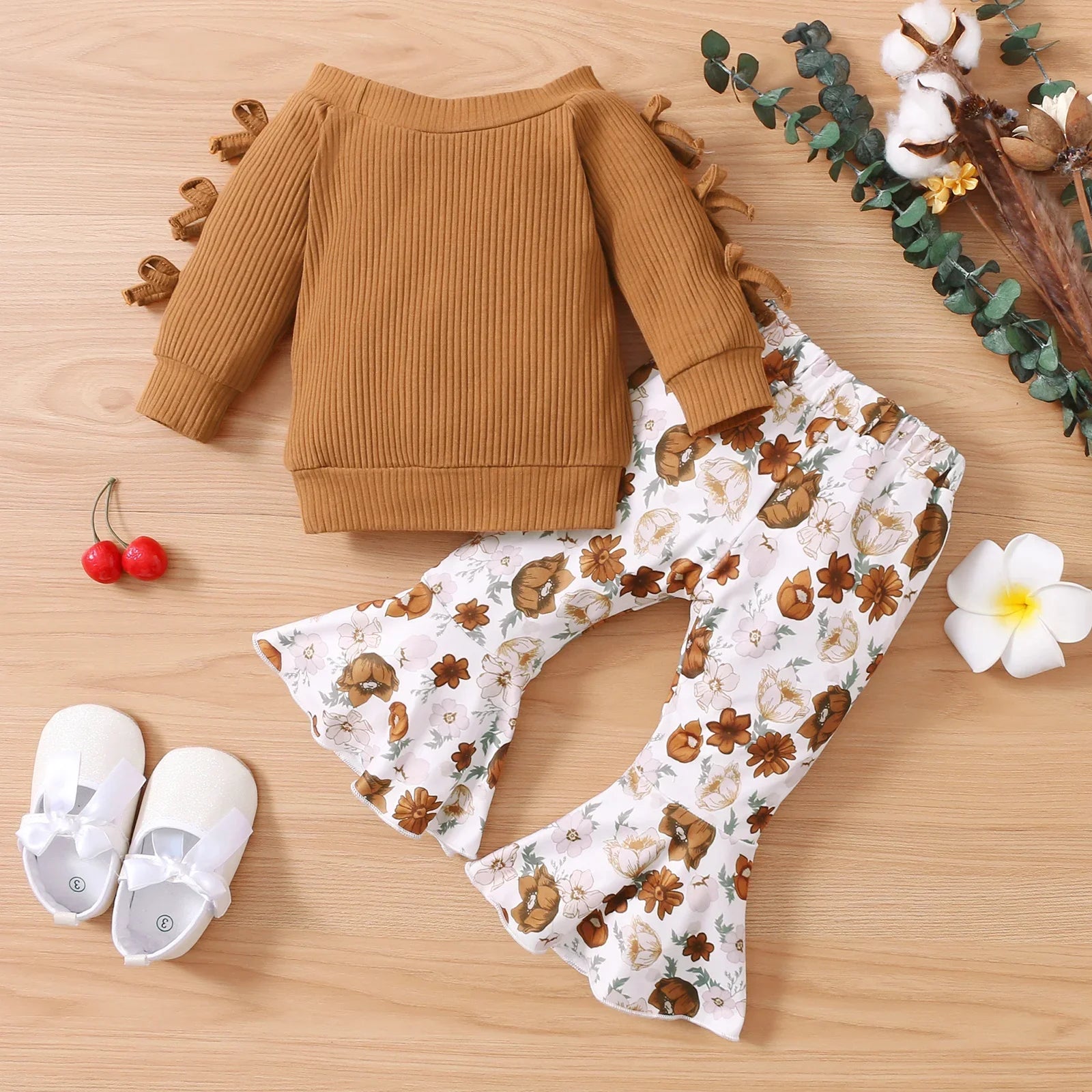 Baby Girls Ribbed Bowknot Long-Sleeve Top and Floral Print Bell Bottom Trousers (Age 3-24M)