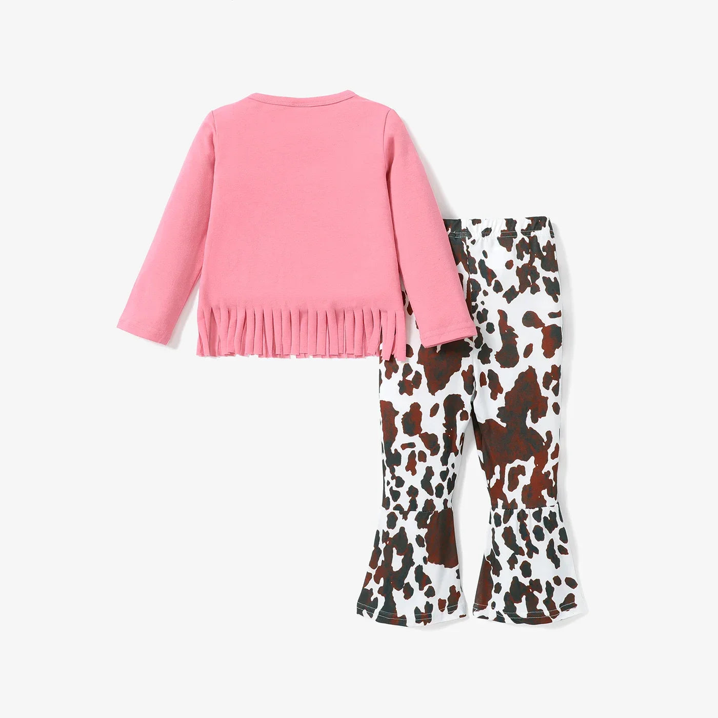 Add a playful touch to your little one's wardrobe with our Girls Pink Cowgirl Top & Trousers Set! Made with a soft and comfy blend of polyester, cotton, and spandex, this set features a cute cow pattern and avant-garde horn edge design. Perfect for autumn outings and everyday wear. Available in sizes 2-6 years old.