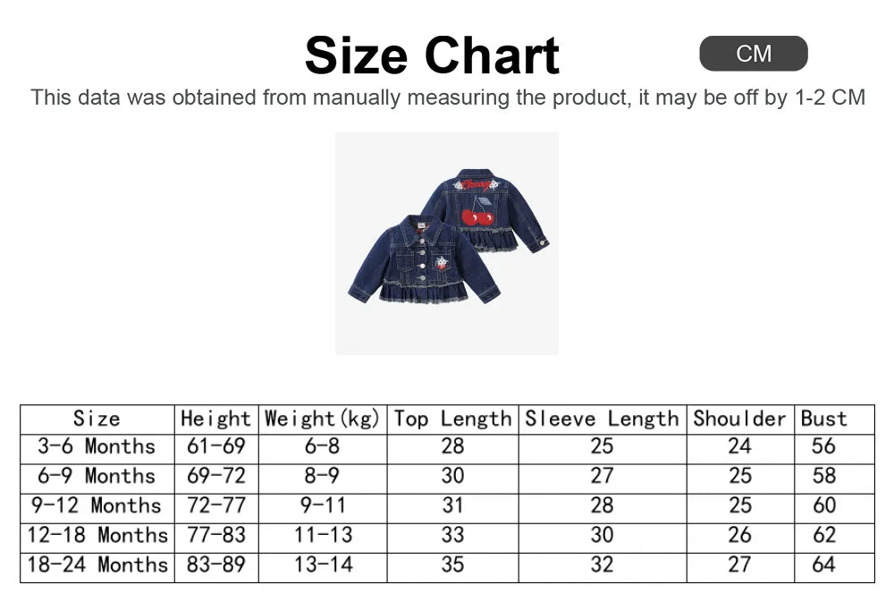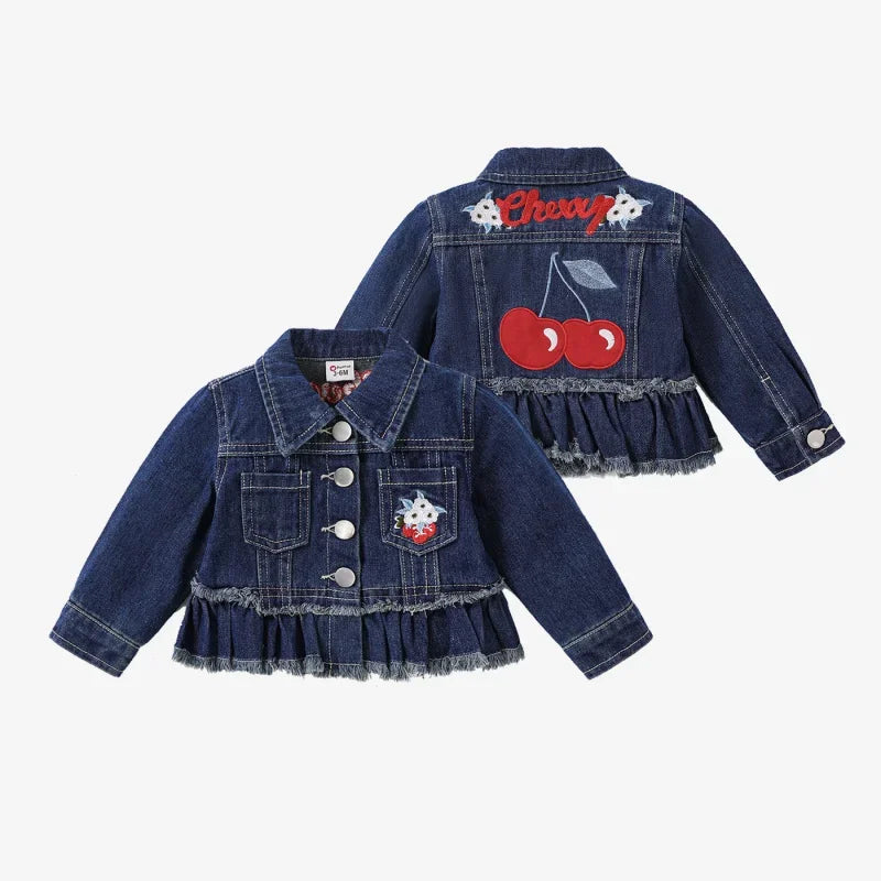 Get ready for cuteness overload with our Baby Girl Cherry Denim Jacket! Made with soft and breathable fabric, this jacket is gentle on delicate skin and perfect for any season or occasion. Its classic design and loose fit provide maximum comfort, while the high-quality fabric ensures long-lasting use. Machine washable for easy cleaning, this jacket is a must-have for any parent. Designed with love for your precious baby.
