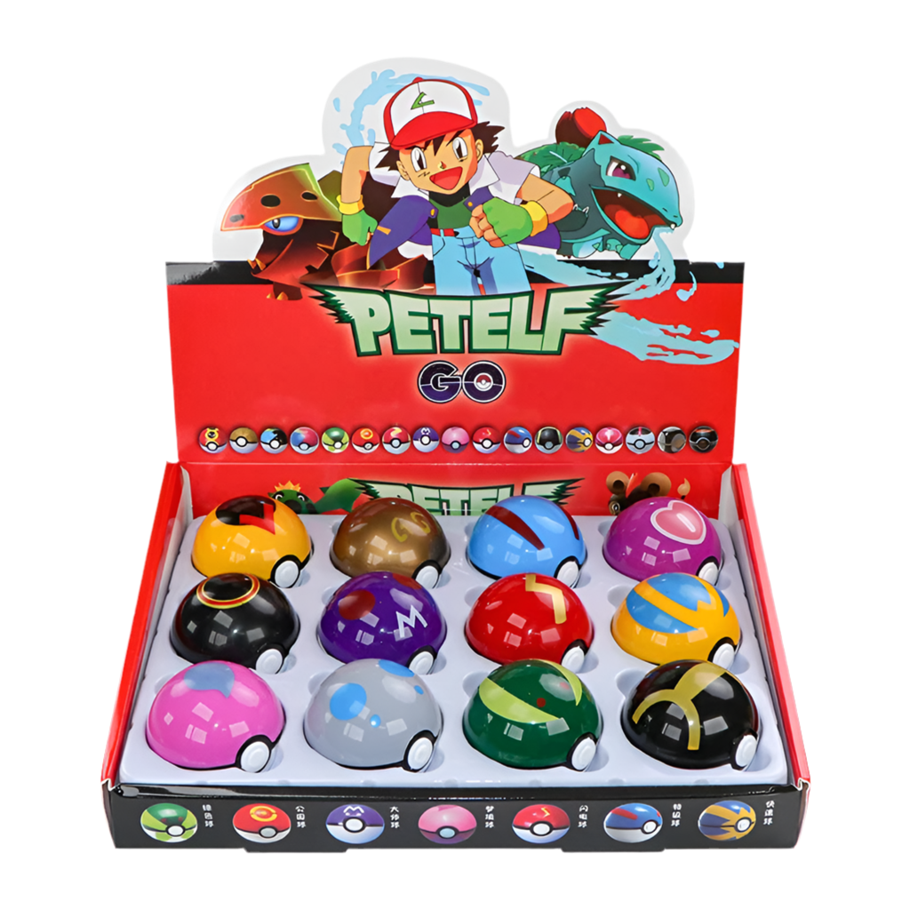 The Petelf GO Poké Ball Toys – Pokémon 12 Pack is a collectible set inspired by Pokémon GO, featuring 12 unique Pokémon figures paired with matching Poké Balls. Each figure fits inside its ball, ready for display, pretend battles, or gifting.