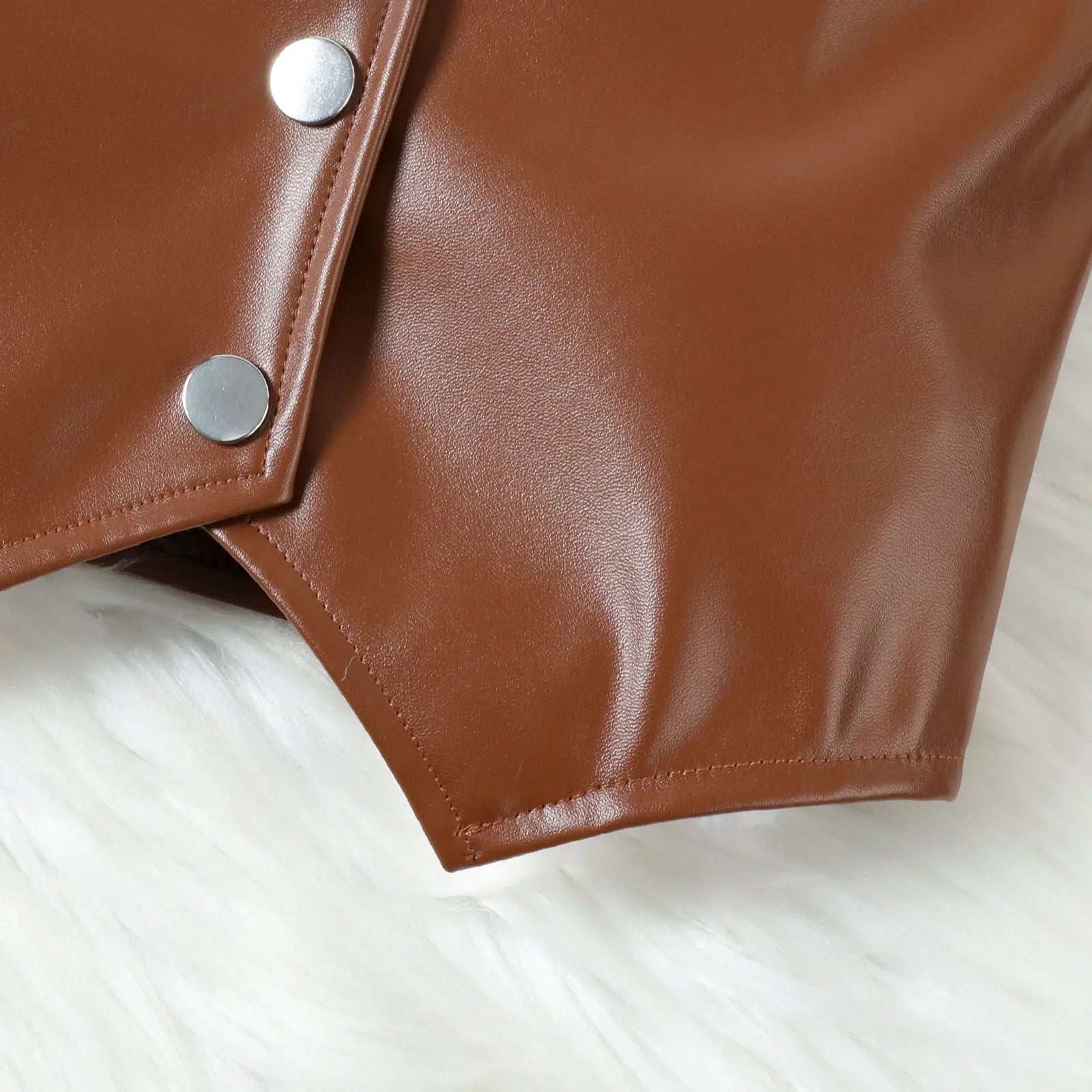 Made with premium faux leather that is hypoallergenic and breathable, ensuring a comfortable and irritation-free wear for your baby's delicate skin. The sleeveless v-neck vest features an irregular hem and a single-breasted button design, adding a stylish touch to the overall look. Paired with an elastic waistband and pleated skirt, this set can be easily matched with a variety of accessories such as sandals, shoes, a crossbody bag, a straw hat, and sunglasses. A perfect gift for your daughter on Children's Day, this toddler girls set will make her look cute and charming. It is suitable for various occasions, including casual wear, gatherings, vacations, school, travel, beach trips, weddings, parties, and even photography.