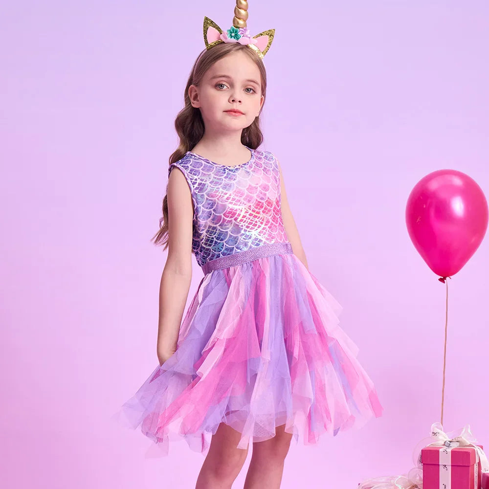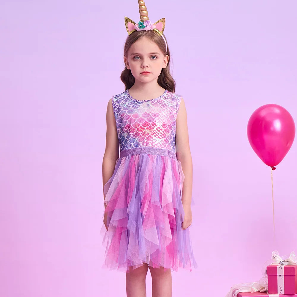 Girls Pink Mermaid Print Ruffle Tulle Dress (Age 3-12YRS)