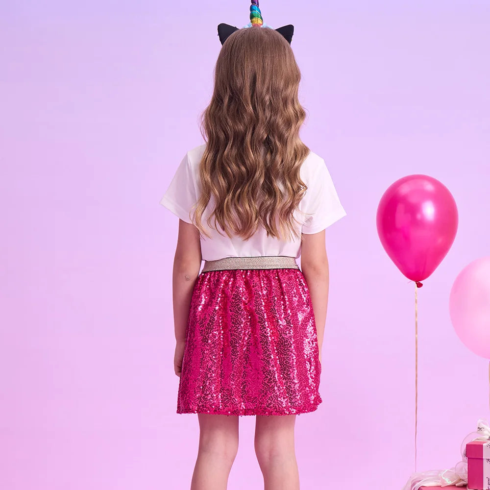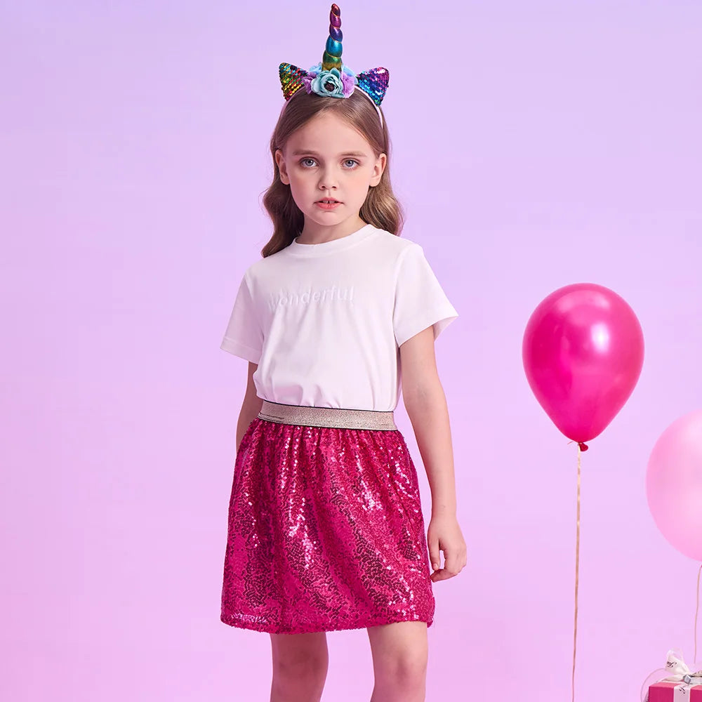 This Girls Pink Sequin Skirt will be your little one's new fav! Made from soft cotton, stretchy spandex, and polyethersulfone for ultimate comfort and movement. Perfect for ages 3-10YRS. It's all about style and comfort for the coolest kids on the block!